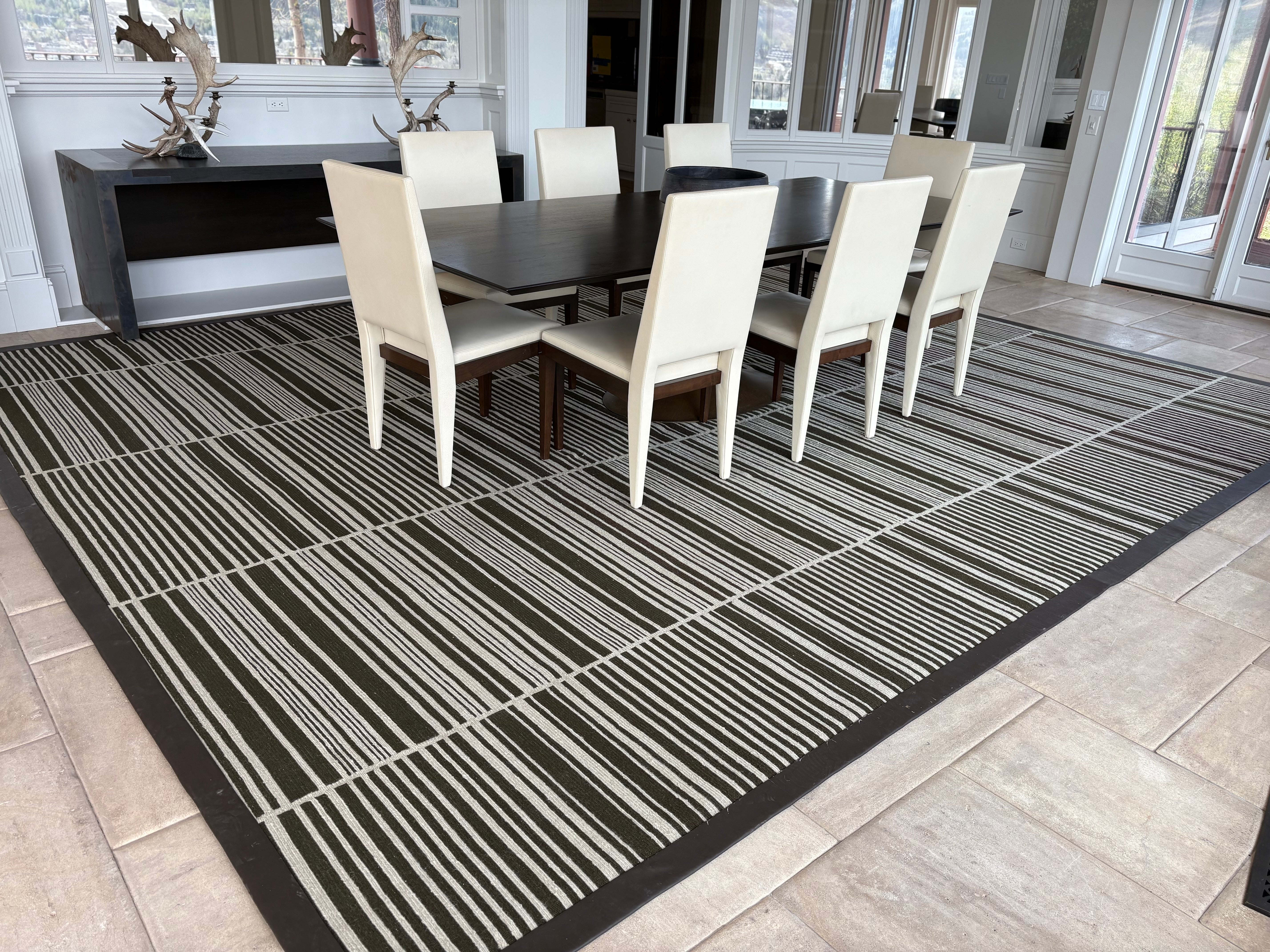 Custom Flat Weave Area Rug 100% Wool, Brown, Ivory and a Slight Green Stripe. For more images, view in store showroom.