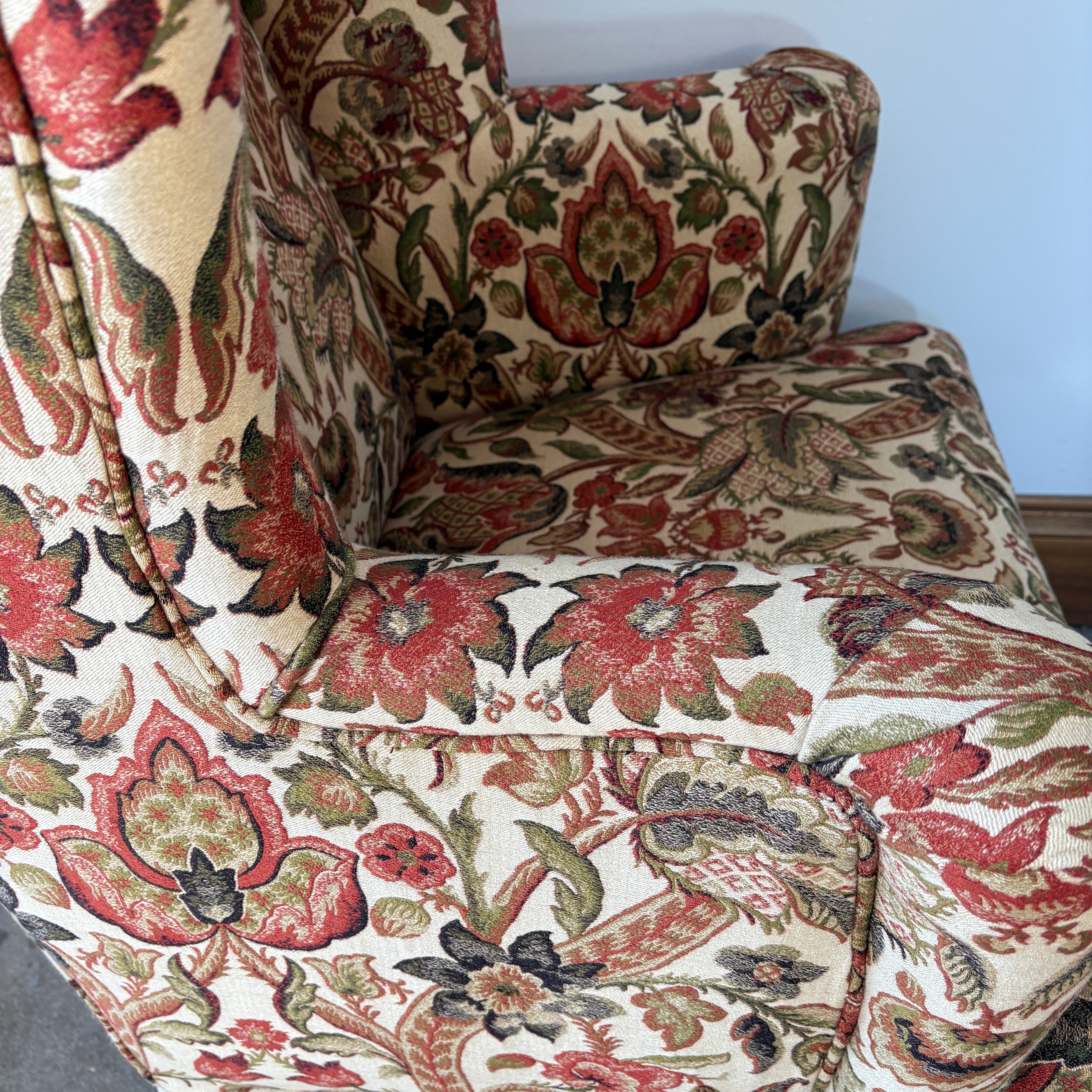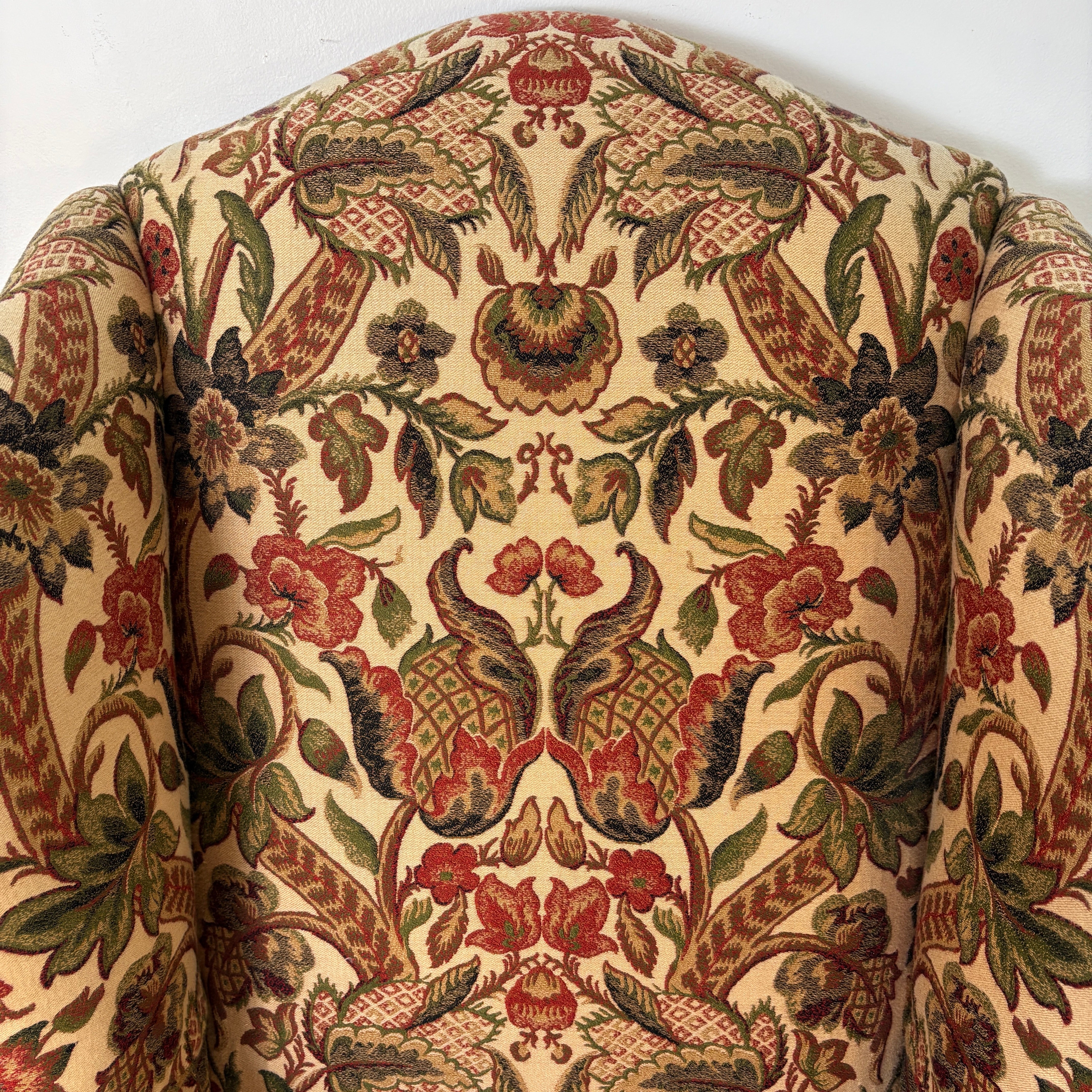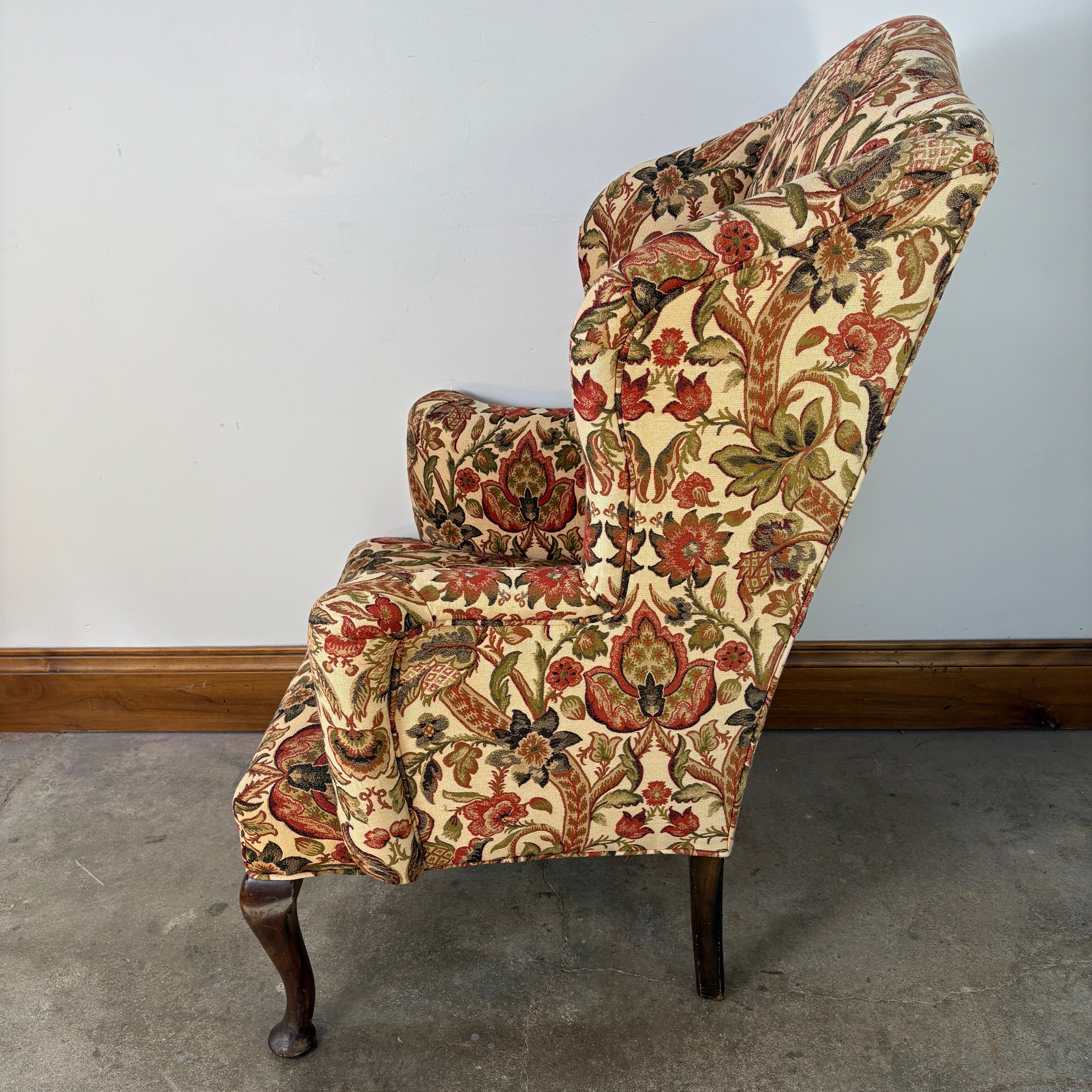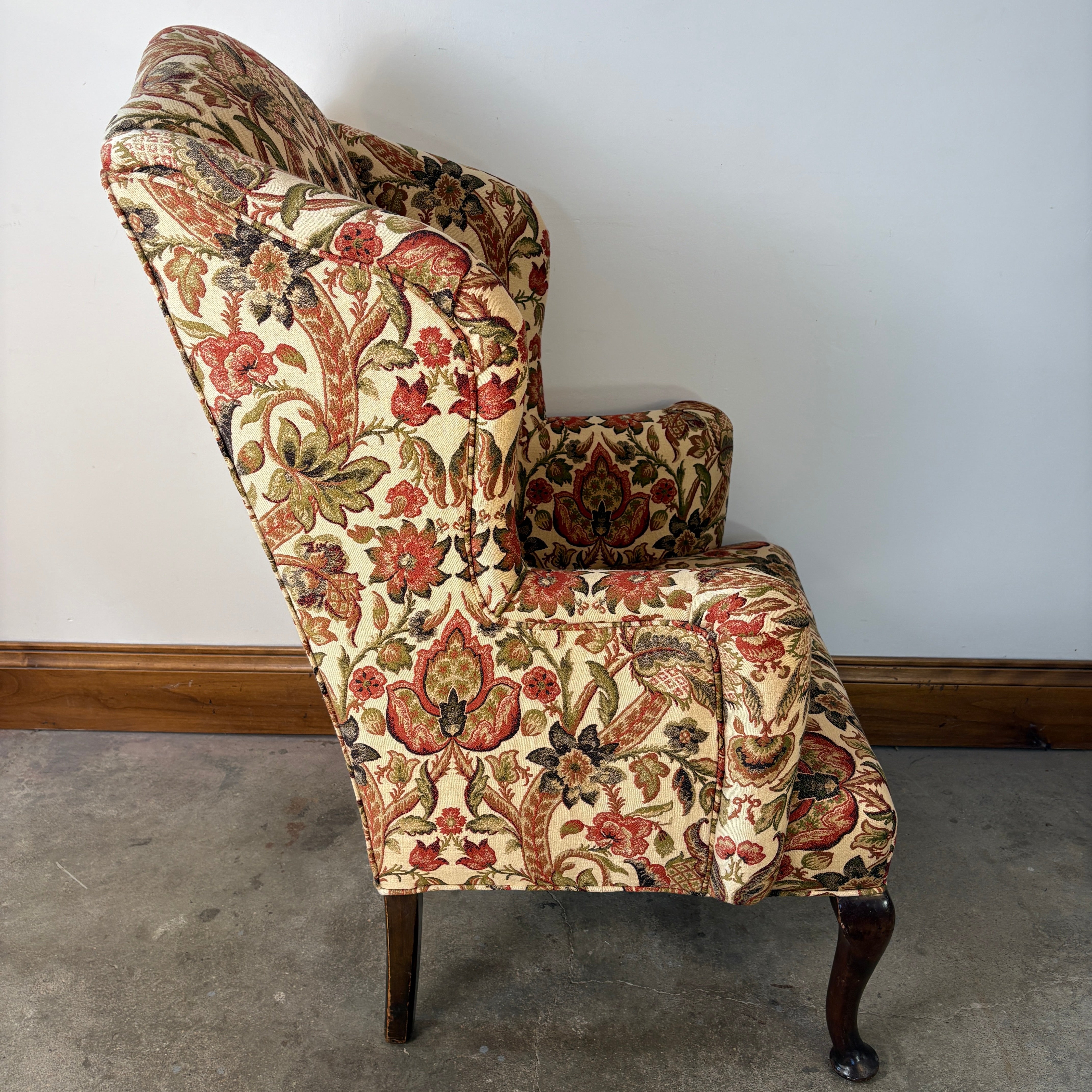 Custom Upholstered Queen Anne Style Wing Chair, Rust and Green Turkish Flower Fabric