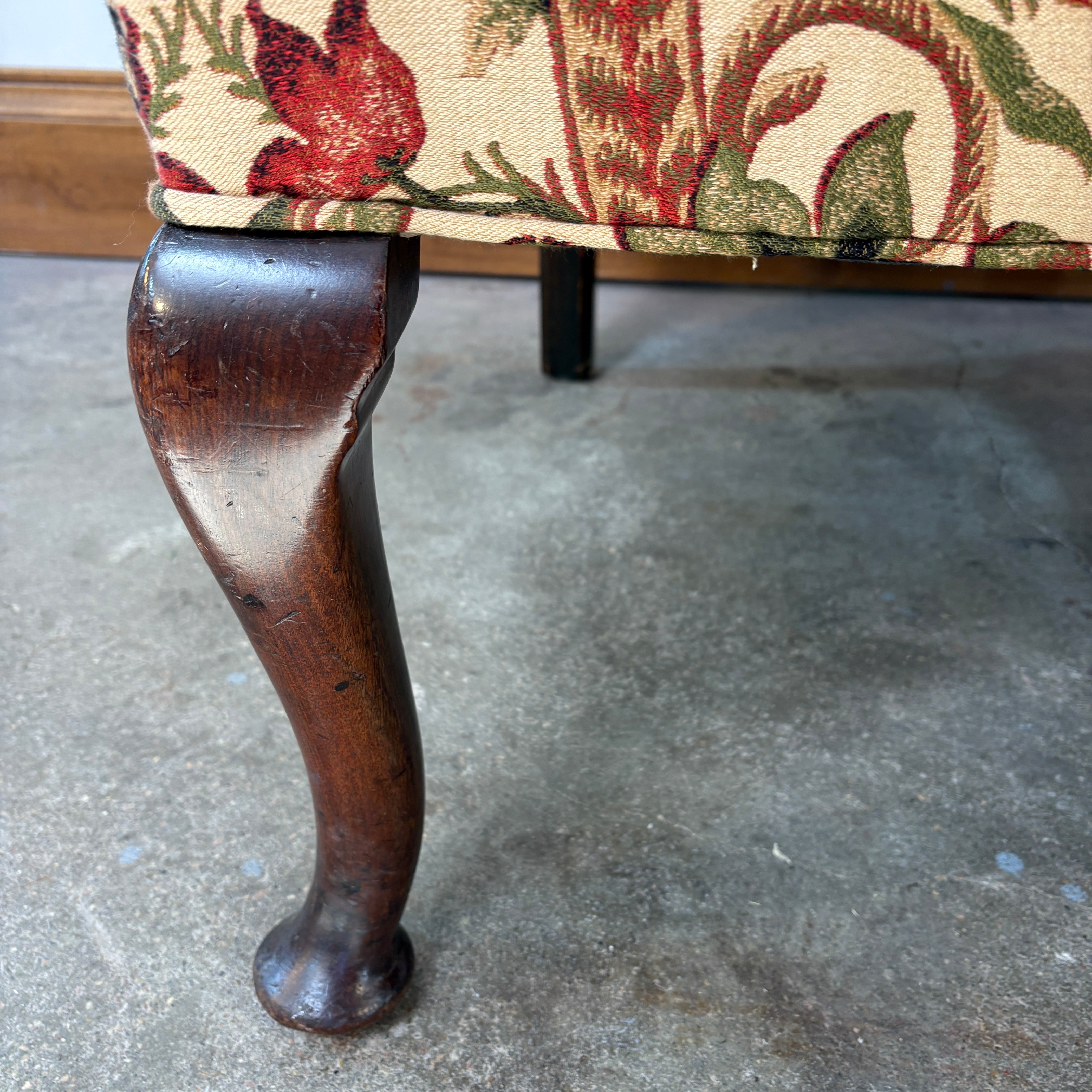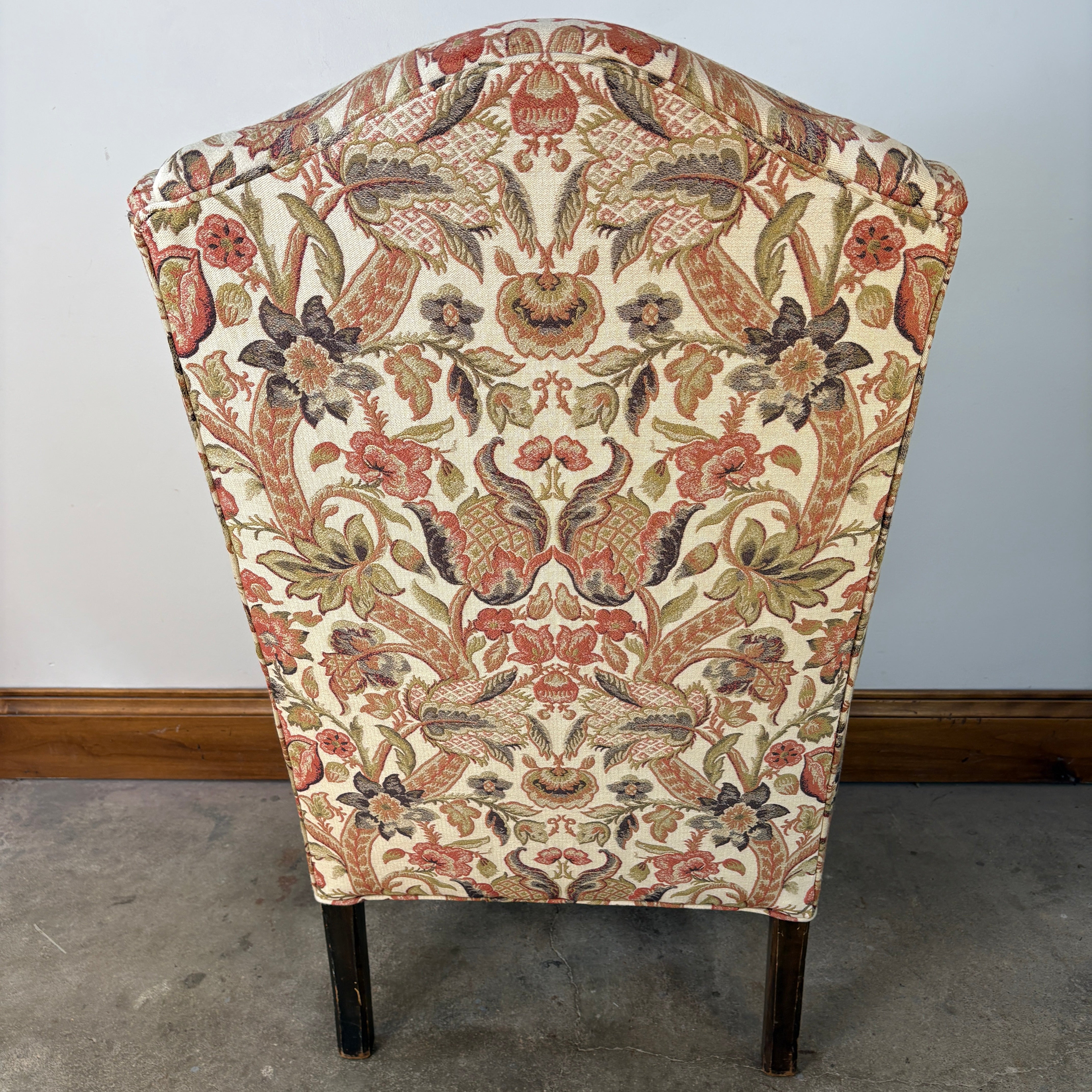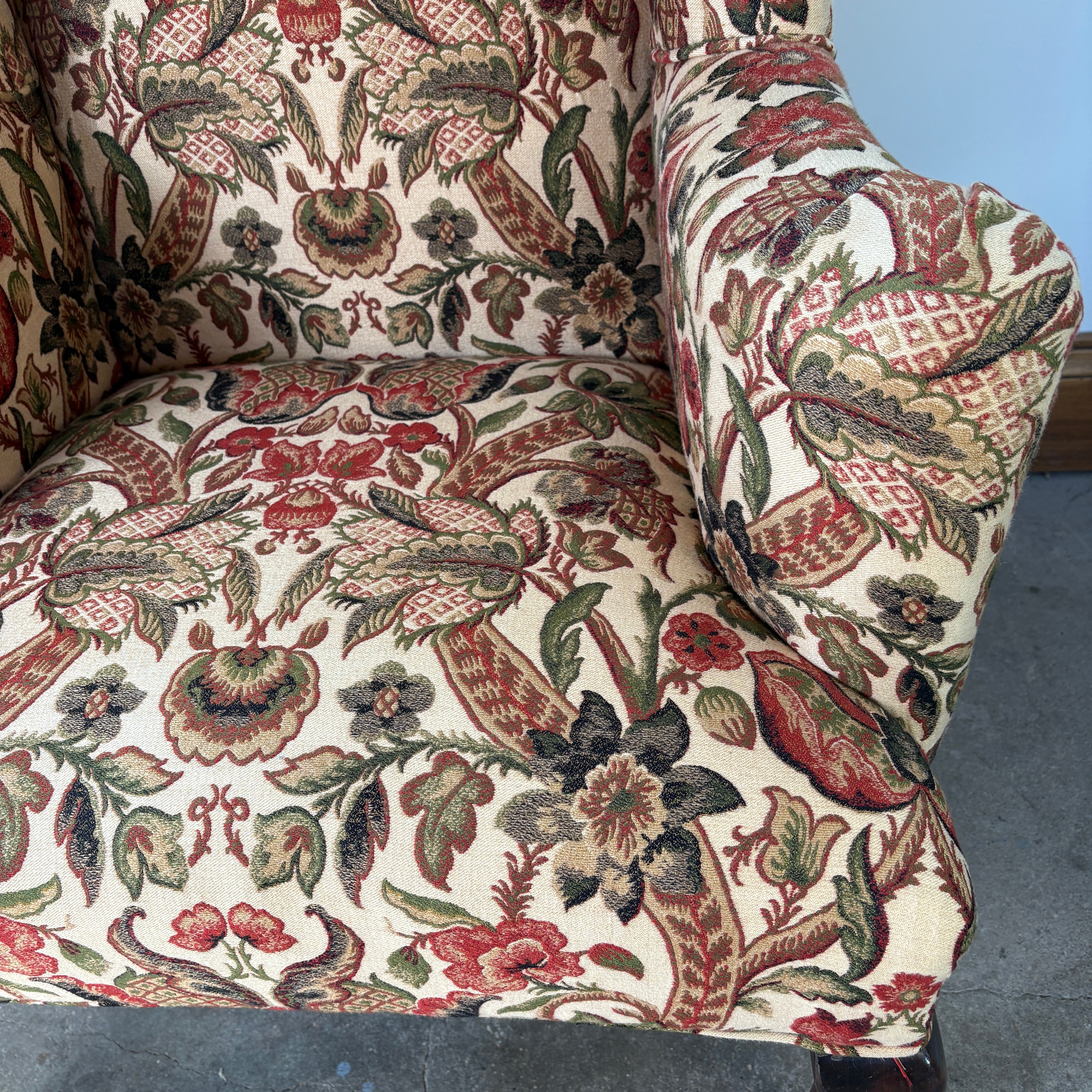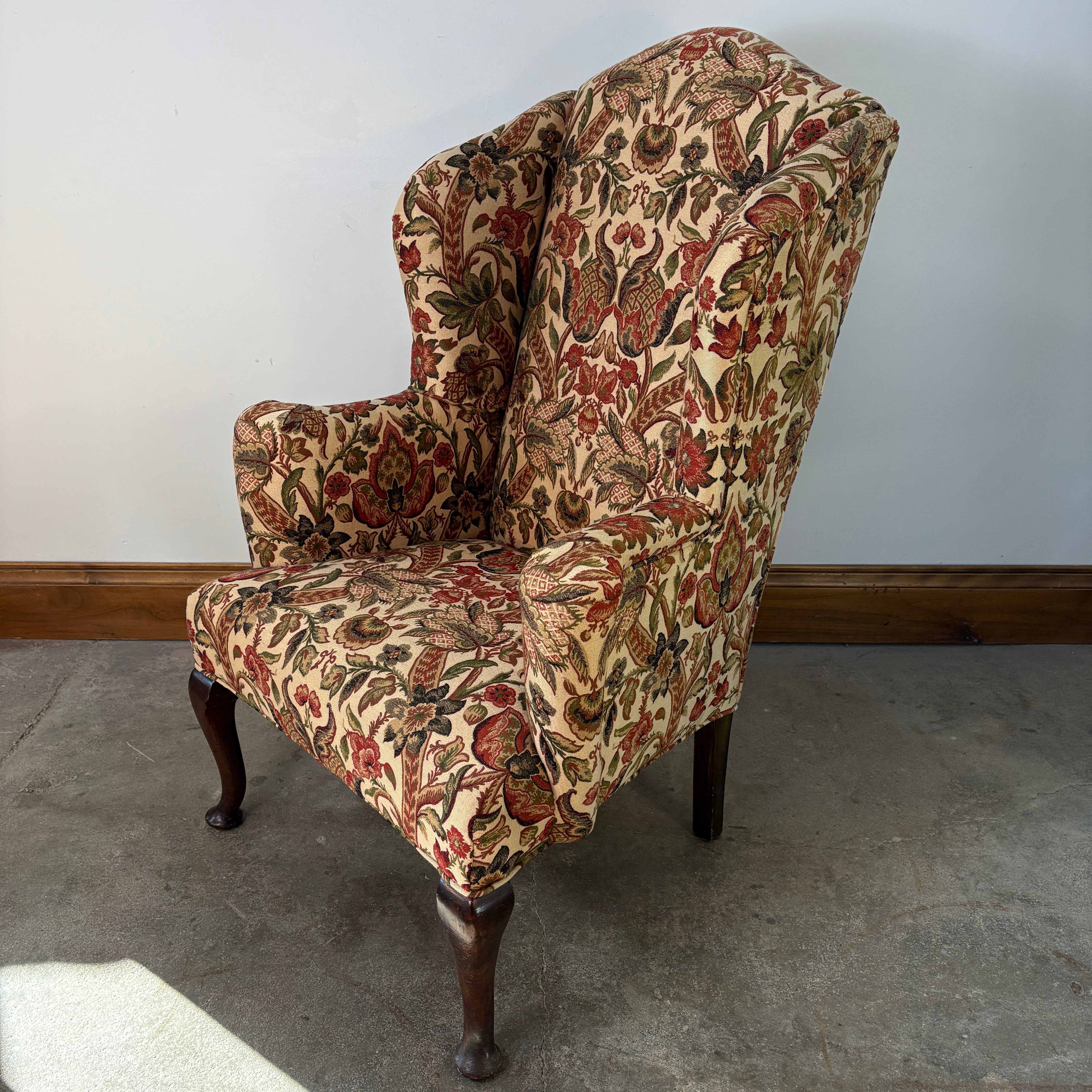 Custom Upholstered Queen Anne Style Wing Chair, Rust and Green Turkish Flower Fabric