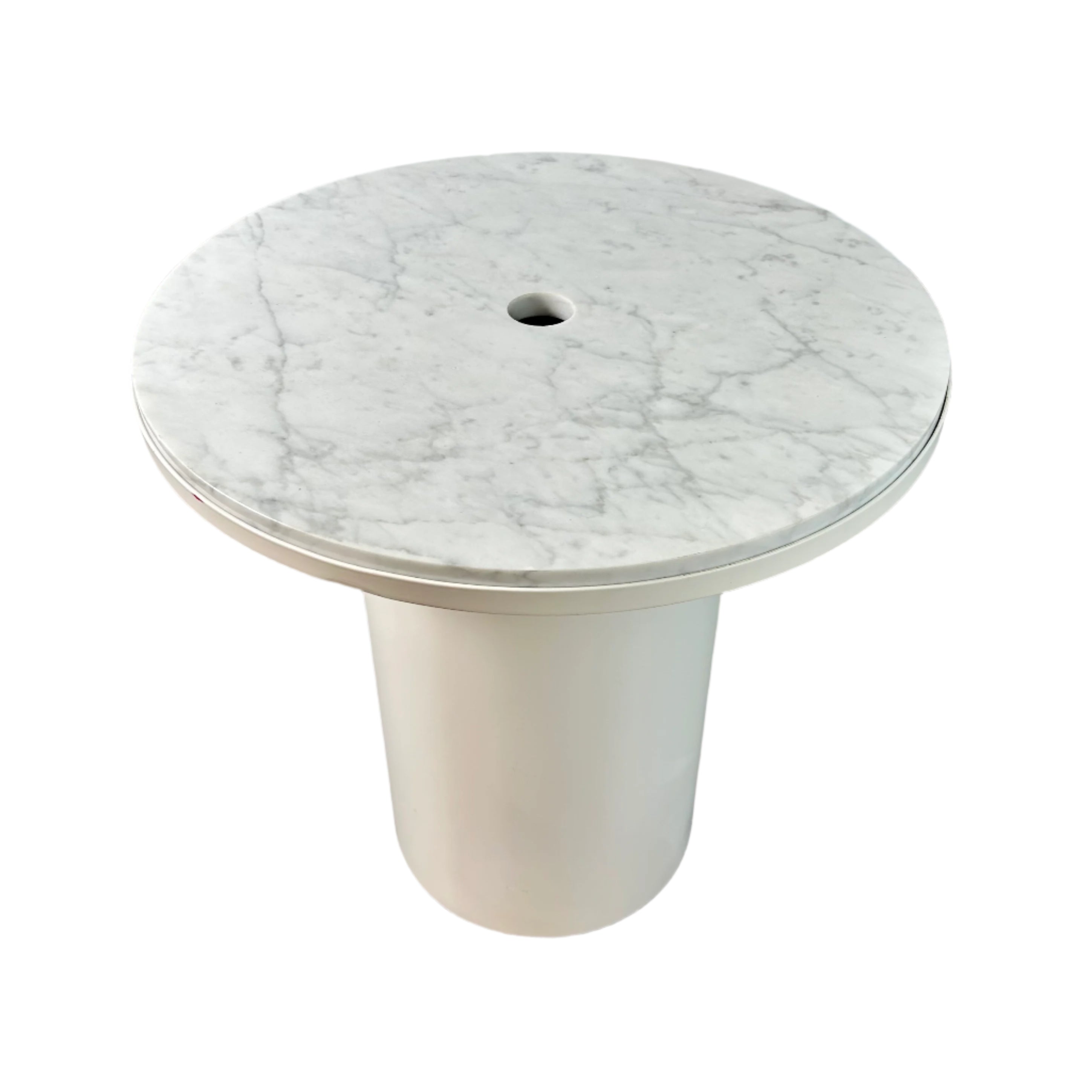 Cylinder small accent table with white metal round base and grey white marble top. There is a finished hole in the center of about 2" in diameter. We do not know its function.