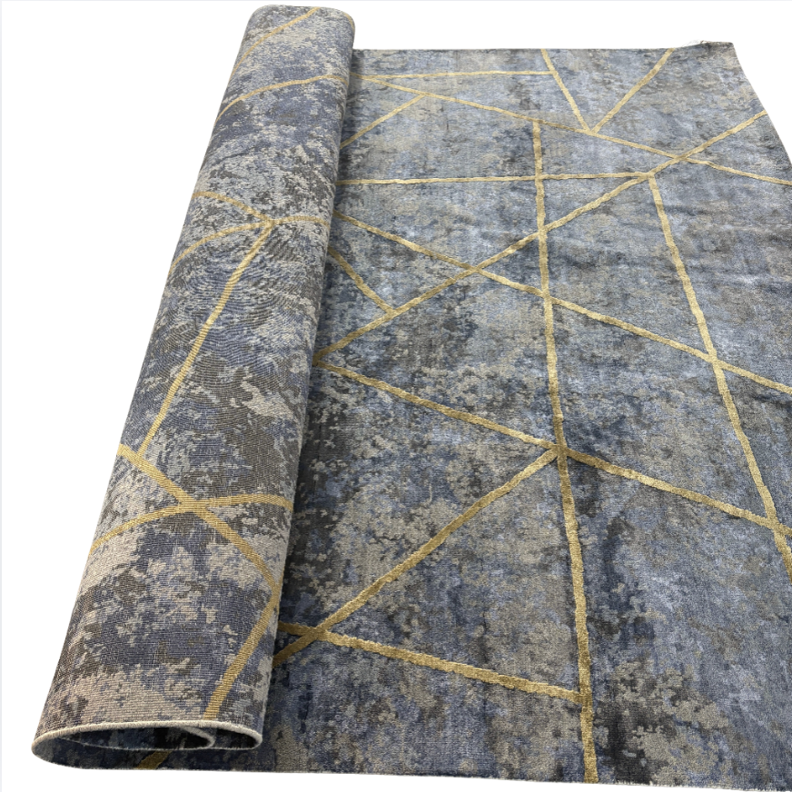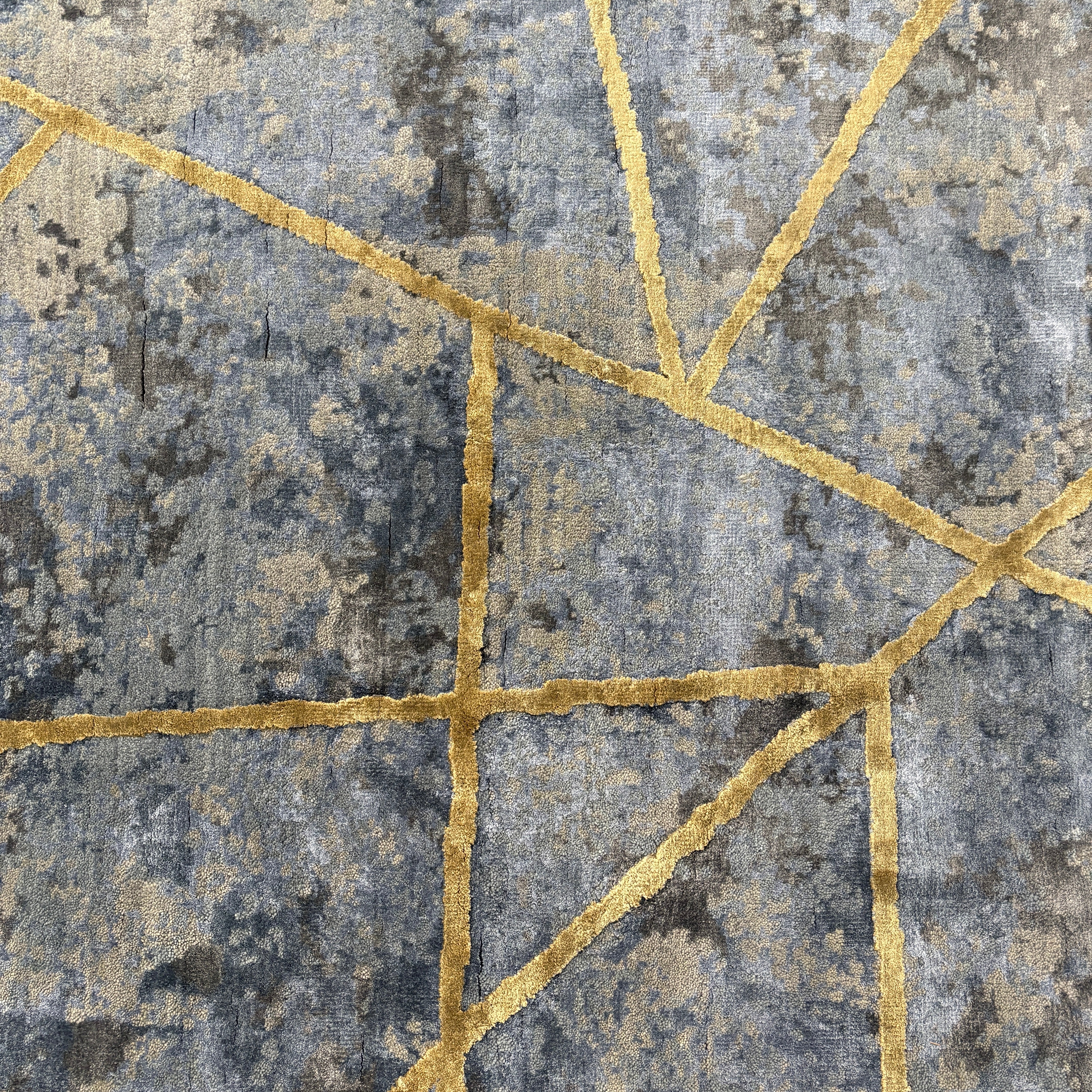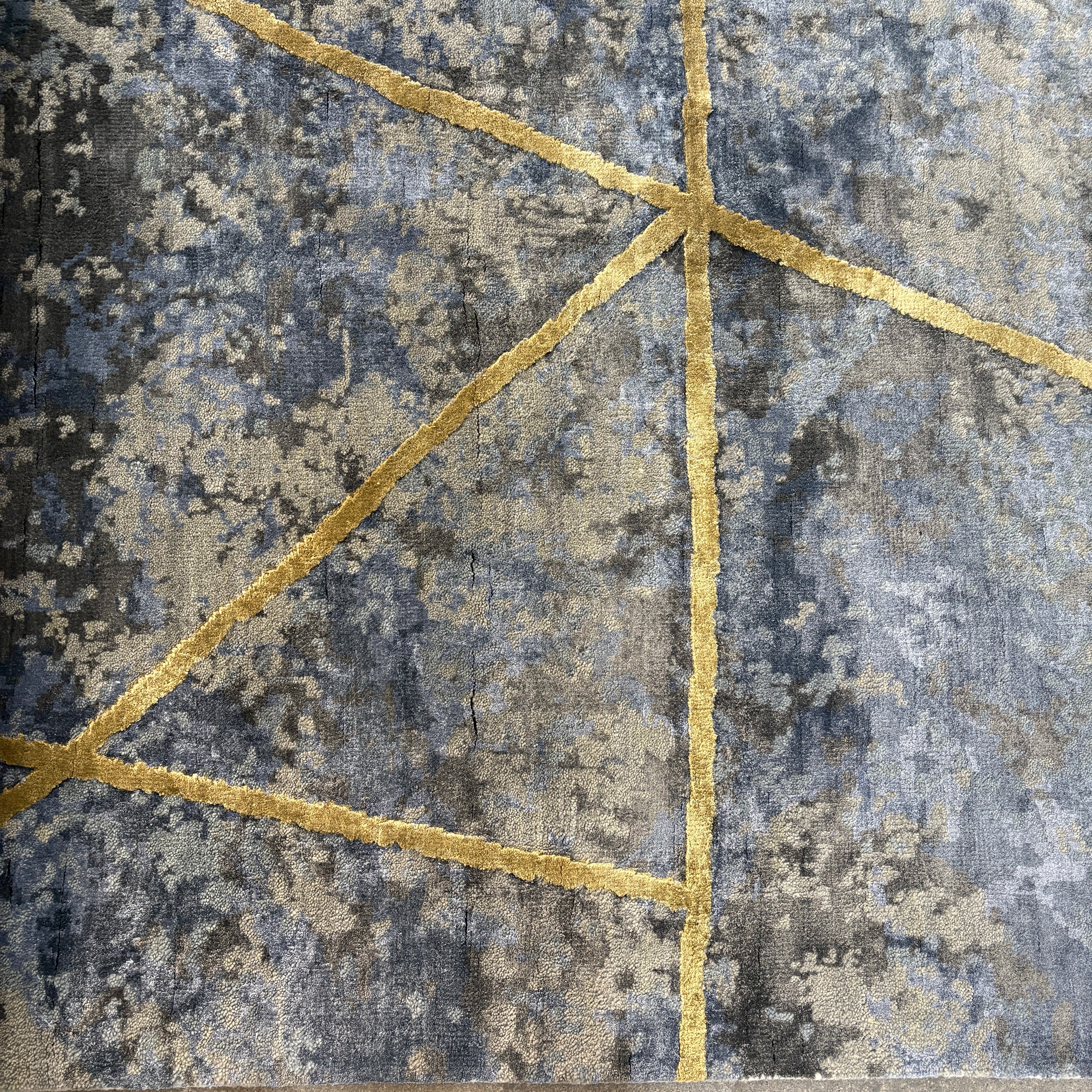Cyrus Rugs, Made in India, Wool and Bamboo Silk Content, Abstract Pattern, Colors: Blue, Grey, Gold.