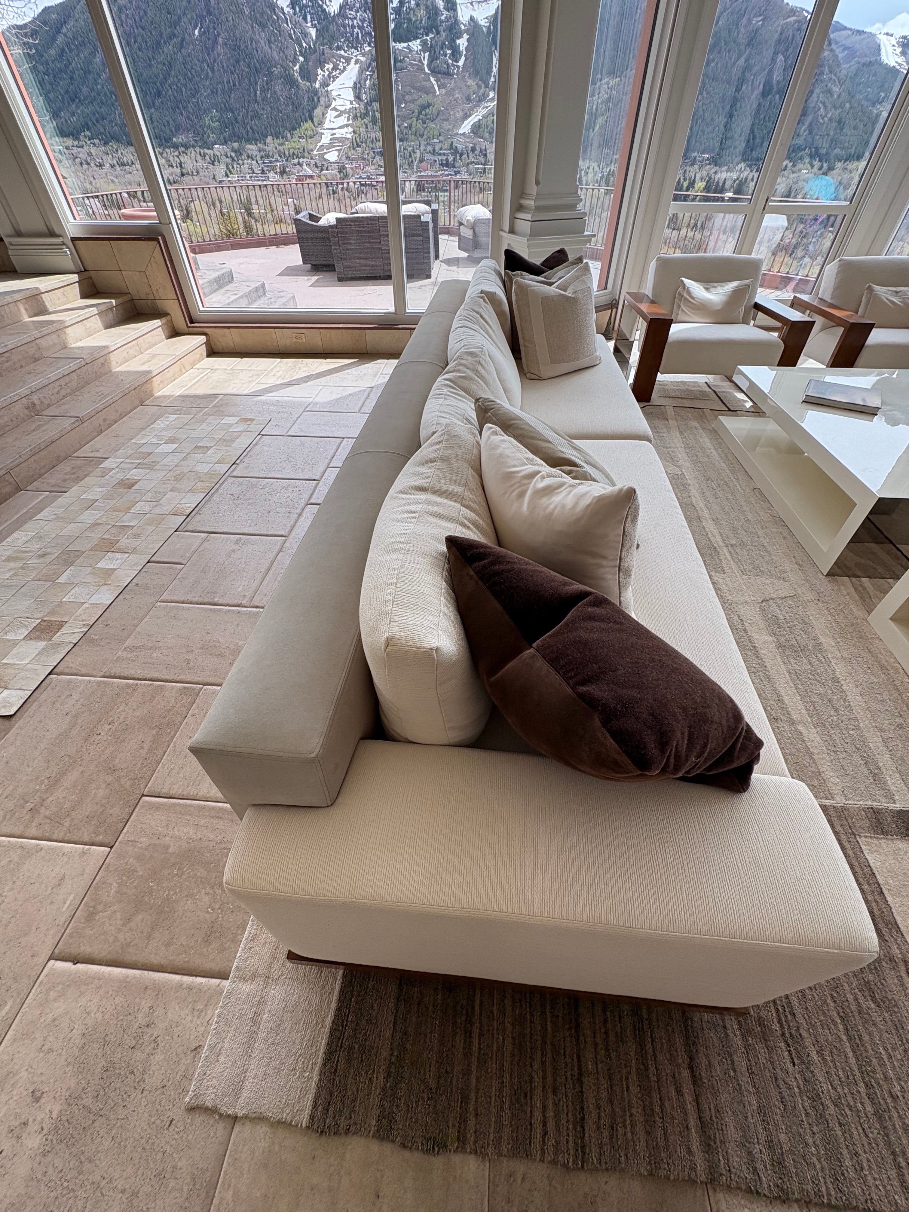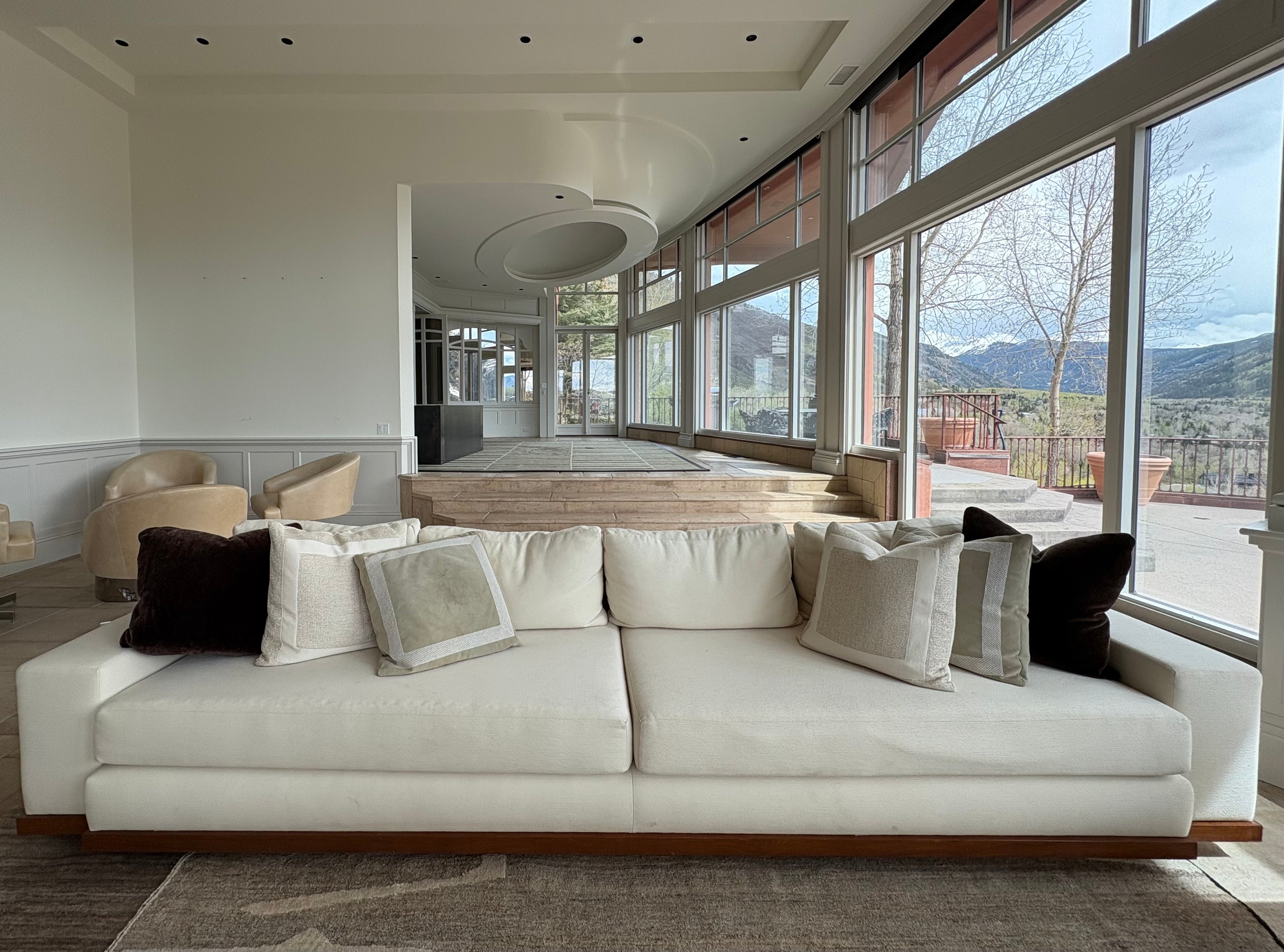White custom upholstered sofa with wood trim, modernist style. Accent pillows sold individually.