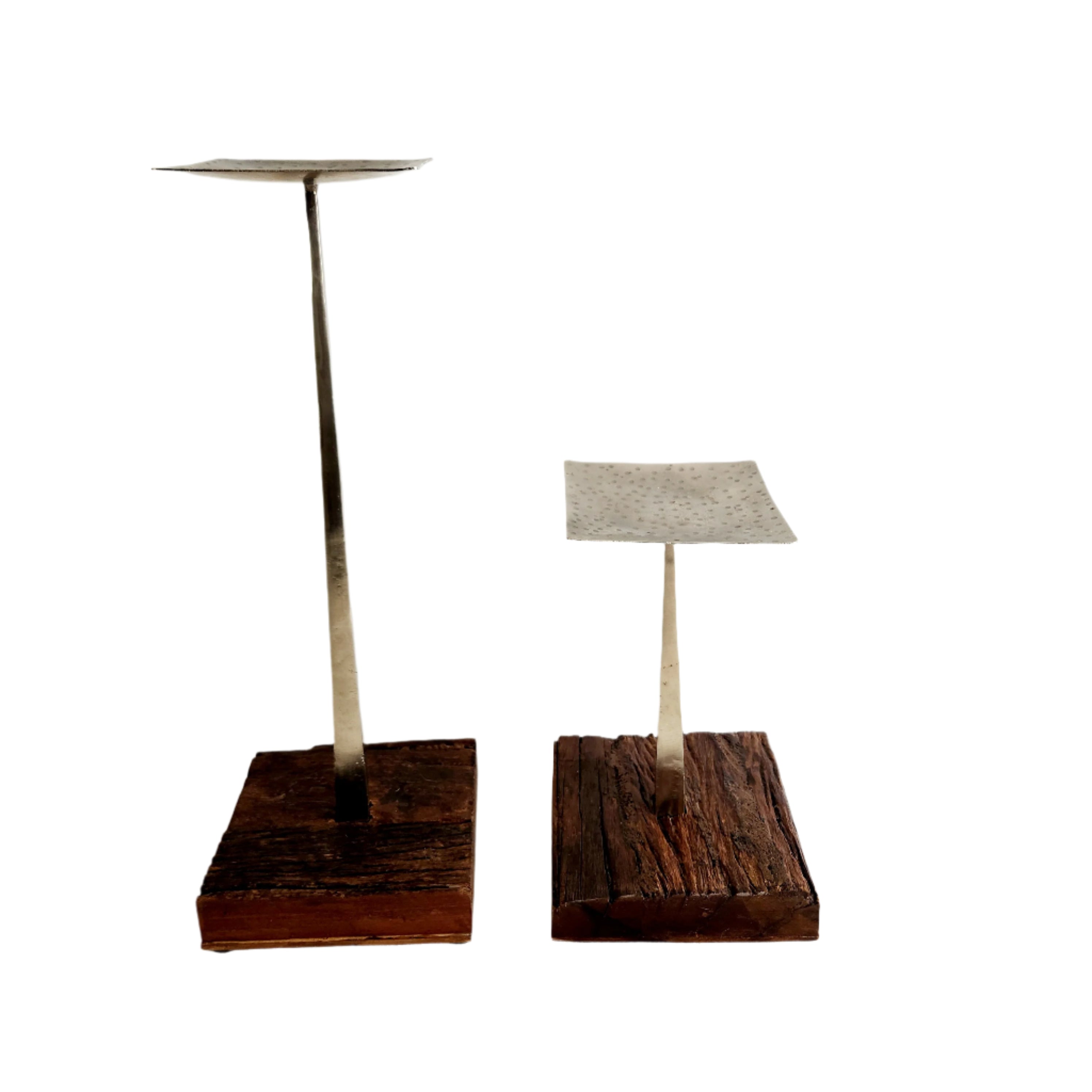Candle Stick Stands Rustic Wood and Polished Chrome