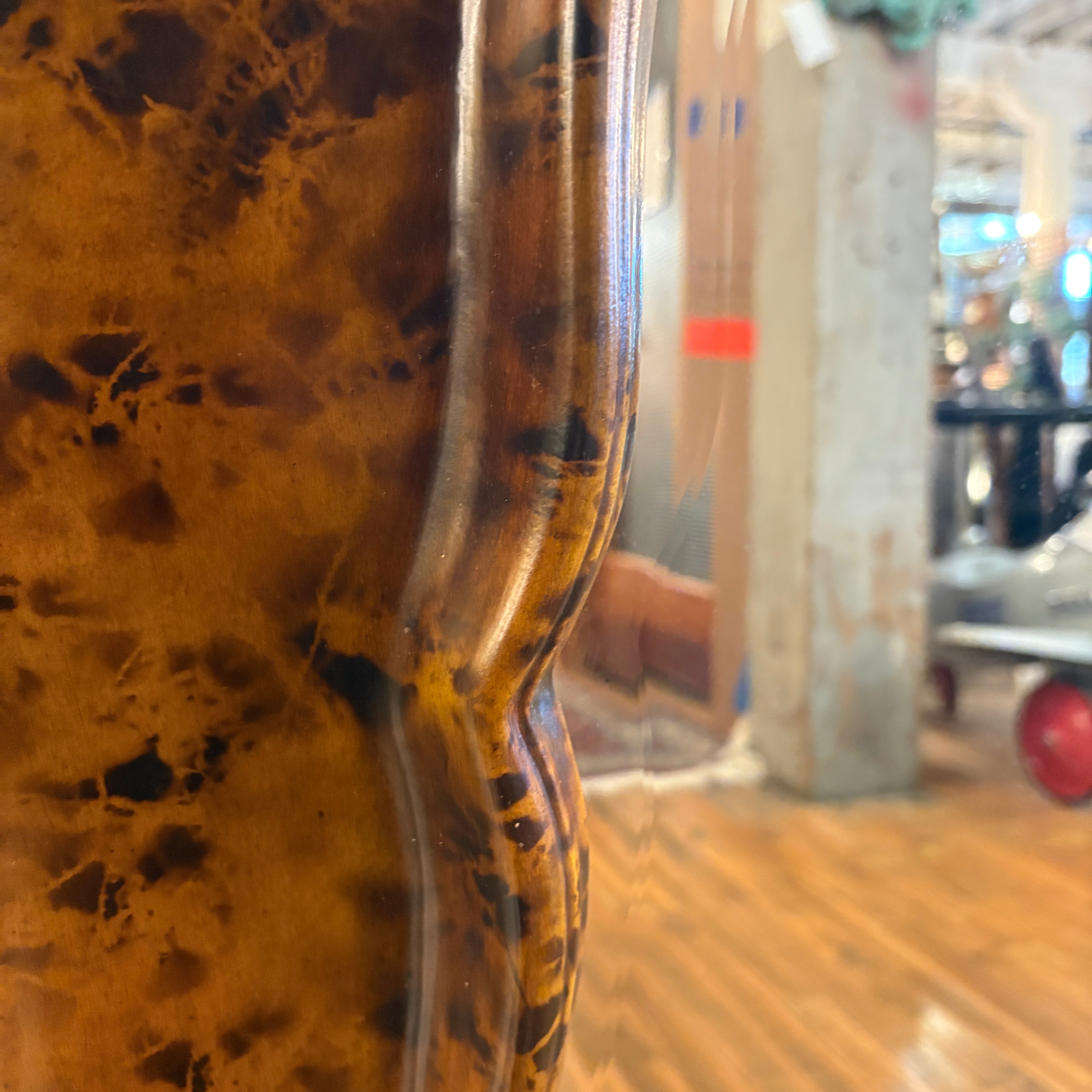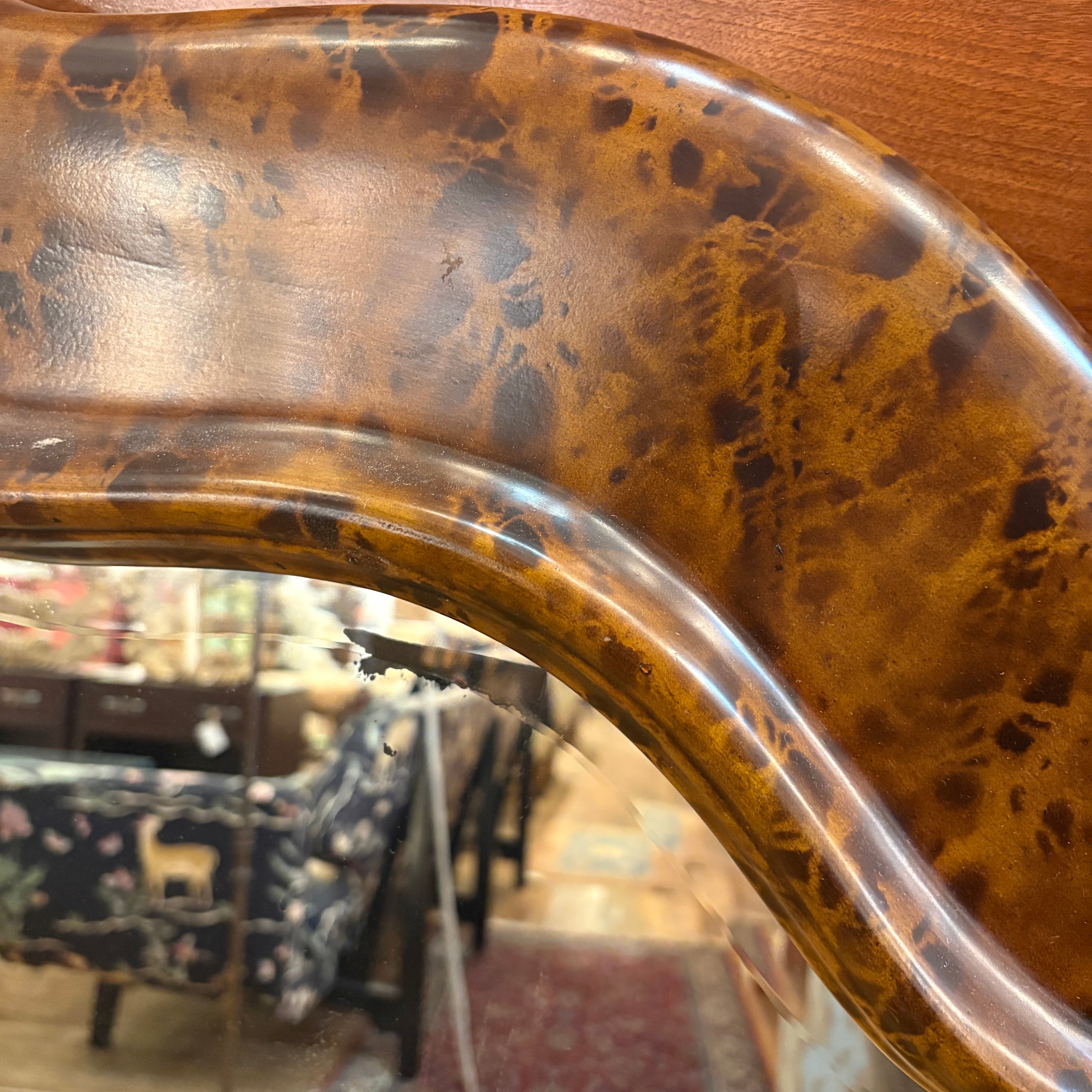Large Ornate Faux Burled Wood Mirror with Scalloped Frame, Octagonal Shape.