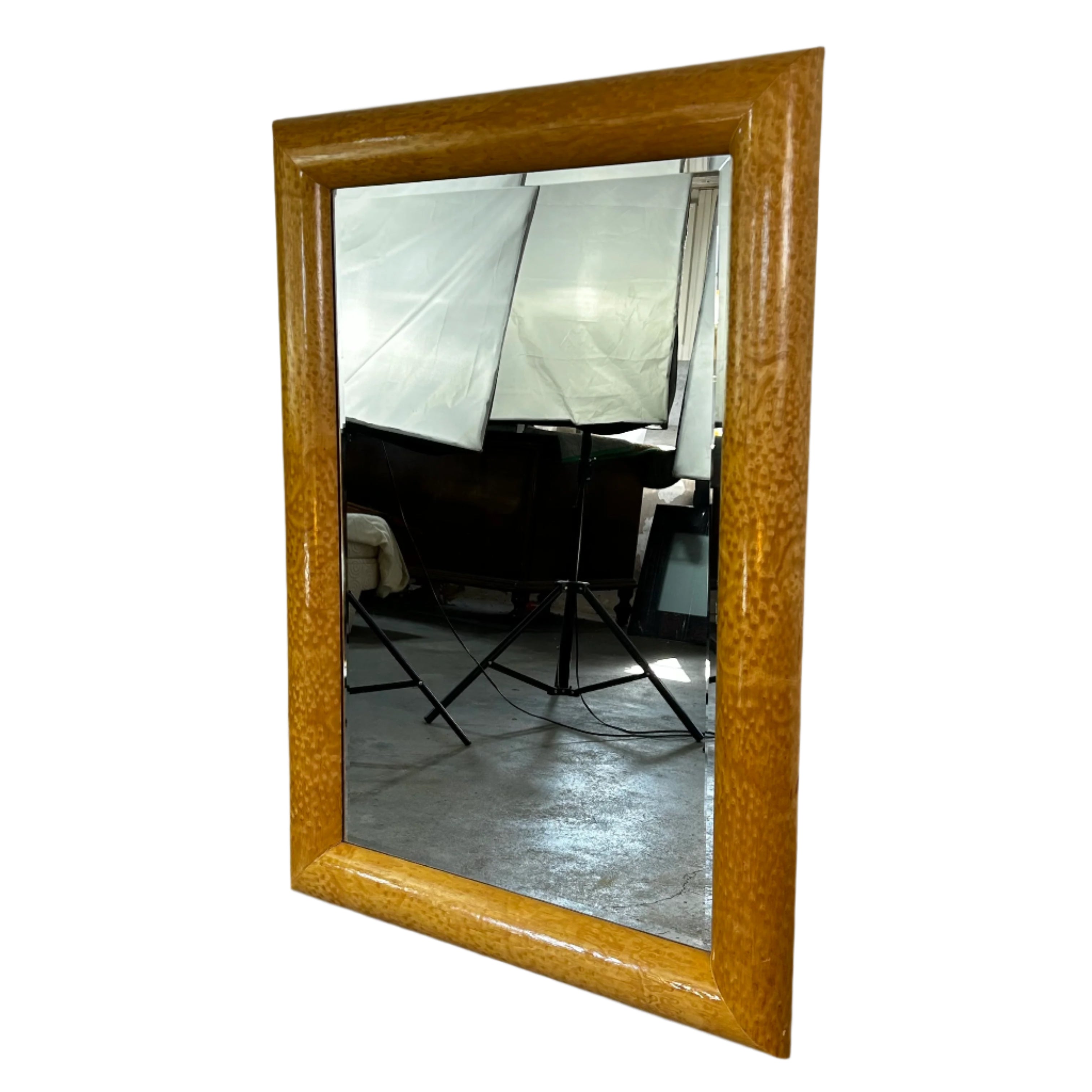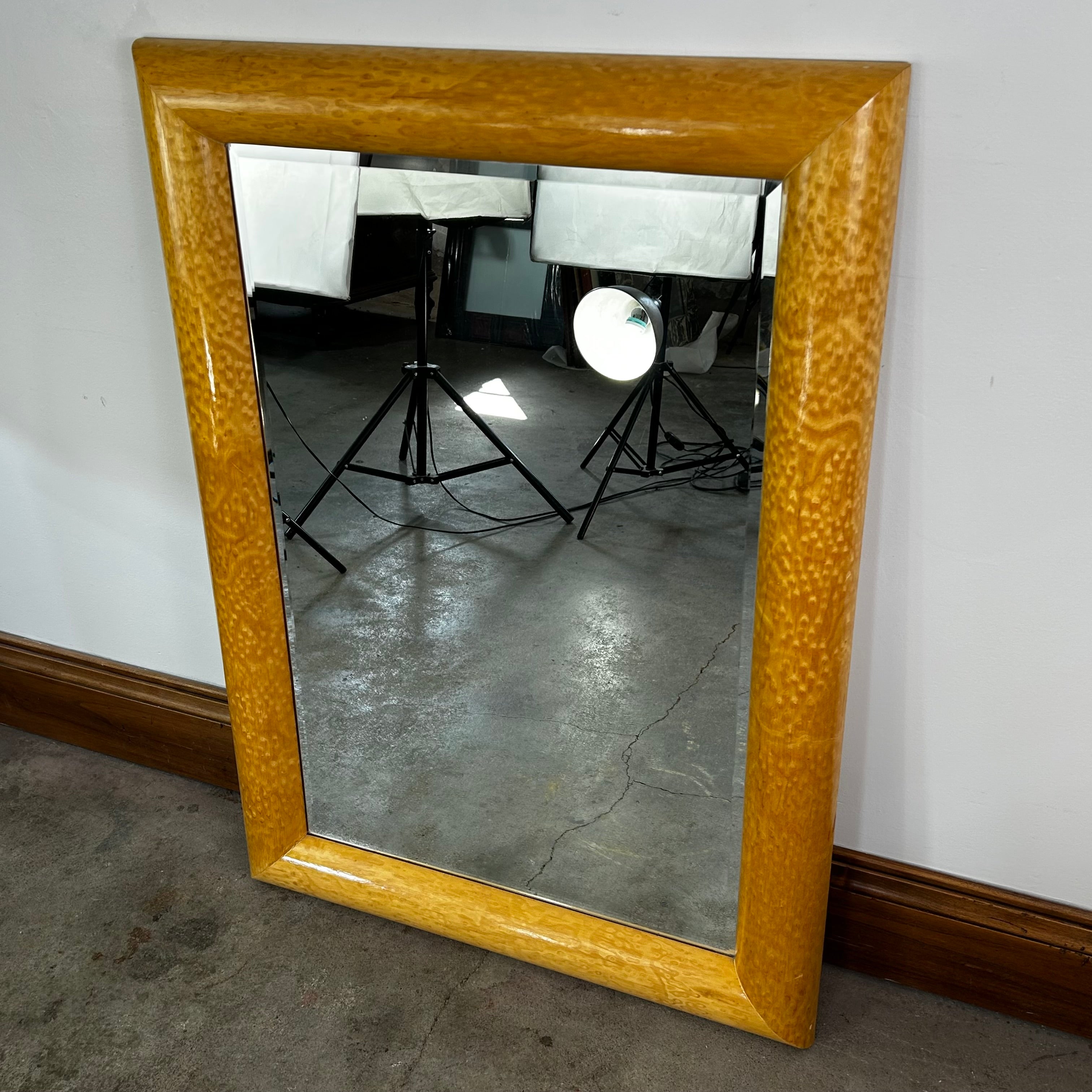 "Donelle LA" Birds eye maple framed mirror with beveled edge glass.