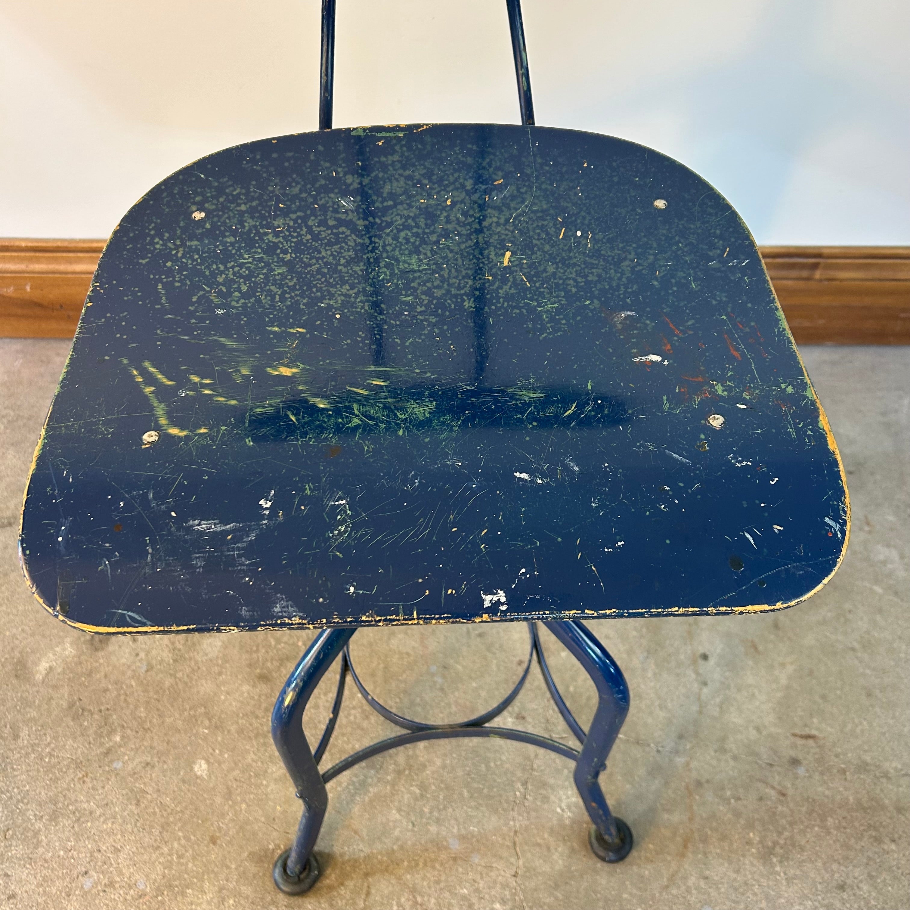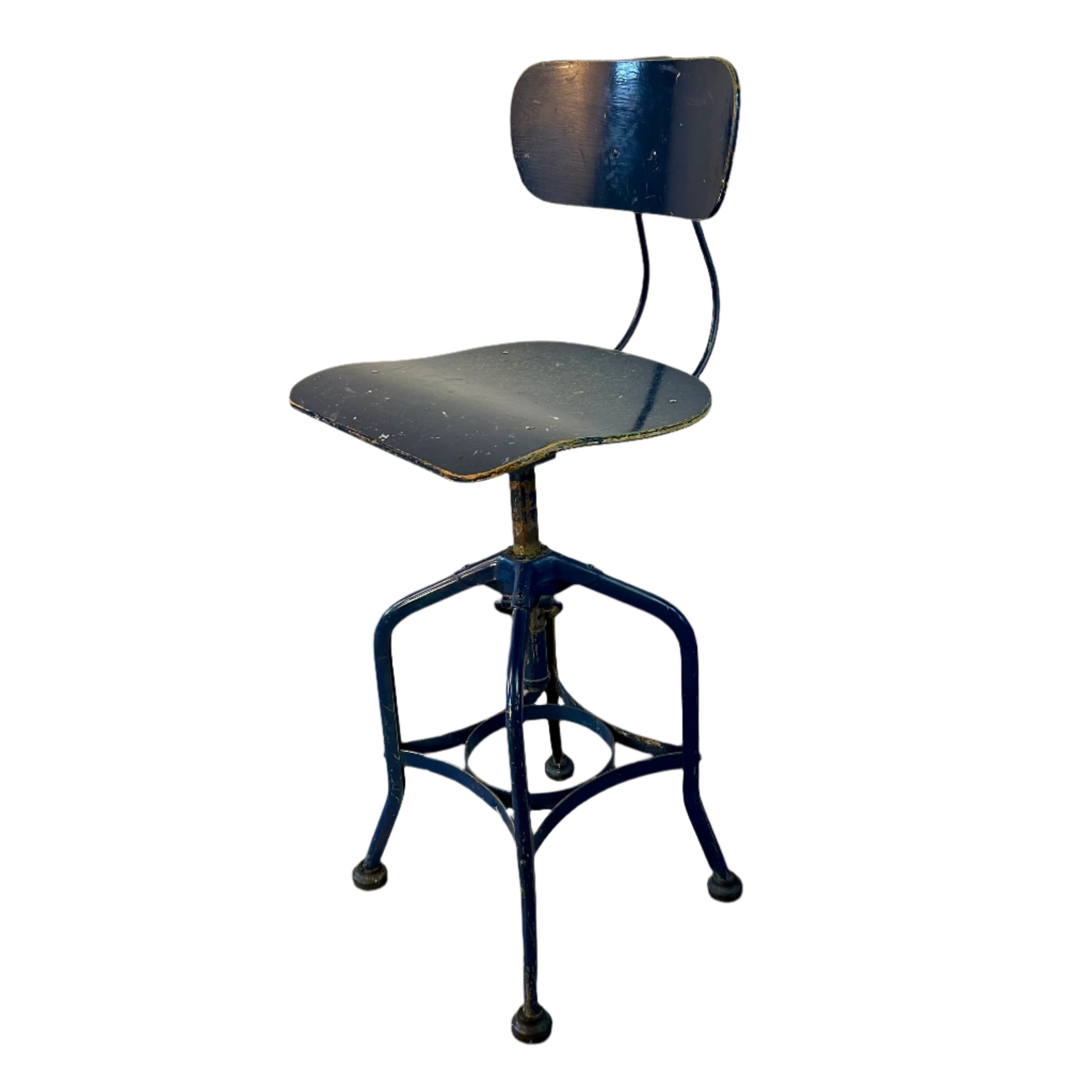 Drafting stool, bentwood seat and back, painted dark blue, metal frame, vintage.