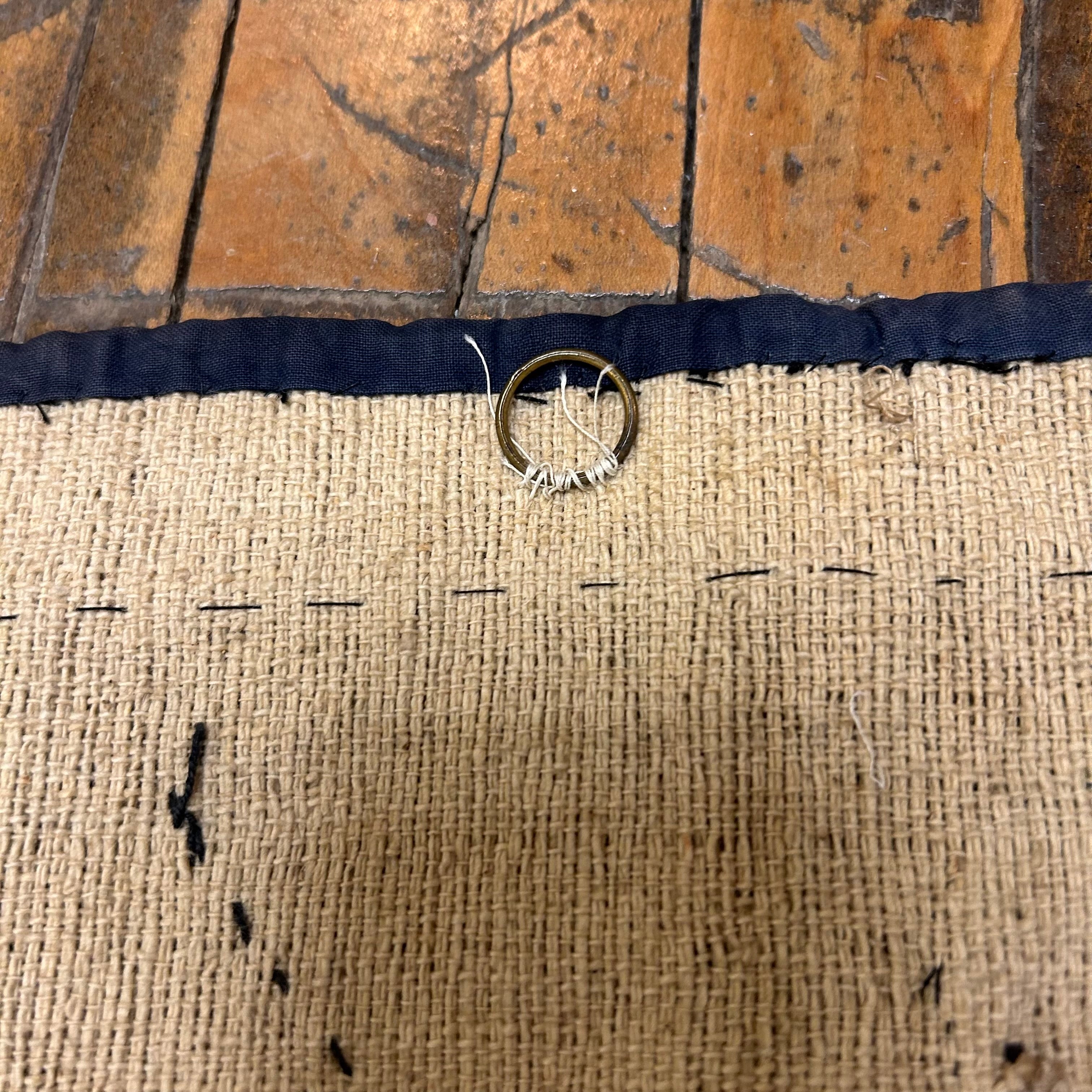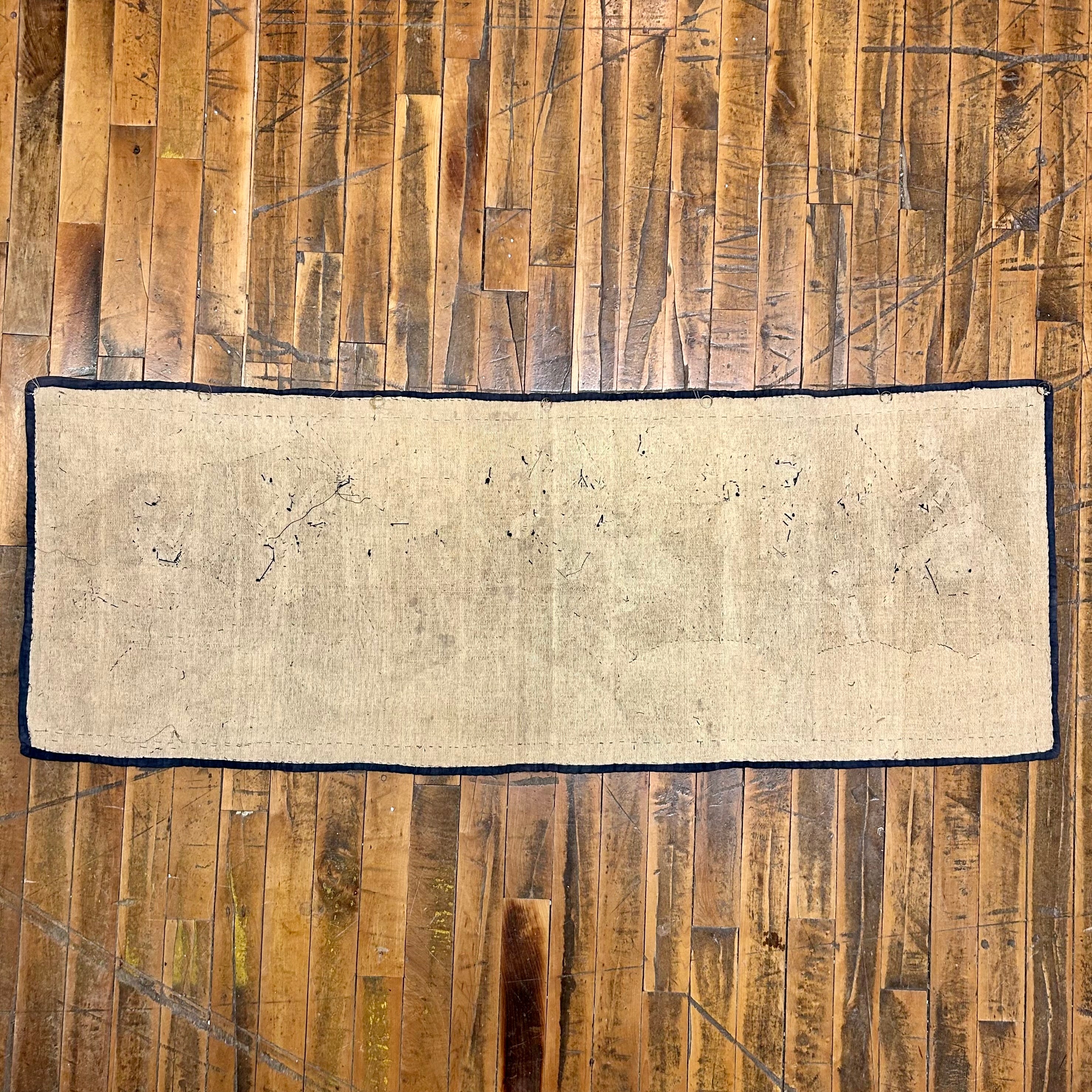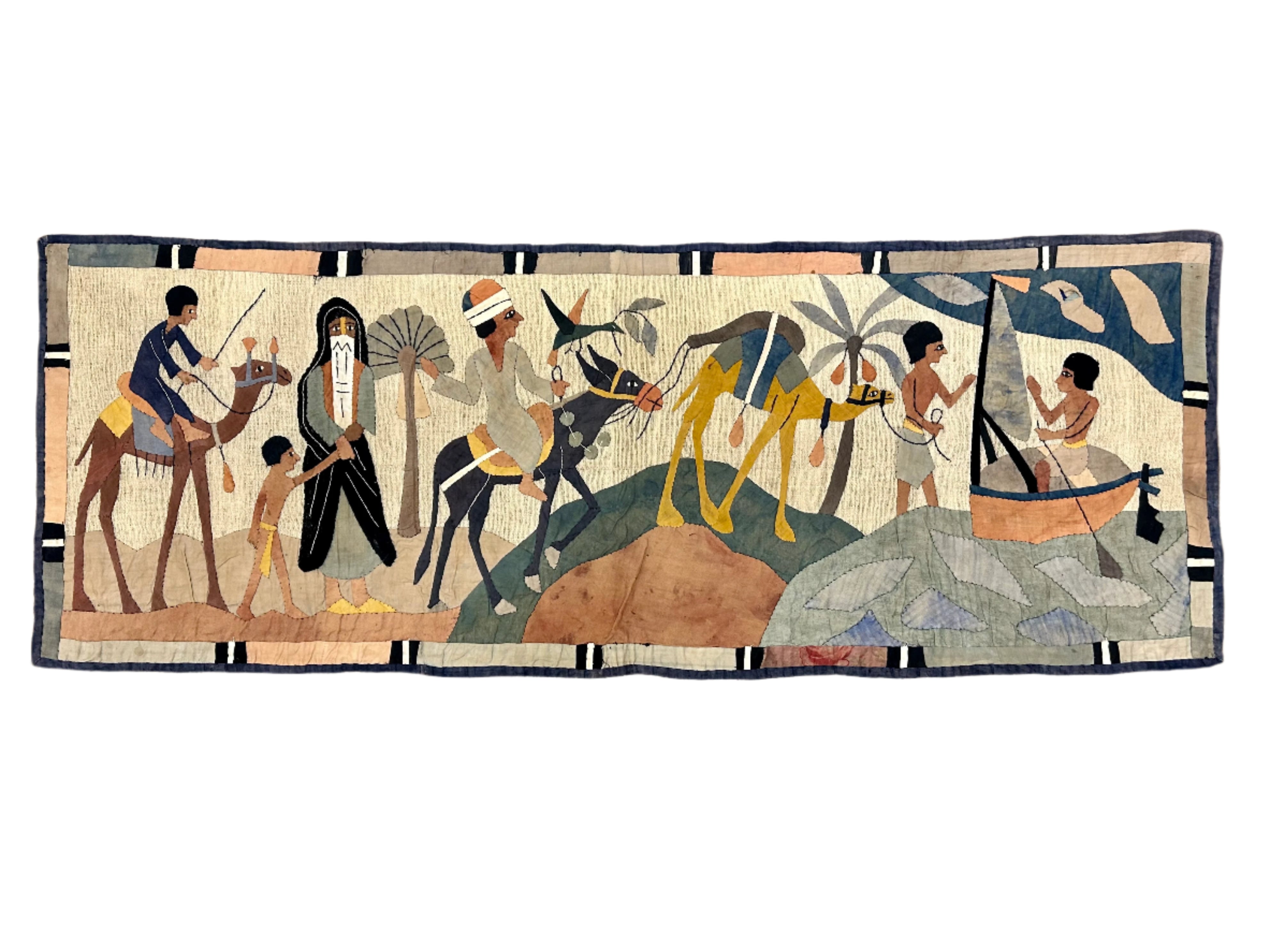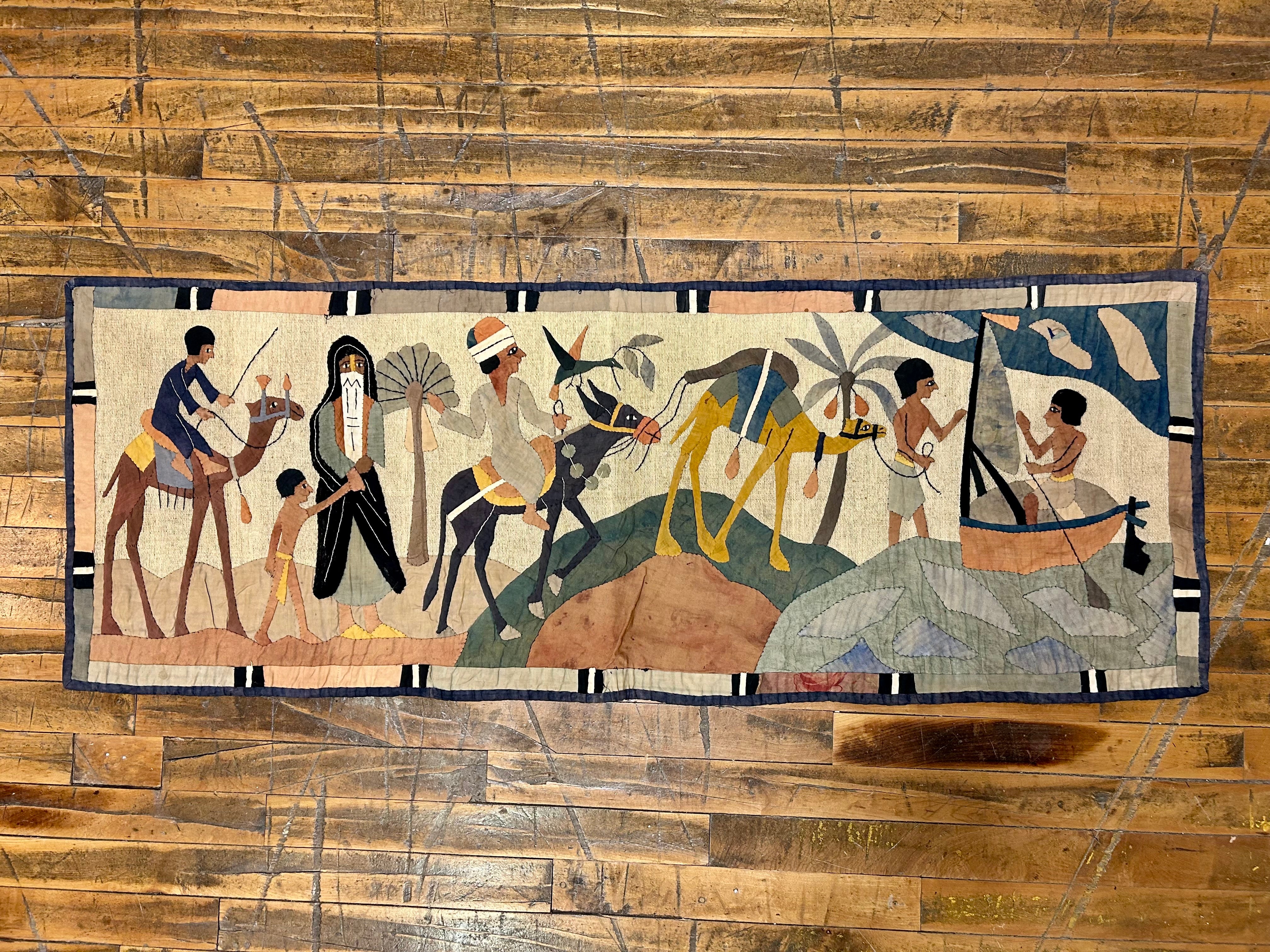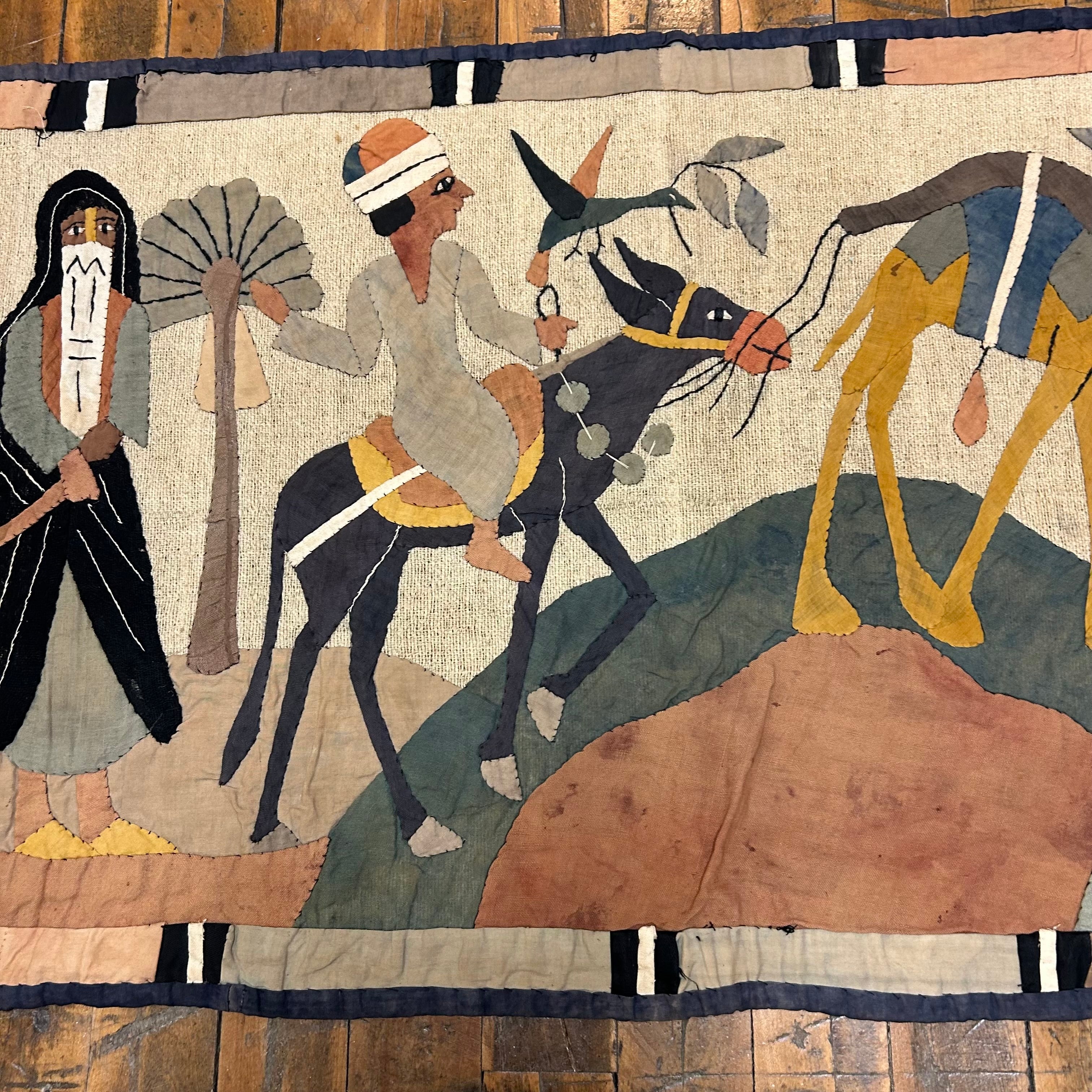 Egyptian Khayamiya textile art, desert scene with men, camel, donkey, bird, boat, palm tree. Design sewn on in appliqué fashion. There are small brass rings on the back for hanging.