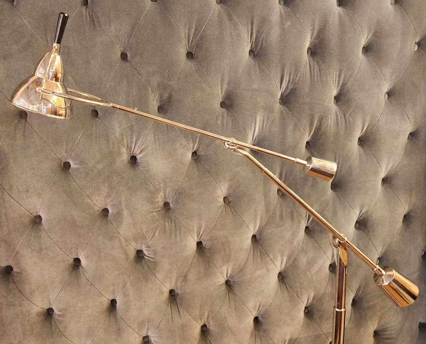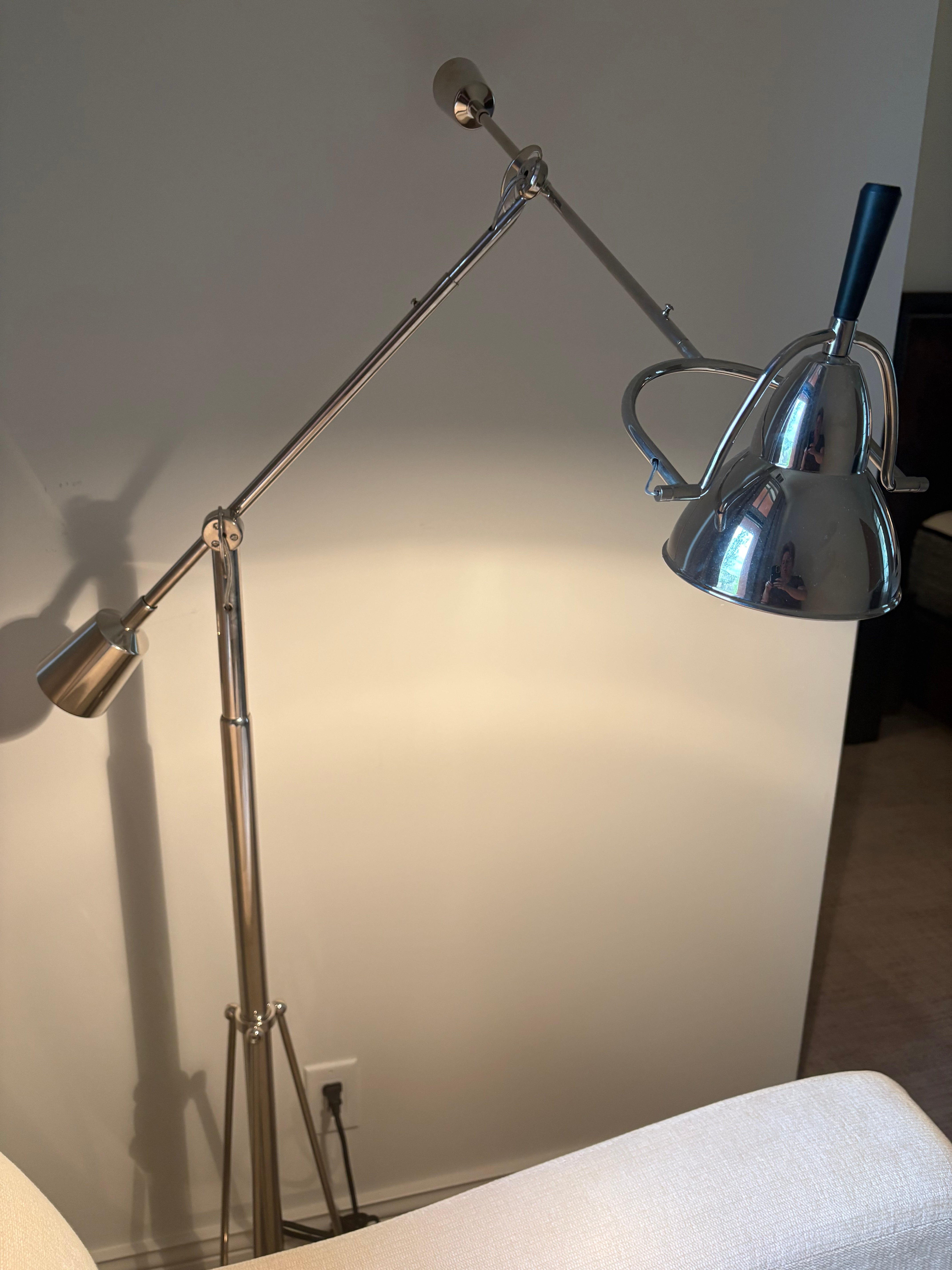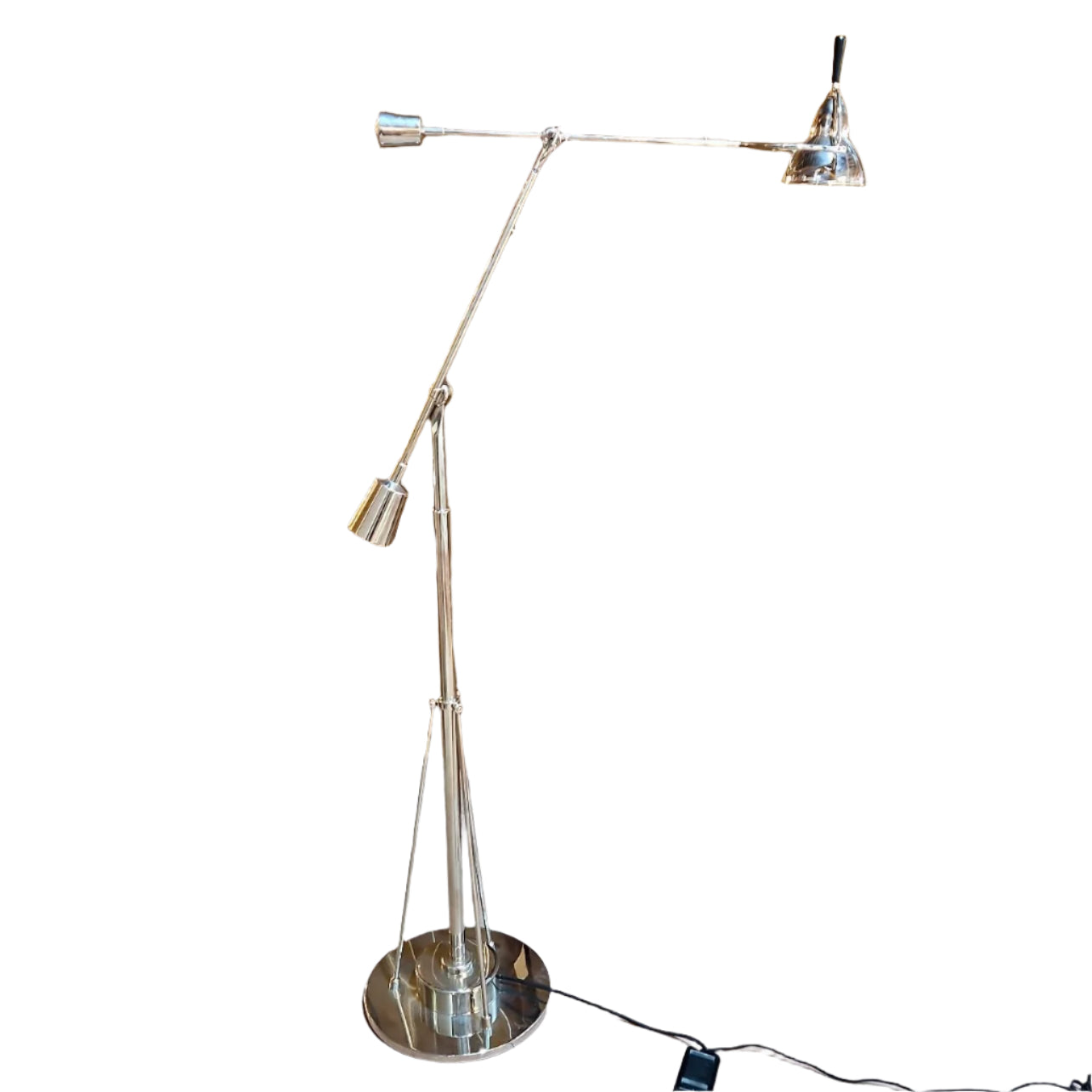 We believe this floor lamp to be a RH Restoration Hardware "Bouquet Light" 1920s reproduction in polished nickel.