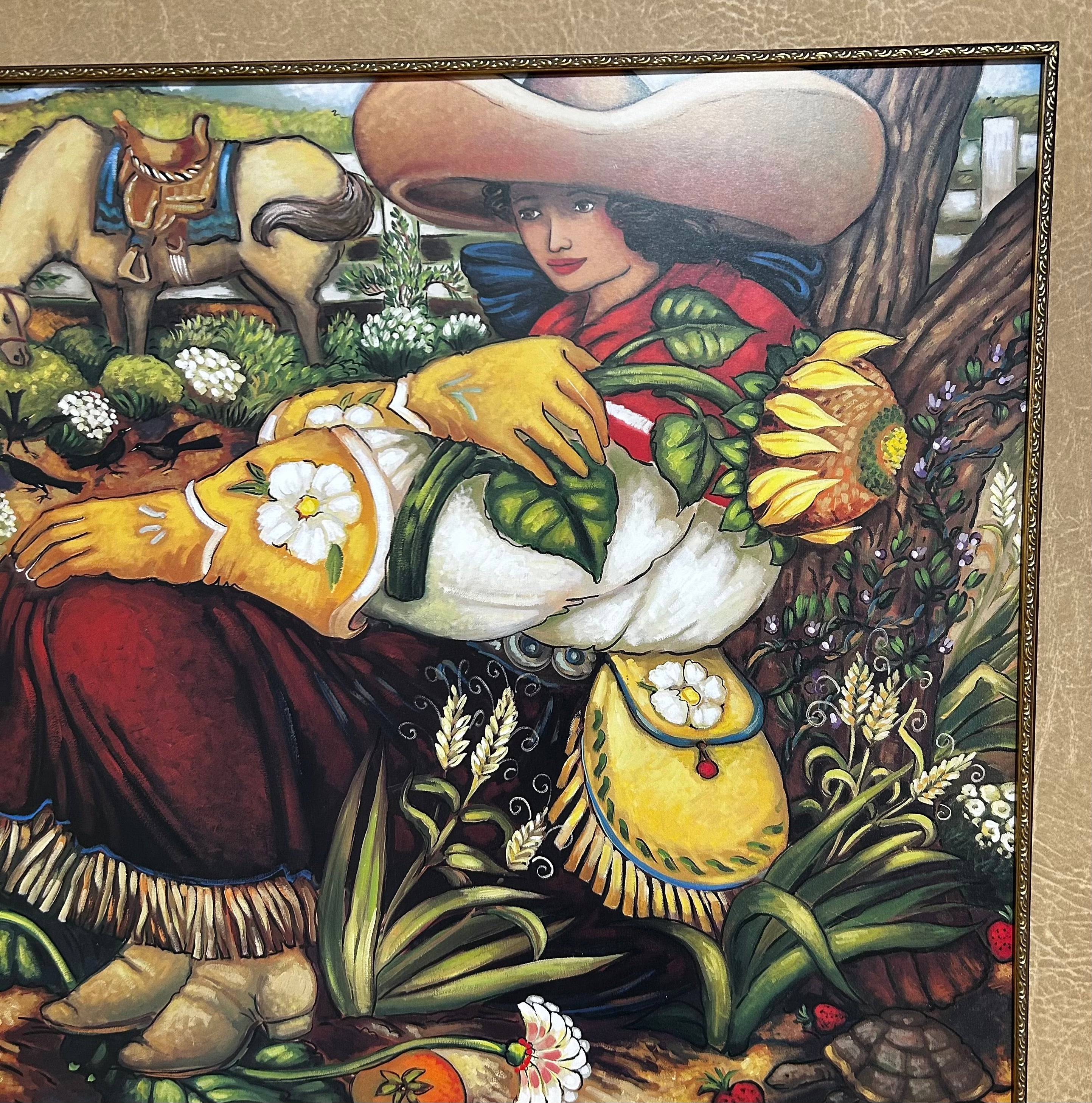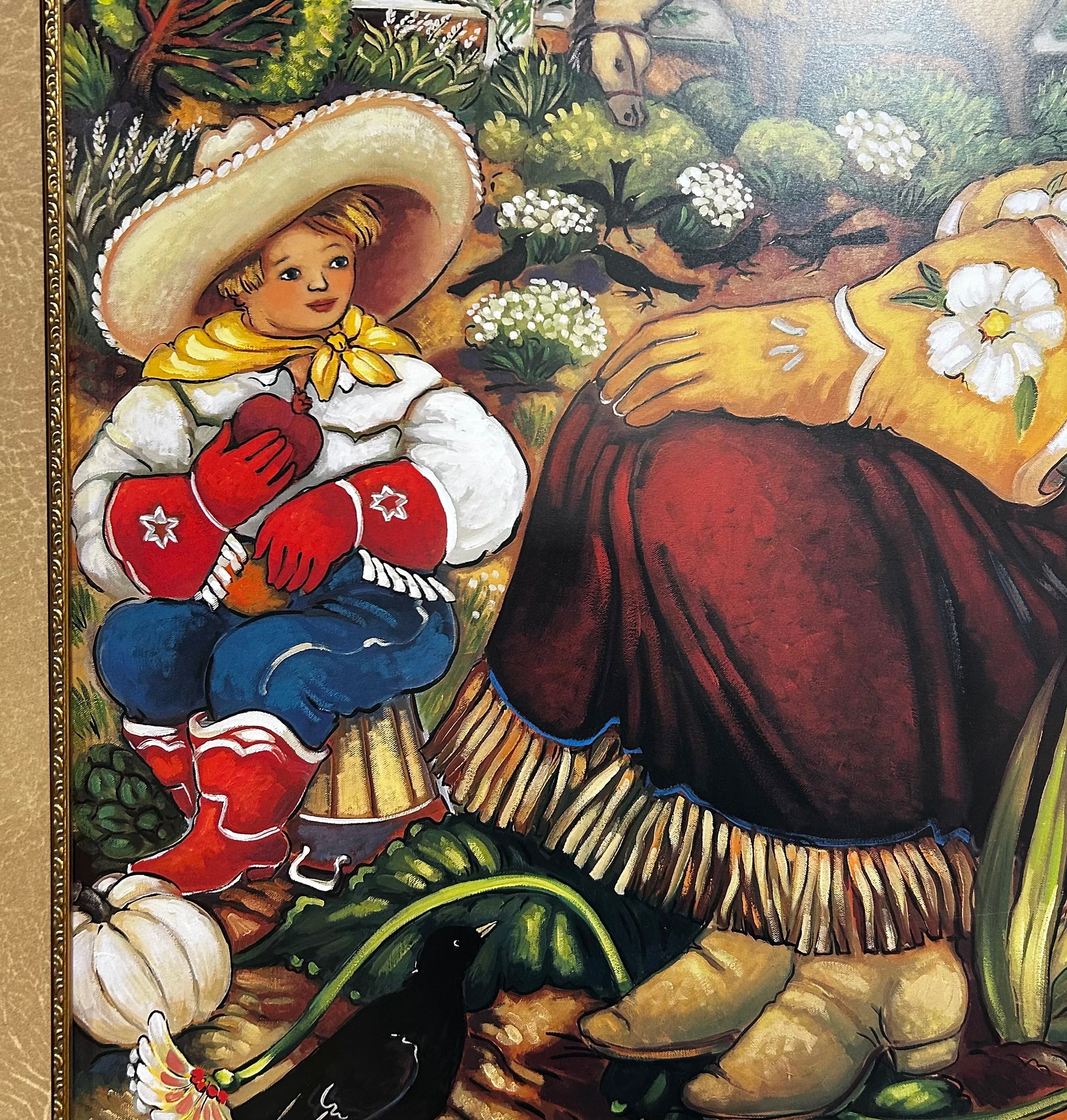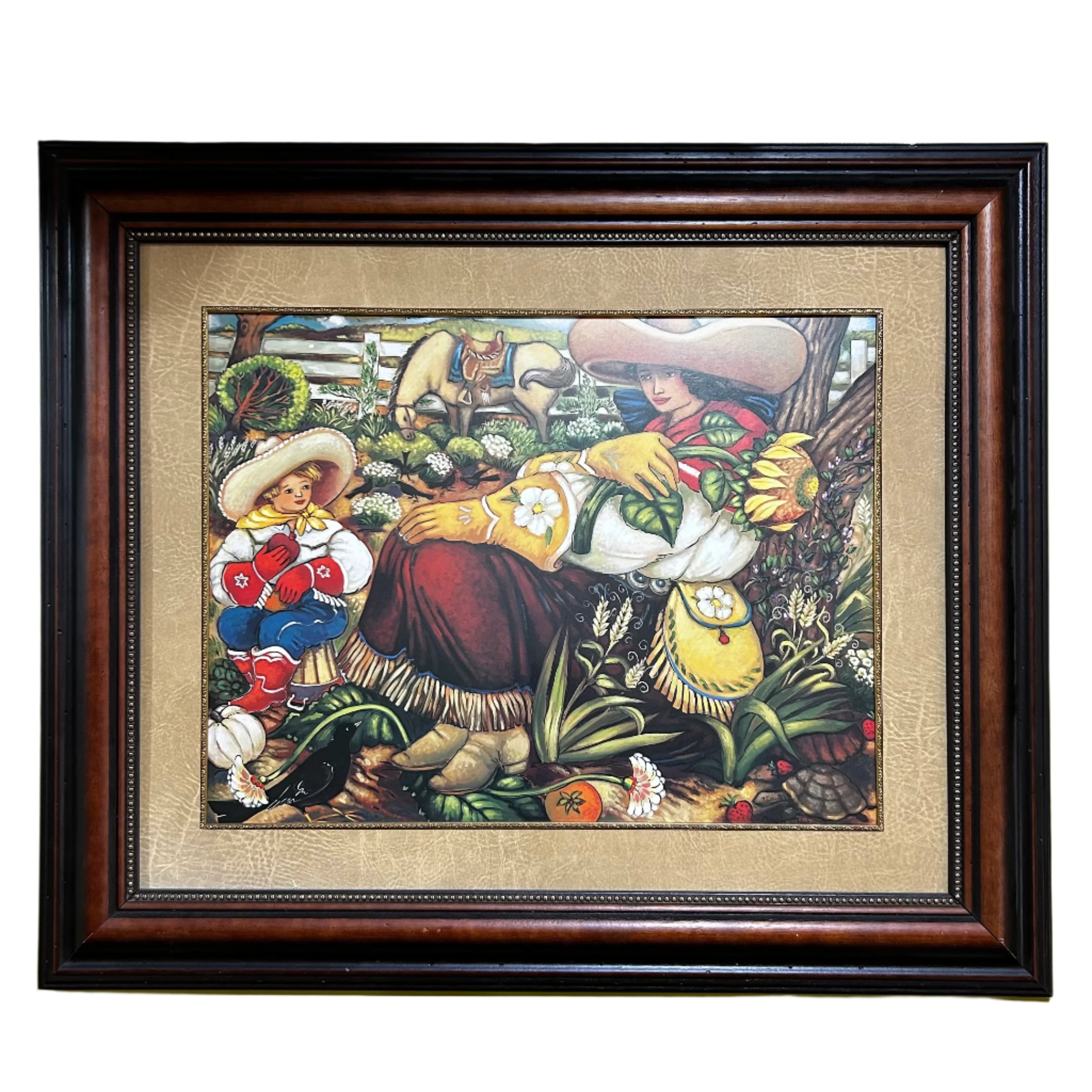 Print, framed and matted farm scene, young cowboy, cowgirl, animals and plants.