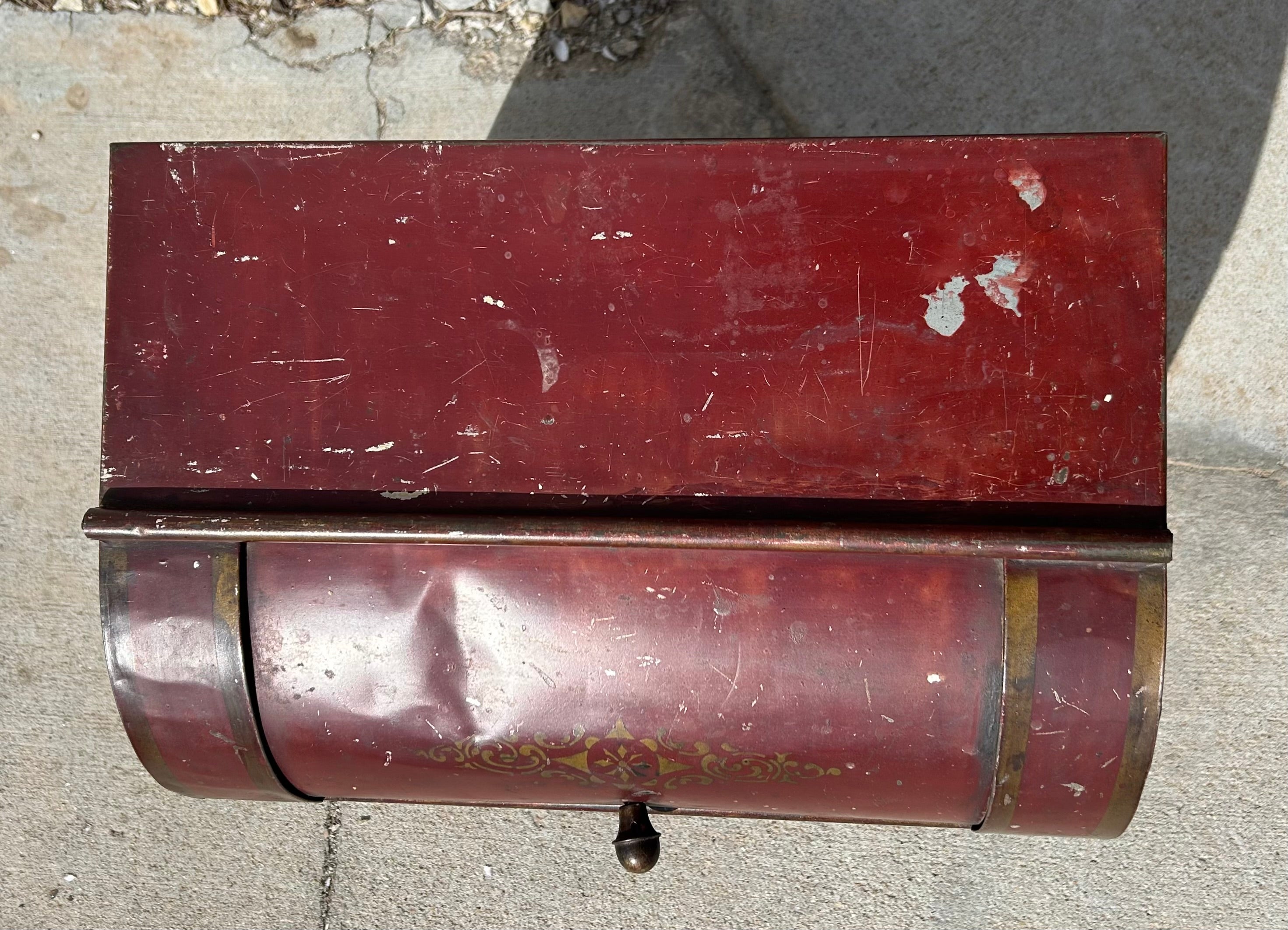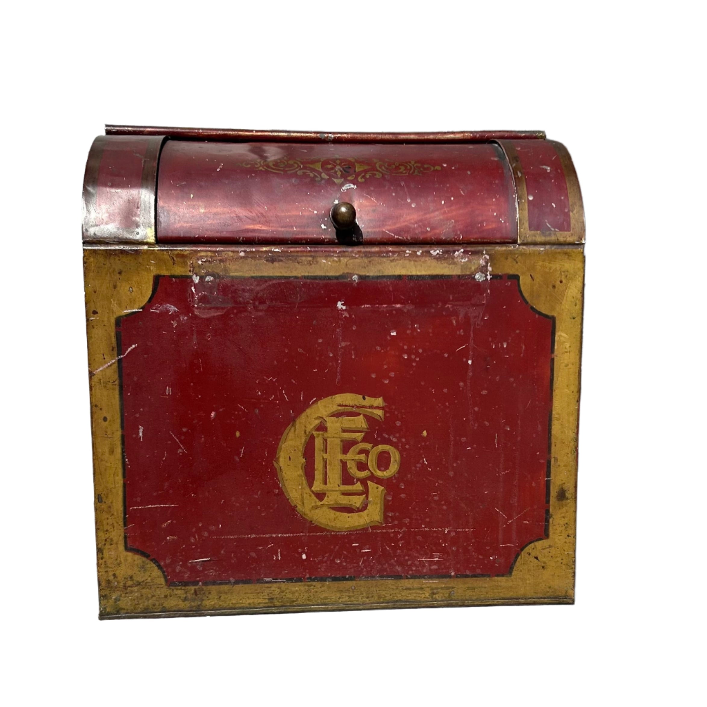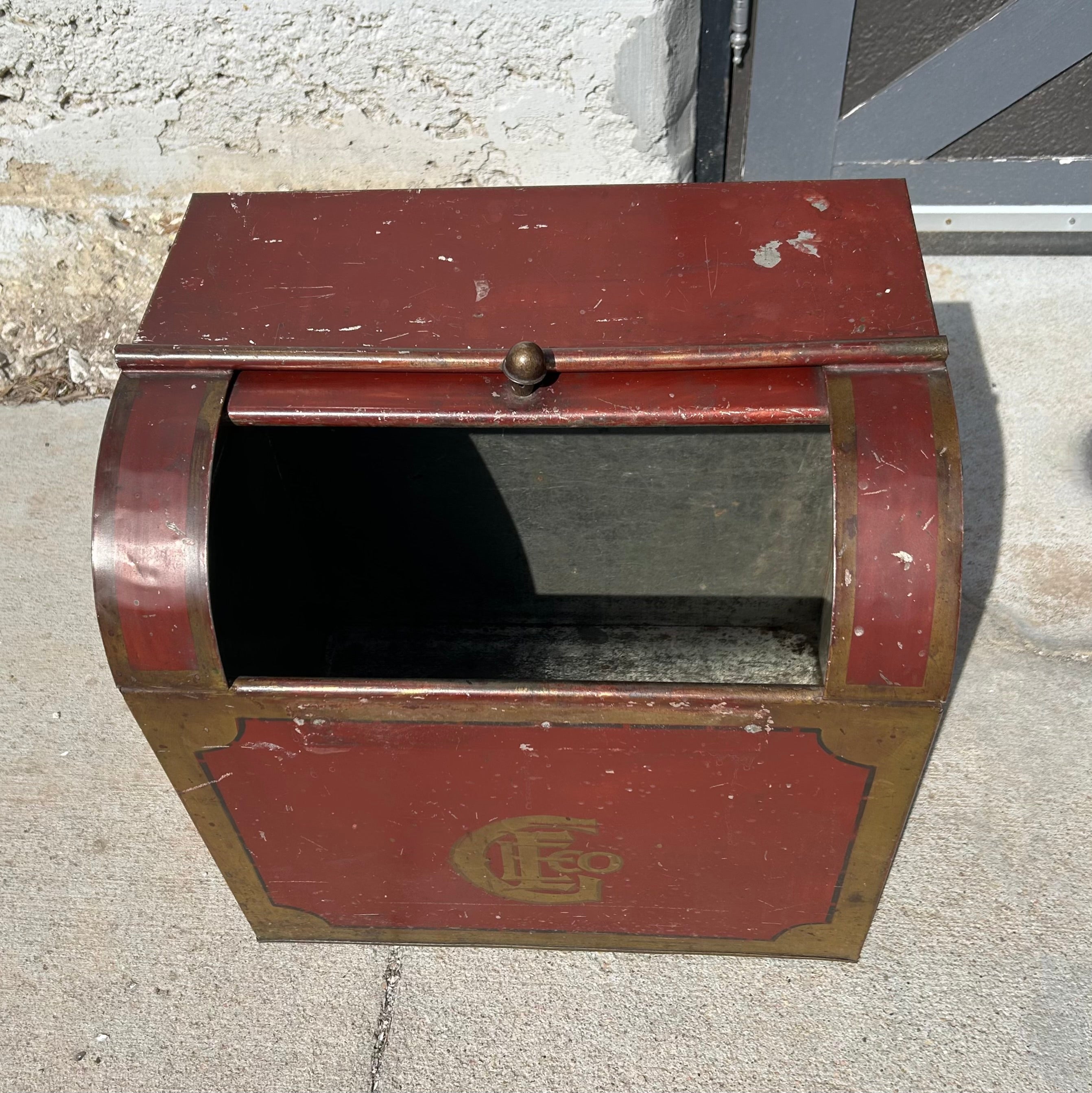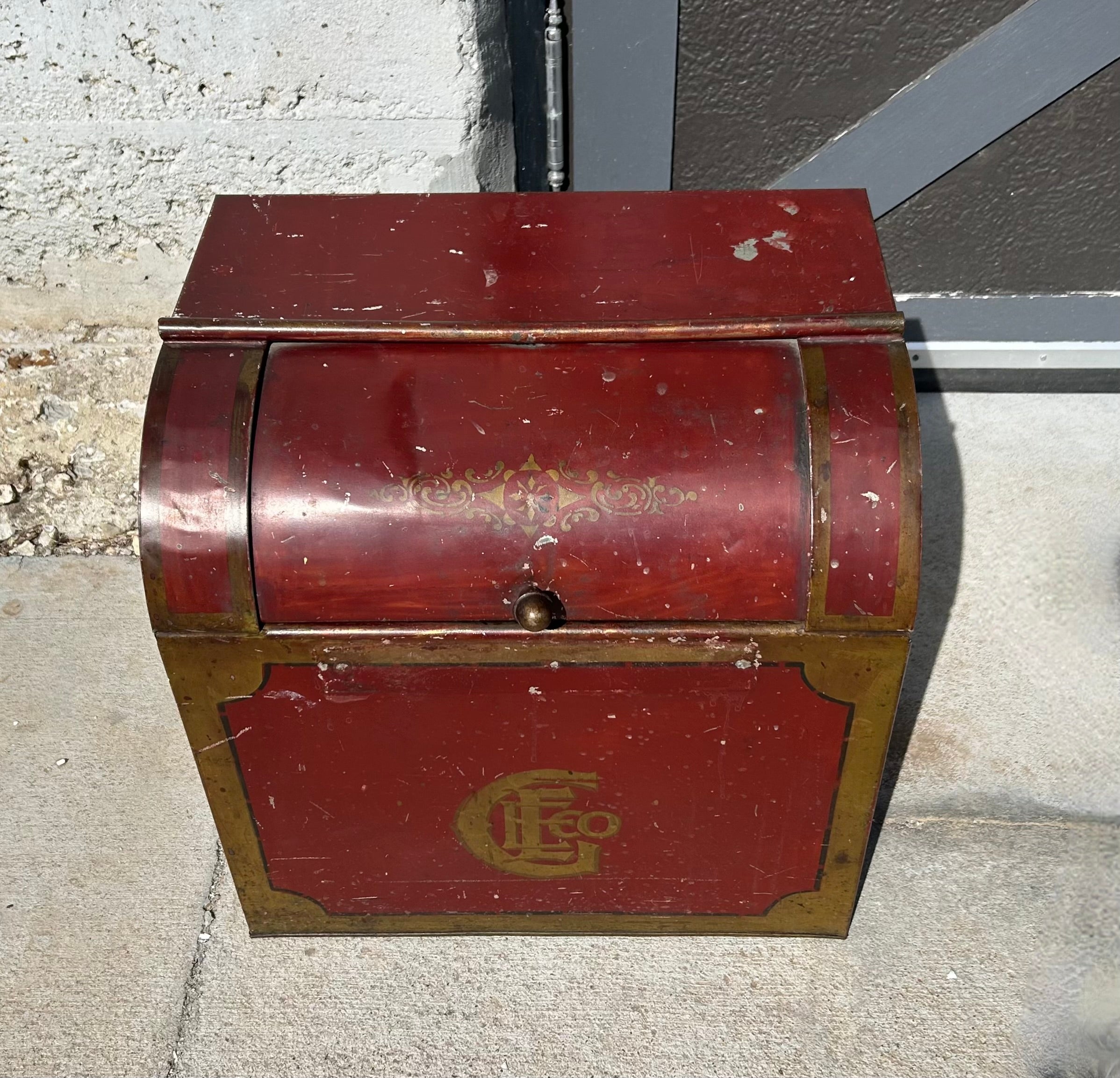 Flour safe, flour storage box in painted metal with roll top.