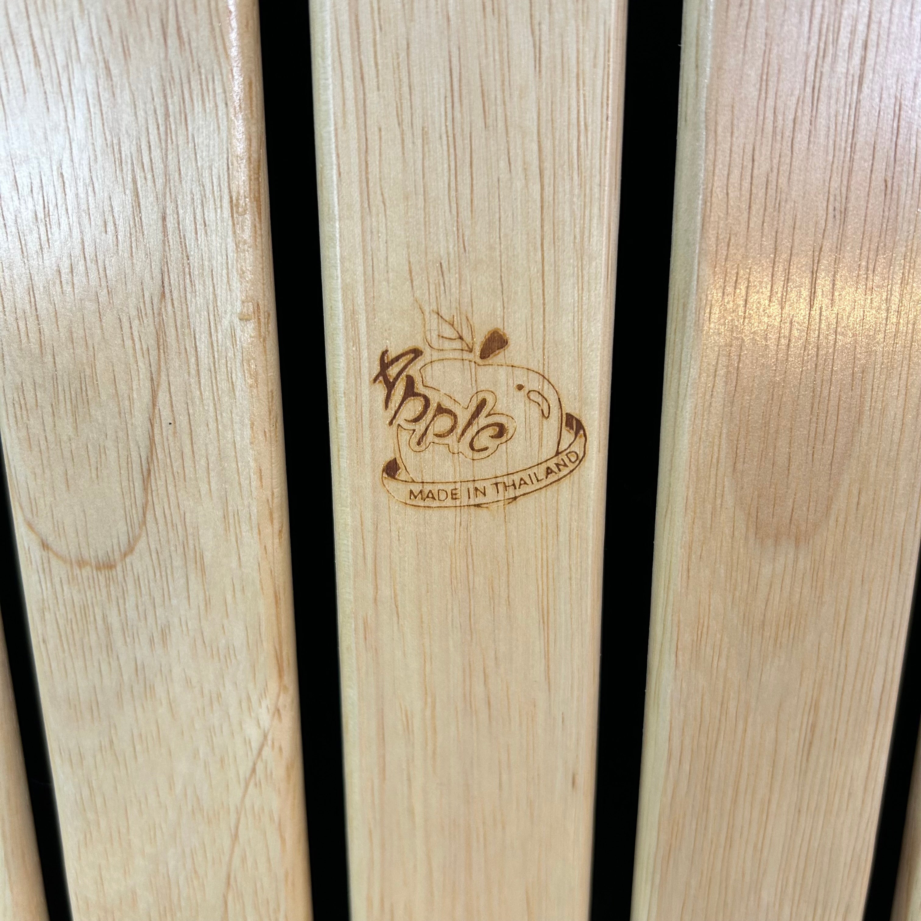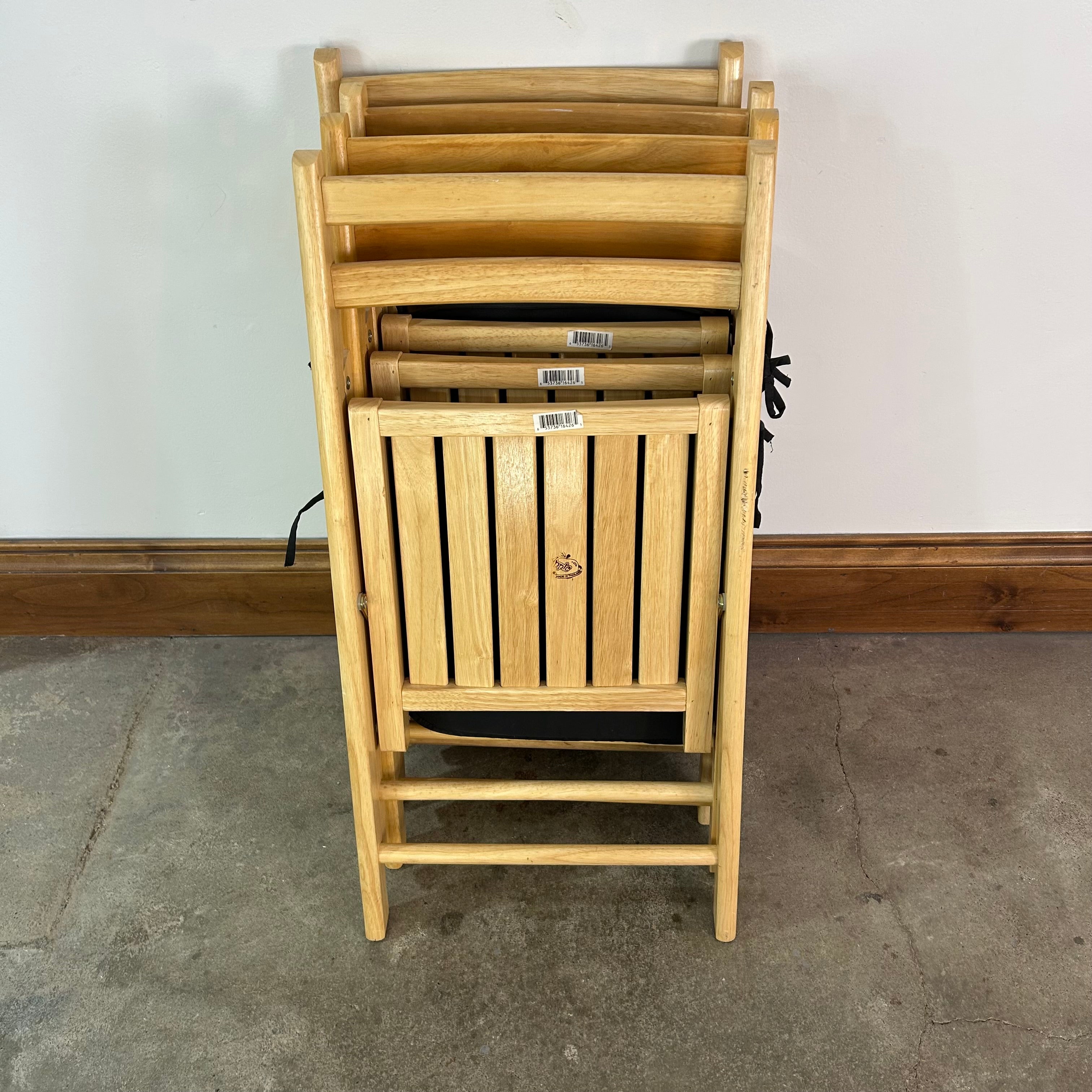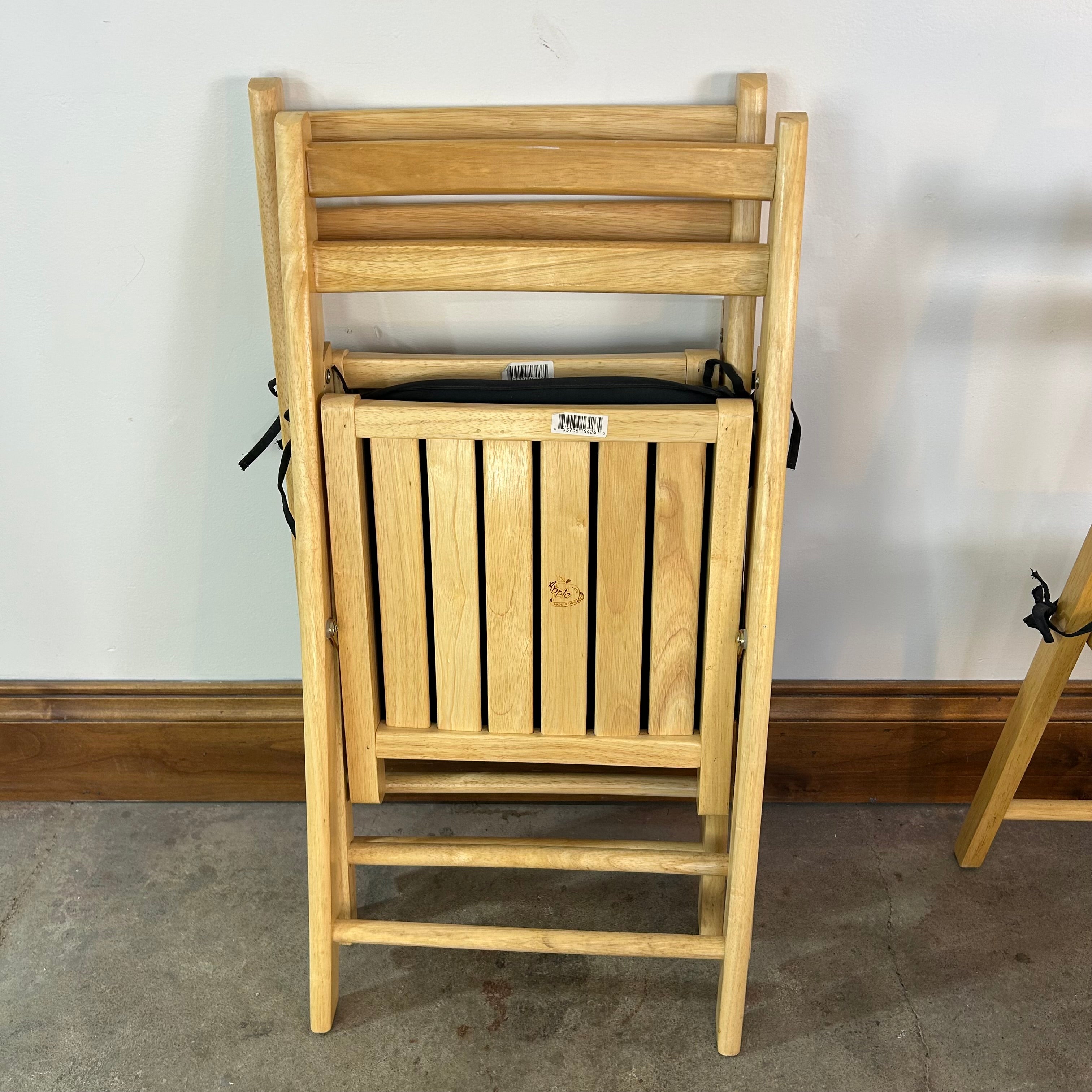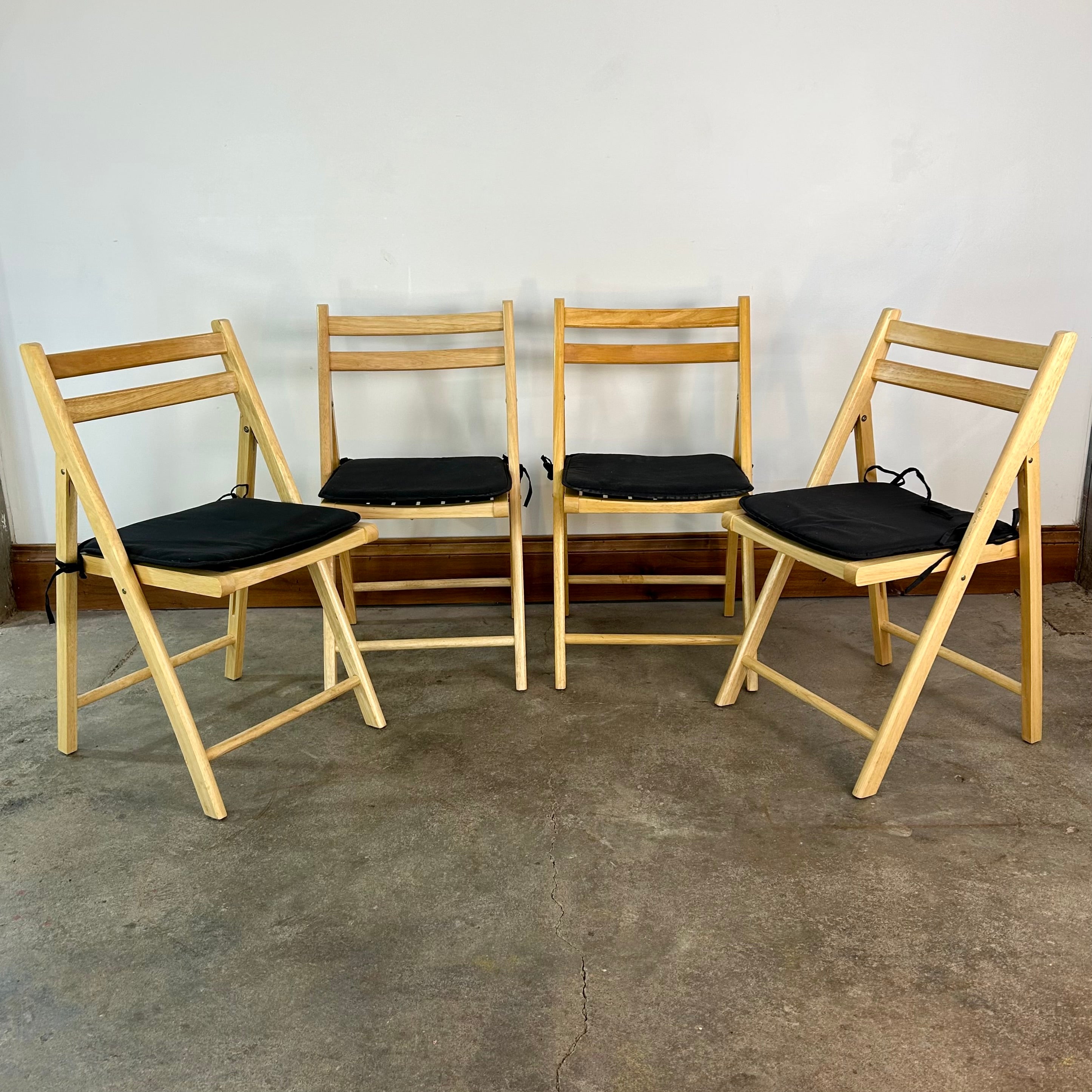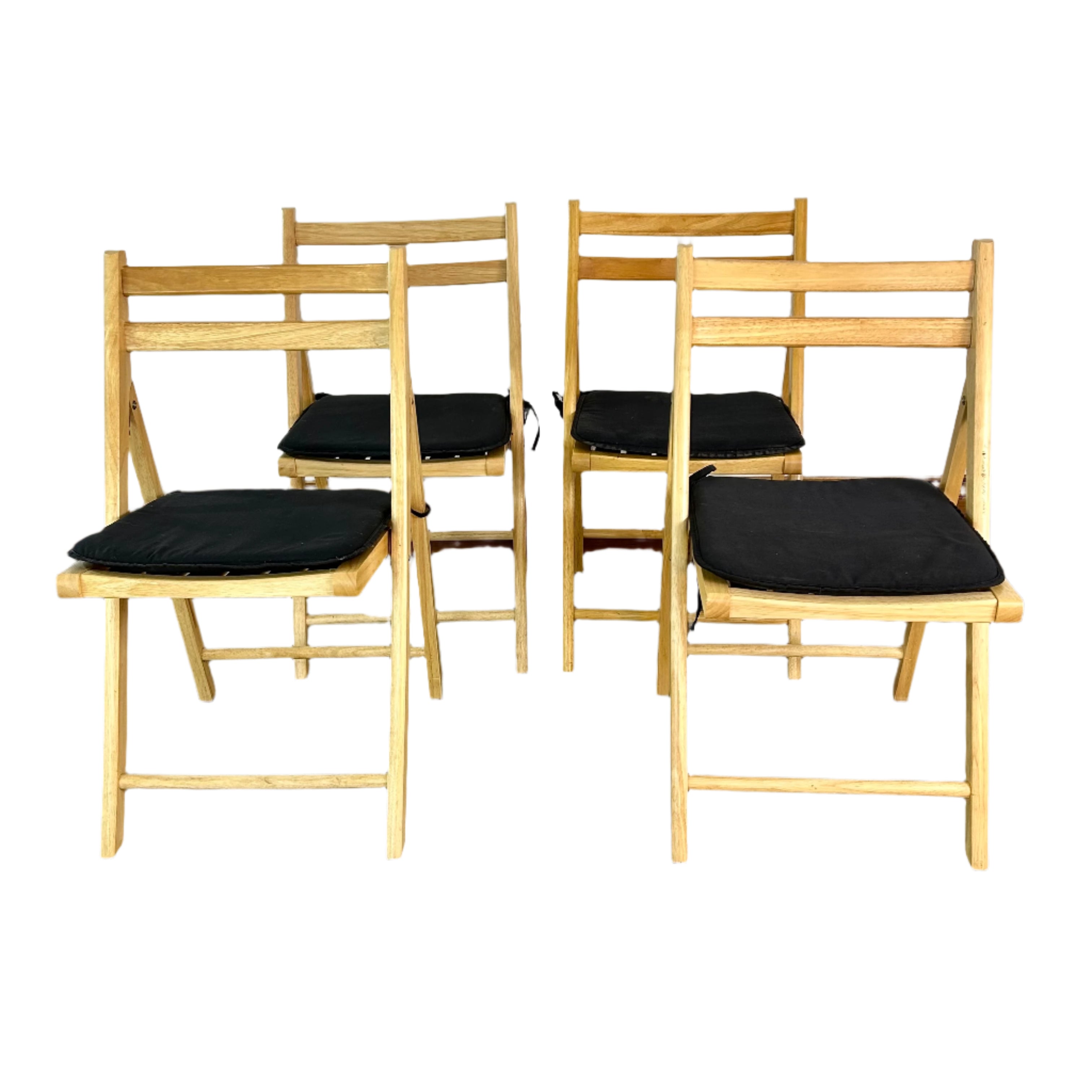 Apple Brand folding blond solid wood chairs, set of four with black fabric cushions. Sold as a set.
