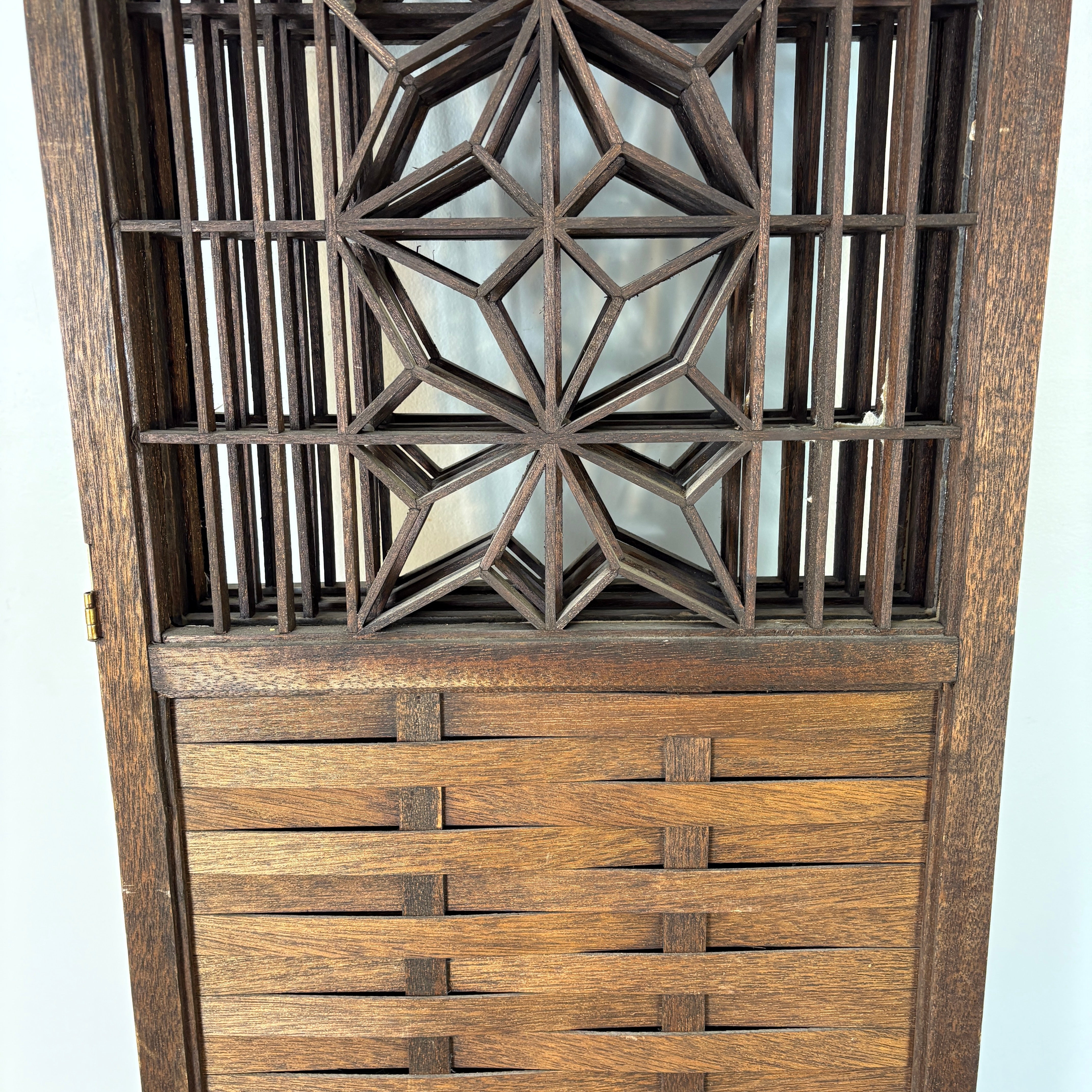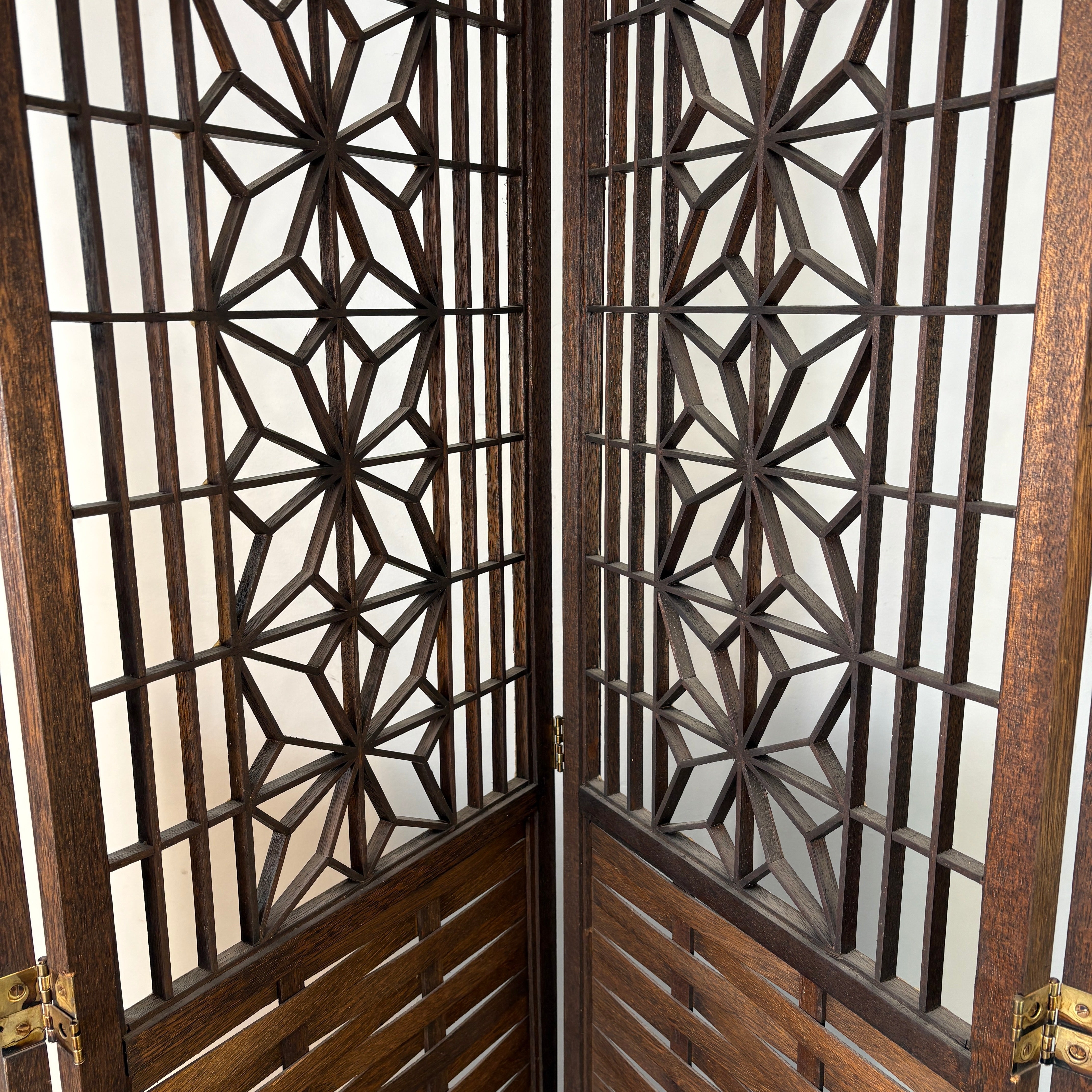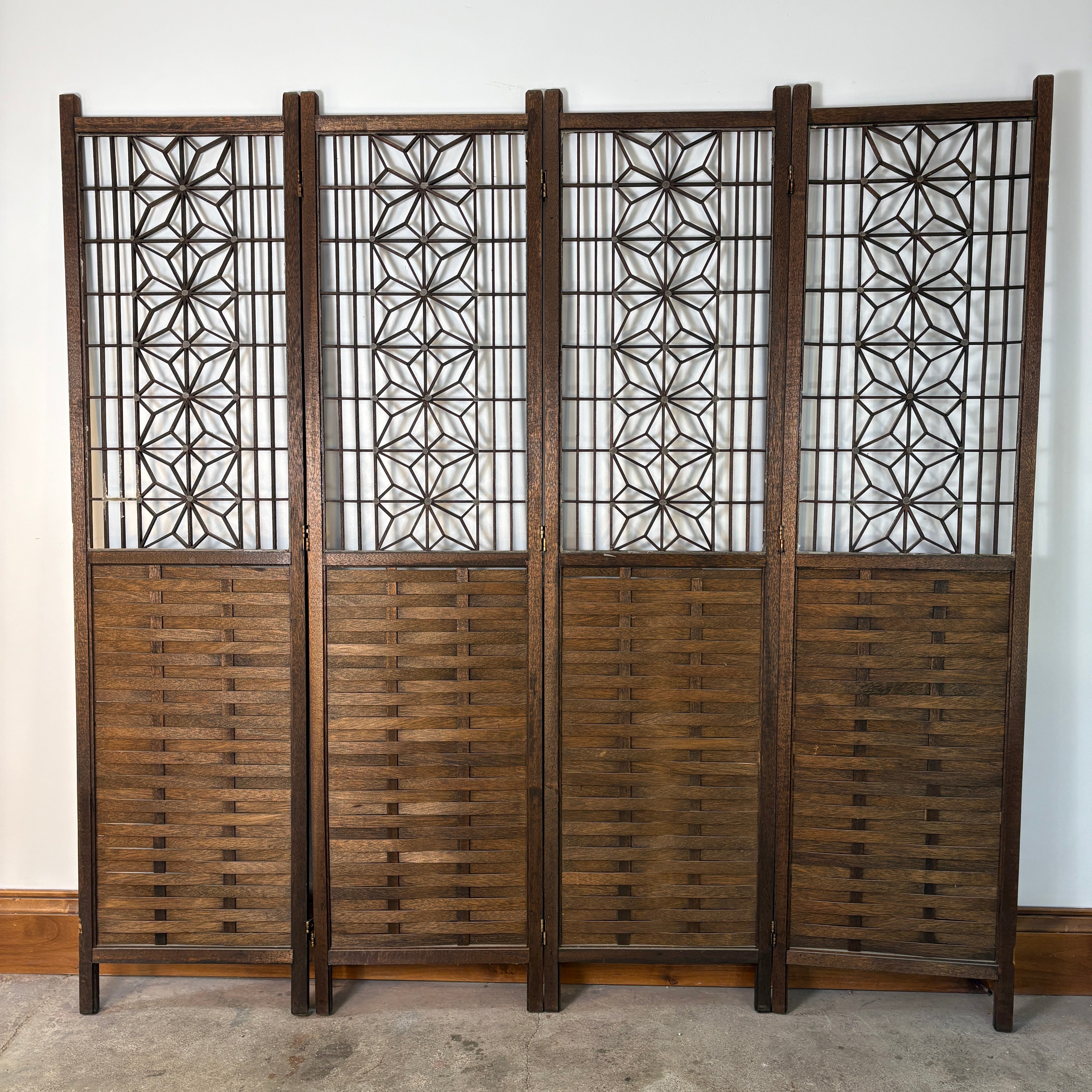 1960's Mid Century Modern Japanese "Atomic Starburst" Kumiko Teak Wood 4-Panel Room Divider