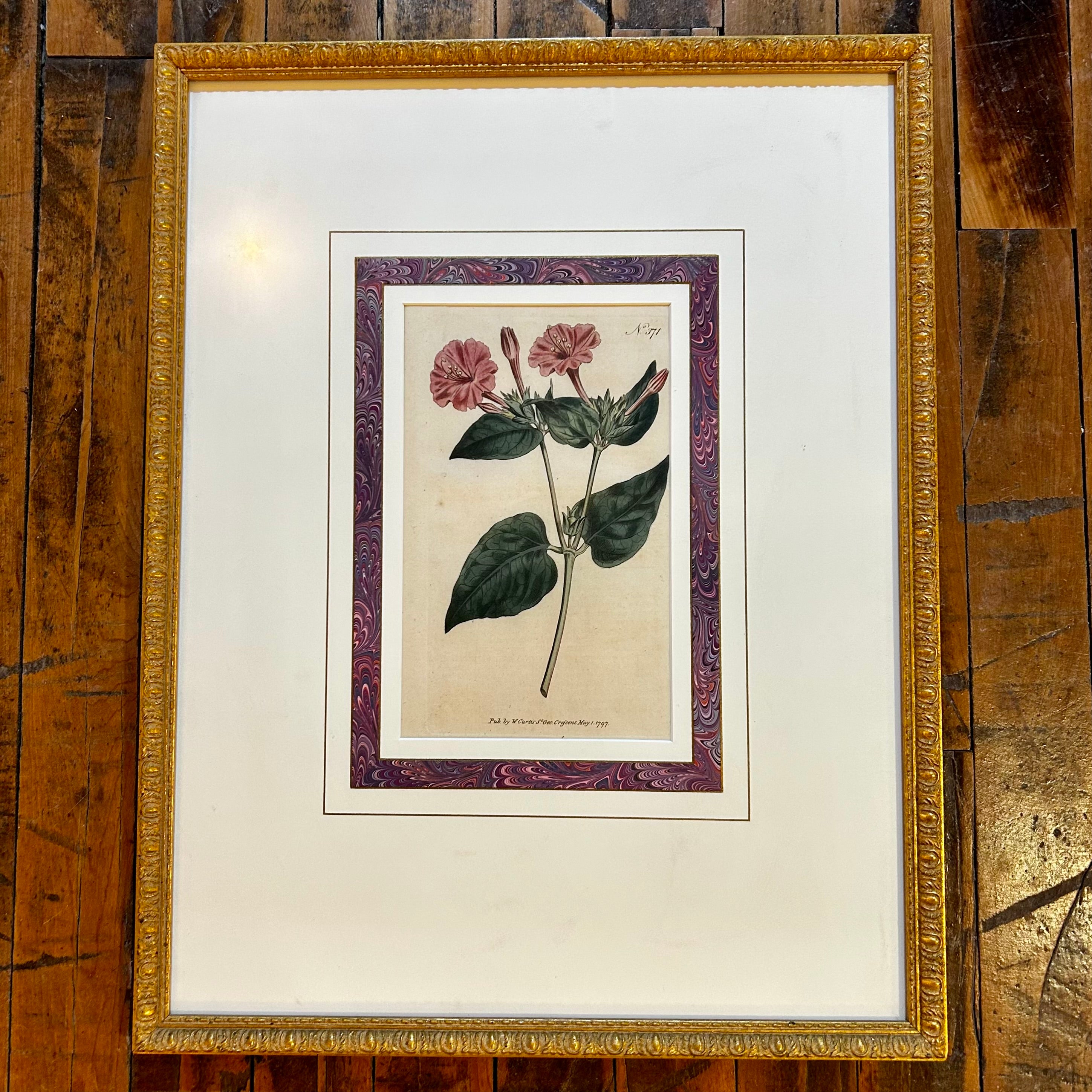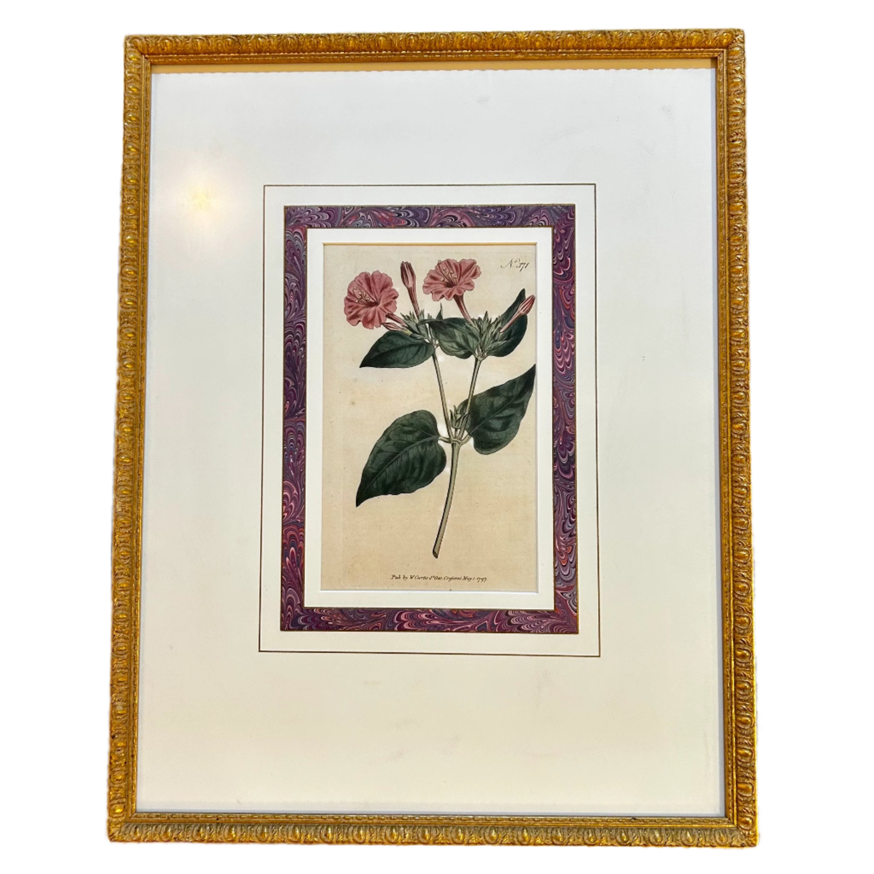 Framed and Matted Print, Botanic Pink Flower, Golden Frame, "No. 371", originally from 1797.