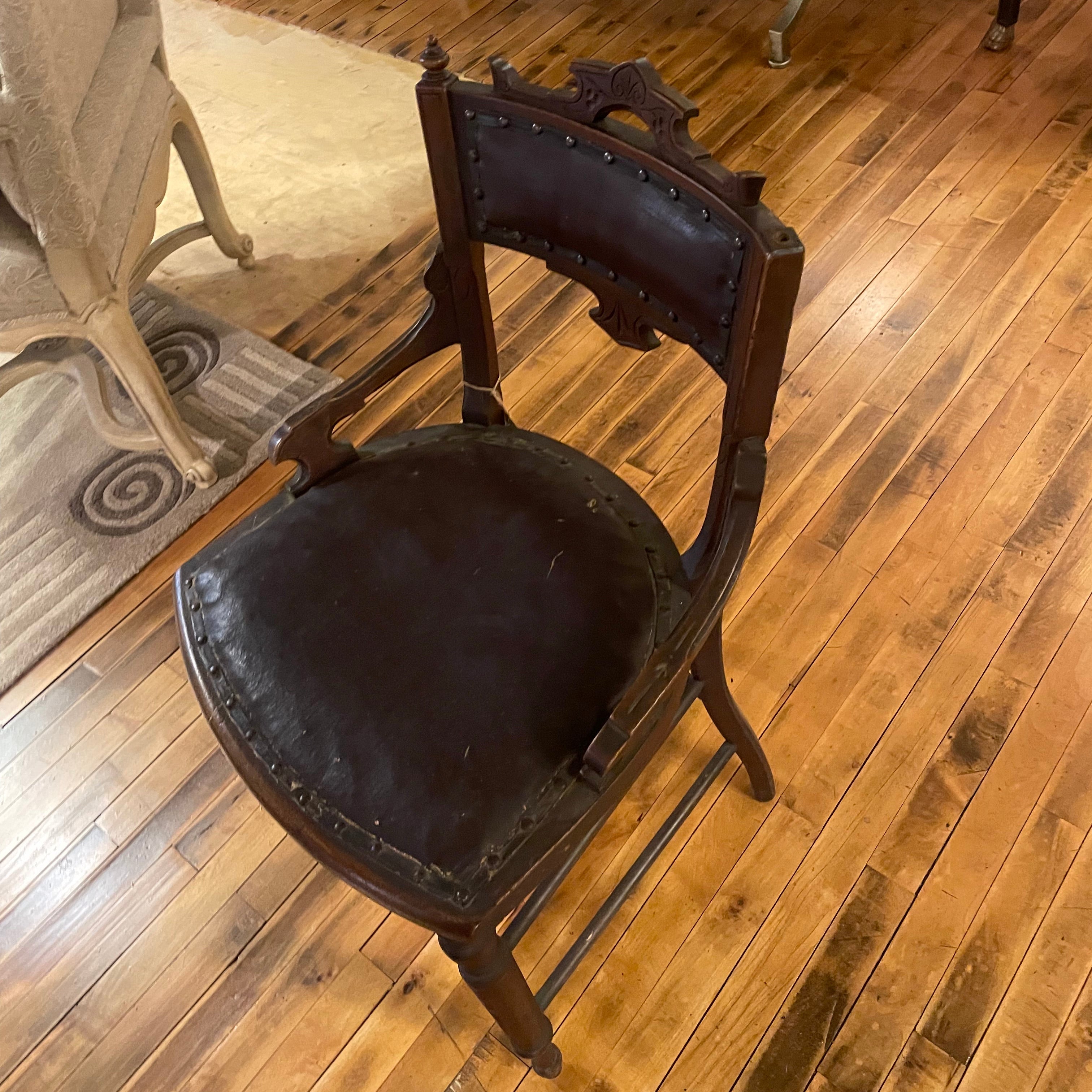 Vintage Victorian accent chair with brown naugahyde upholstery.