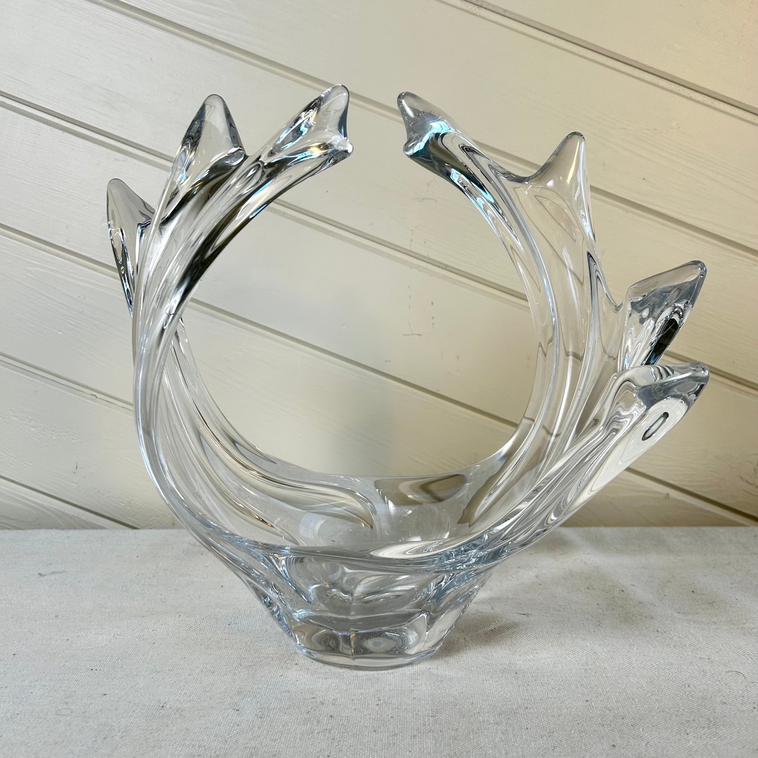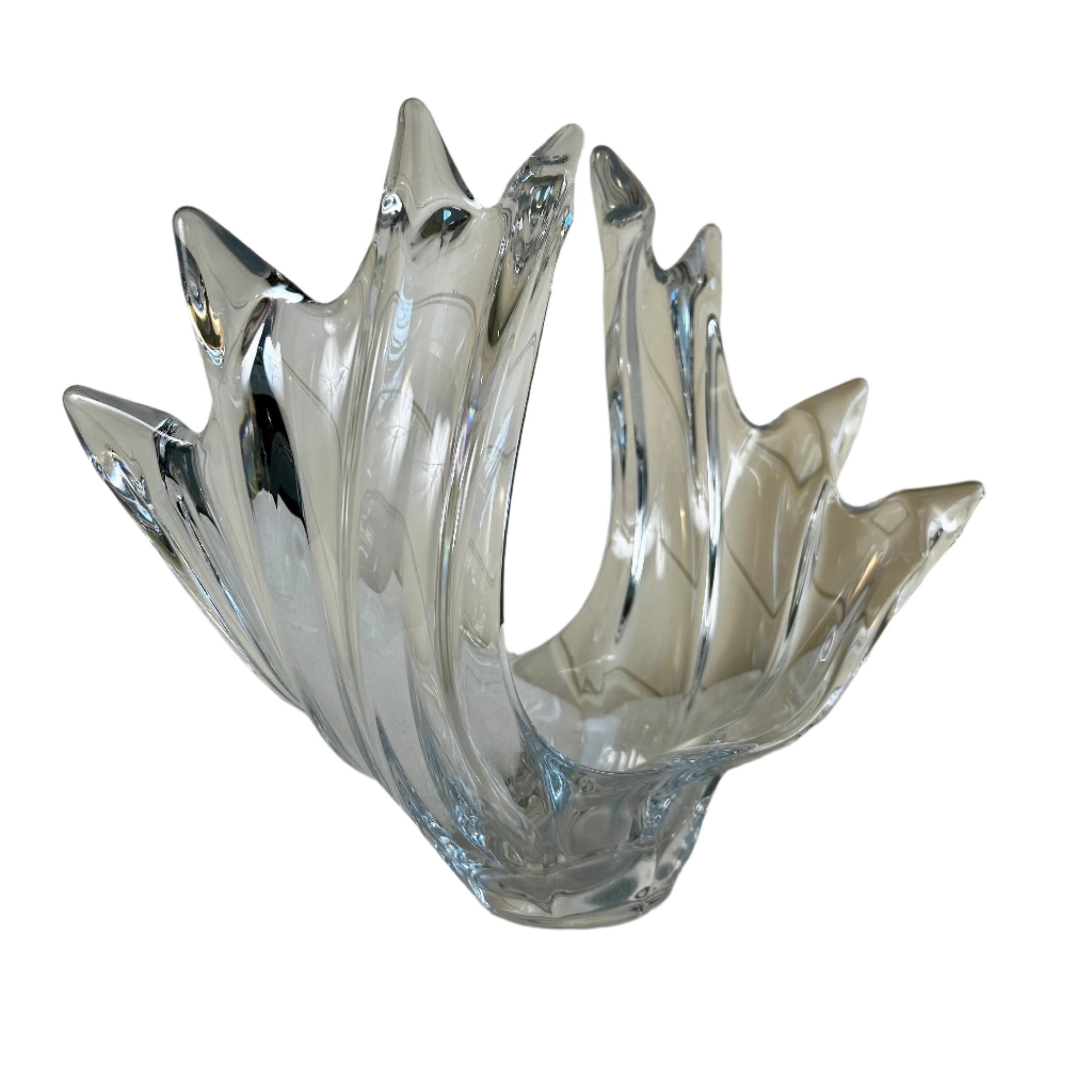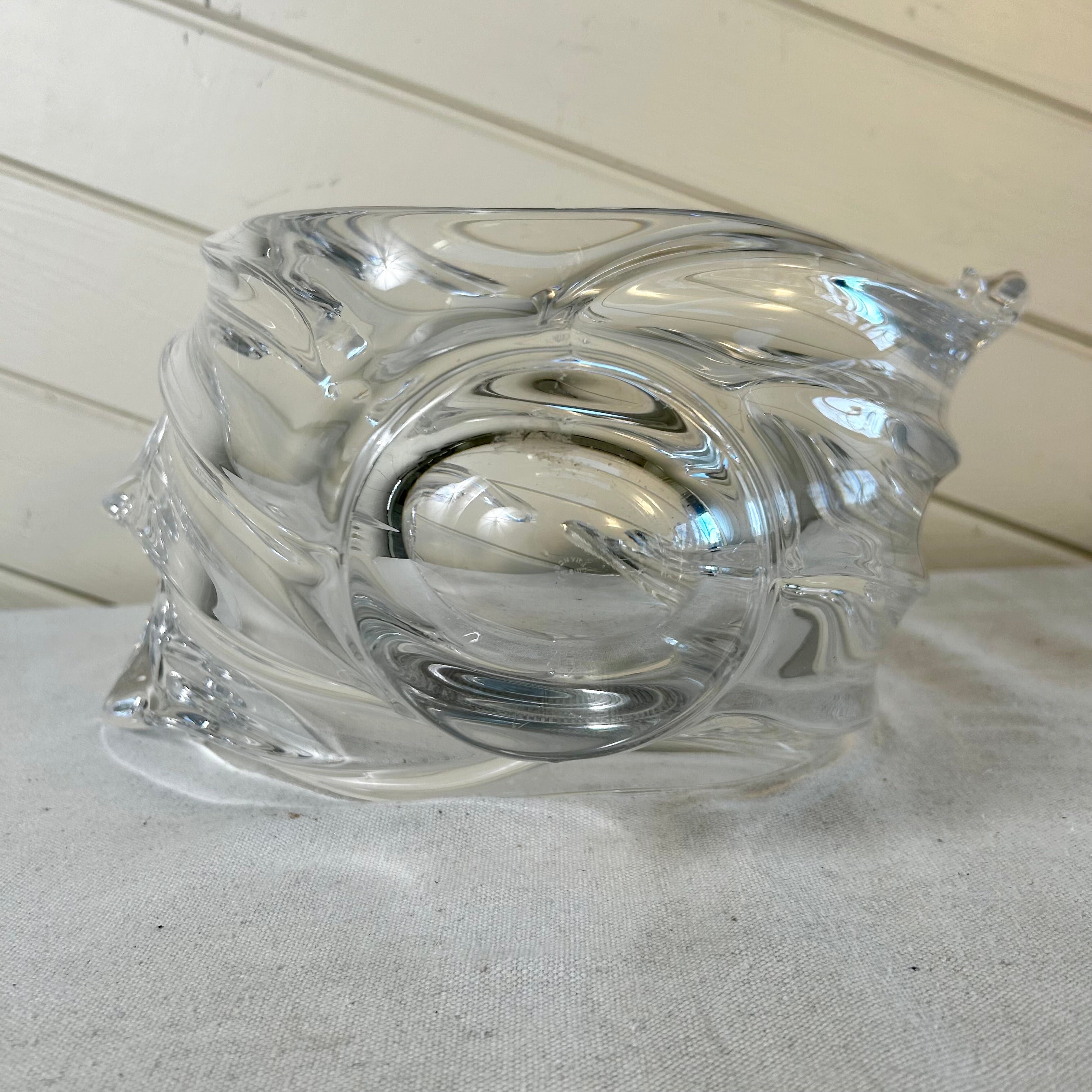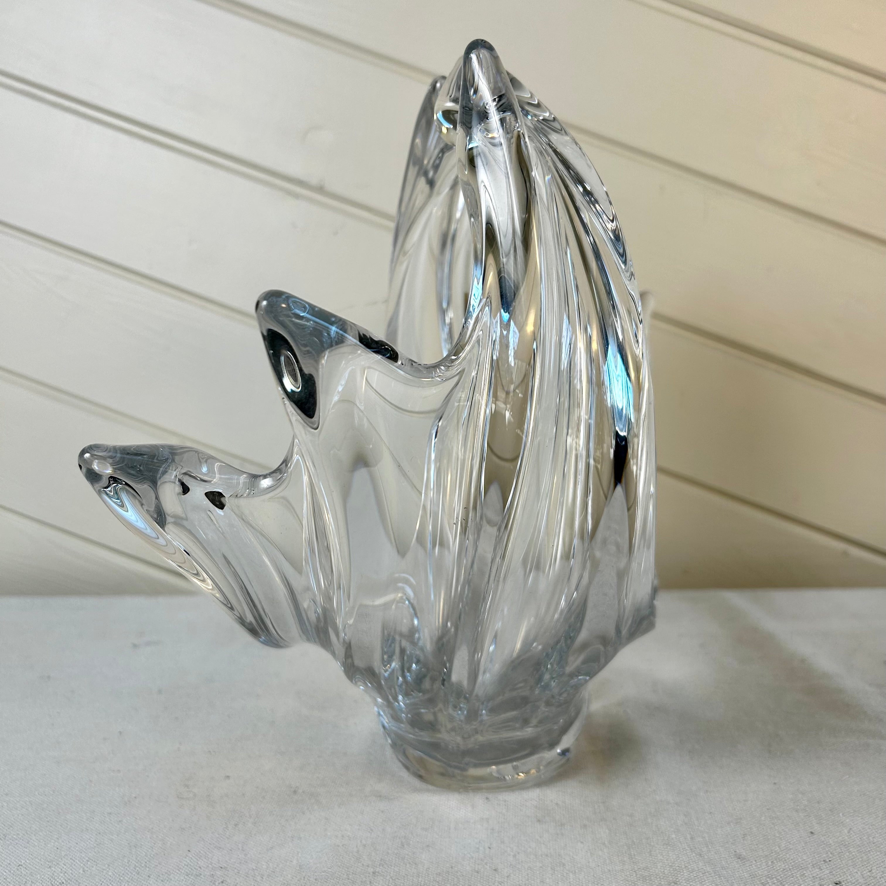 This stunning Vannes Le Chantel French crystal glass vase sculpture features a beautifully crafted bird in flight. Expertly designed and handcrafted, this piece showcases the exquisite artistry and craftsmanship of French crystal. The perfect addition to any home decor collection, this vase adds elegance and sophistication to any space. It has the stamp on the bottom.