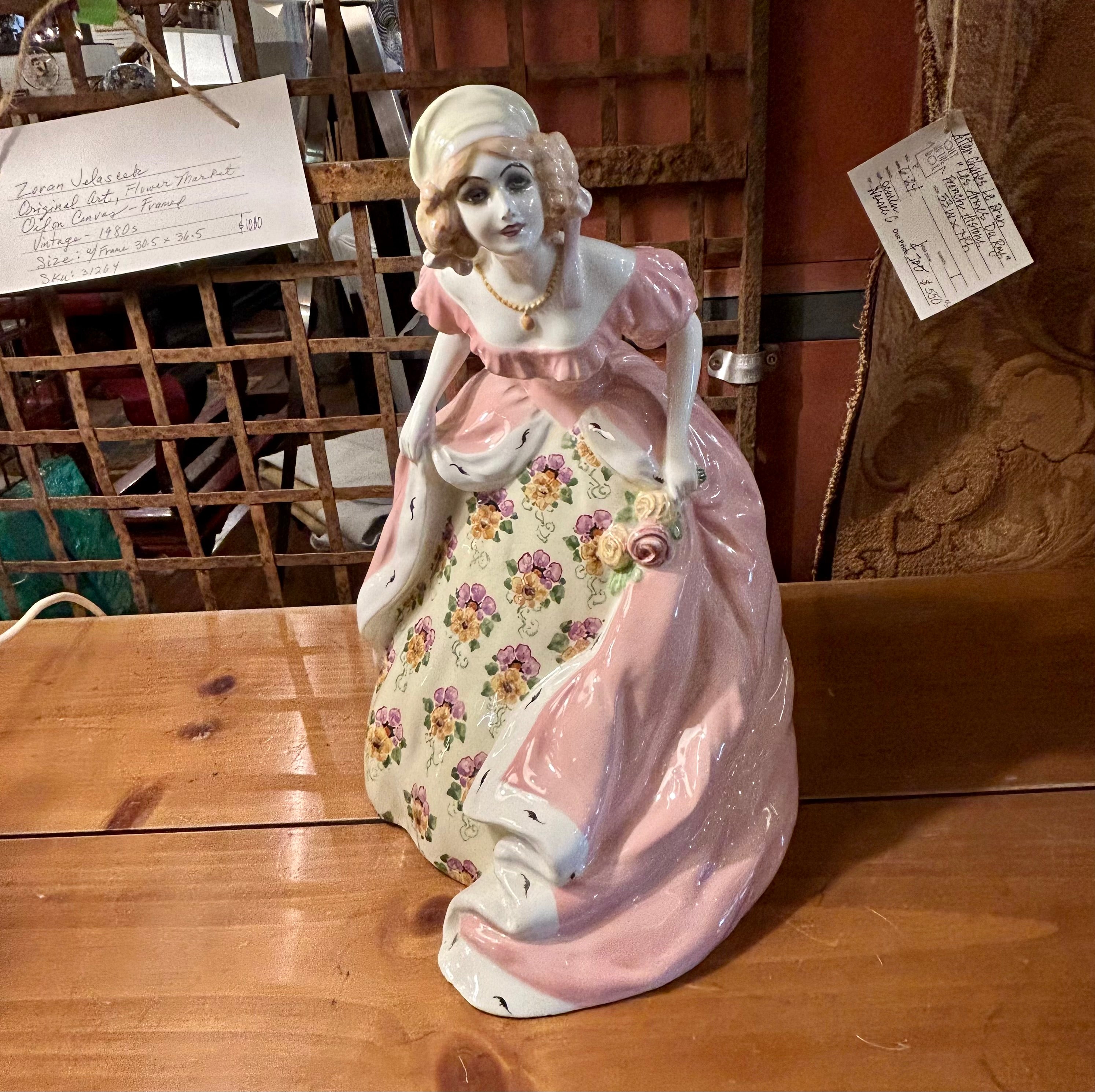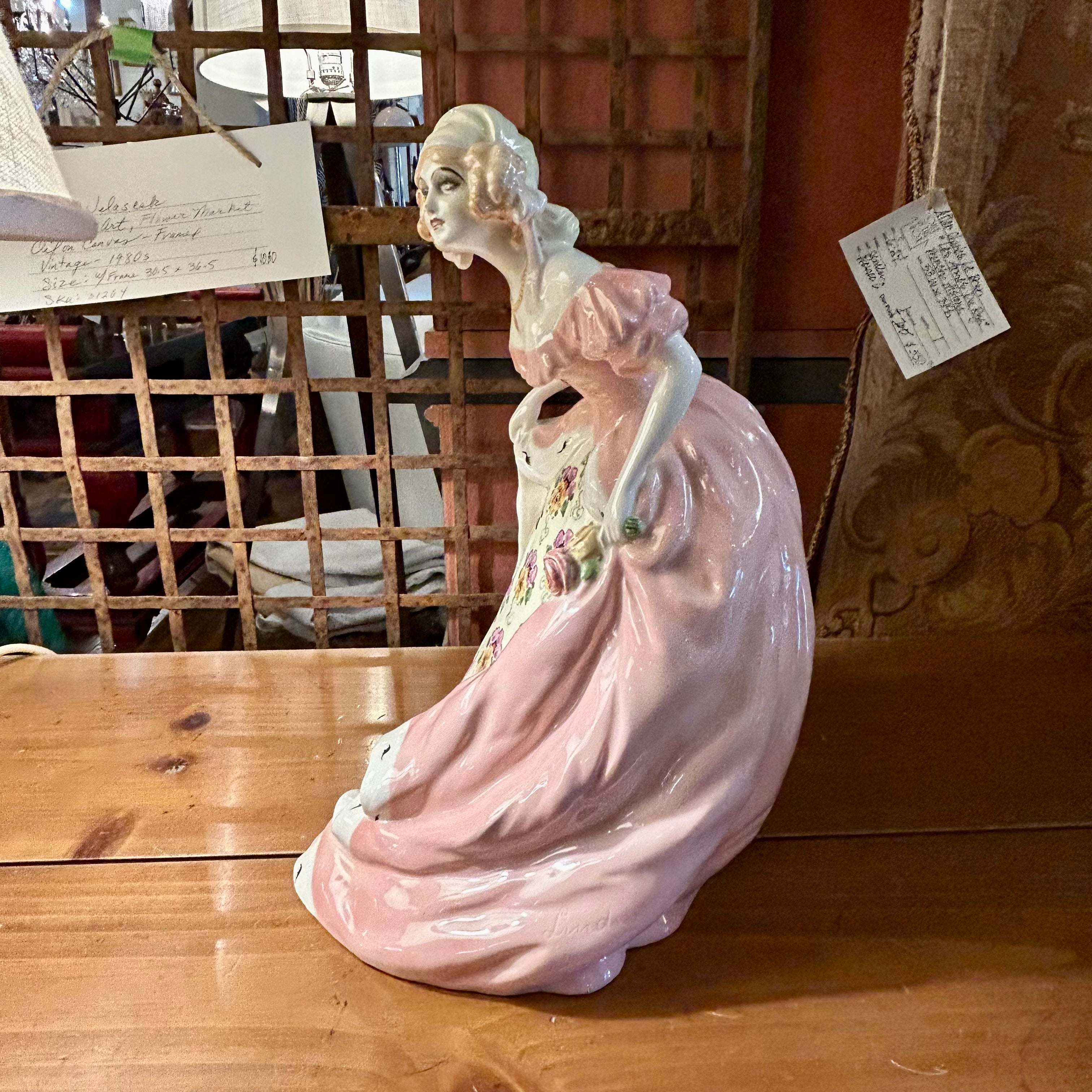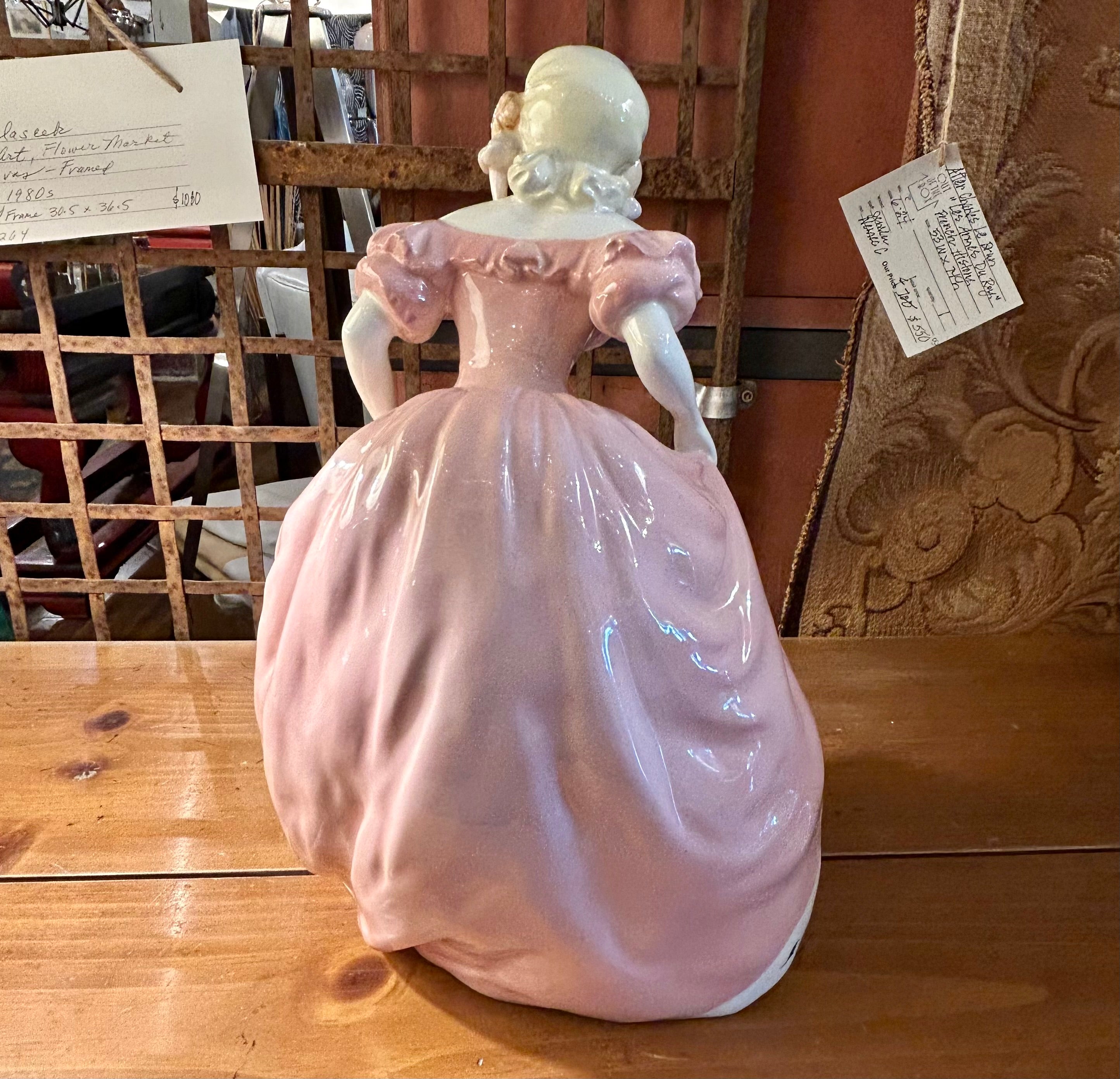 Antique Goldscheider figurine of a young lady in a pink dress, hand crafted in porcelaine. Hand painted.
