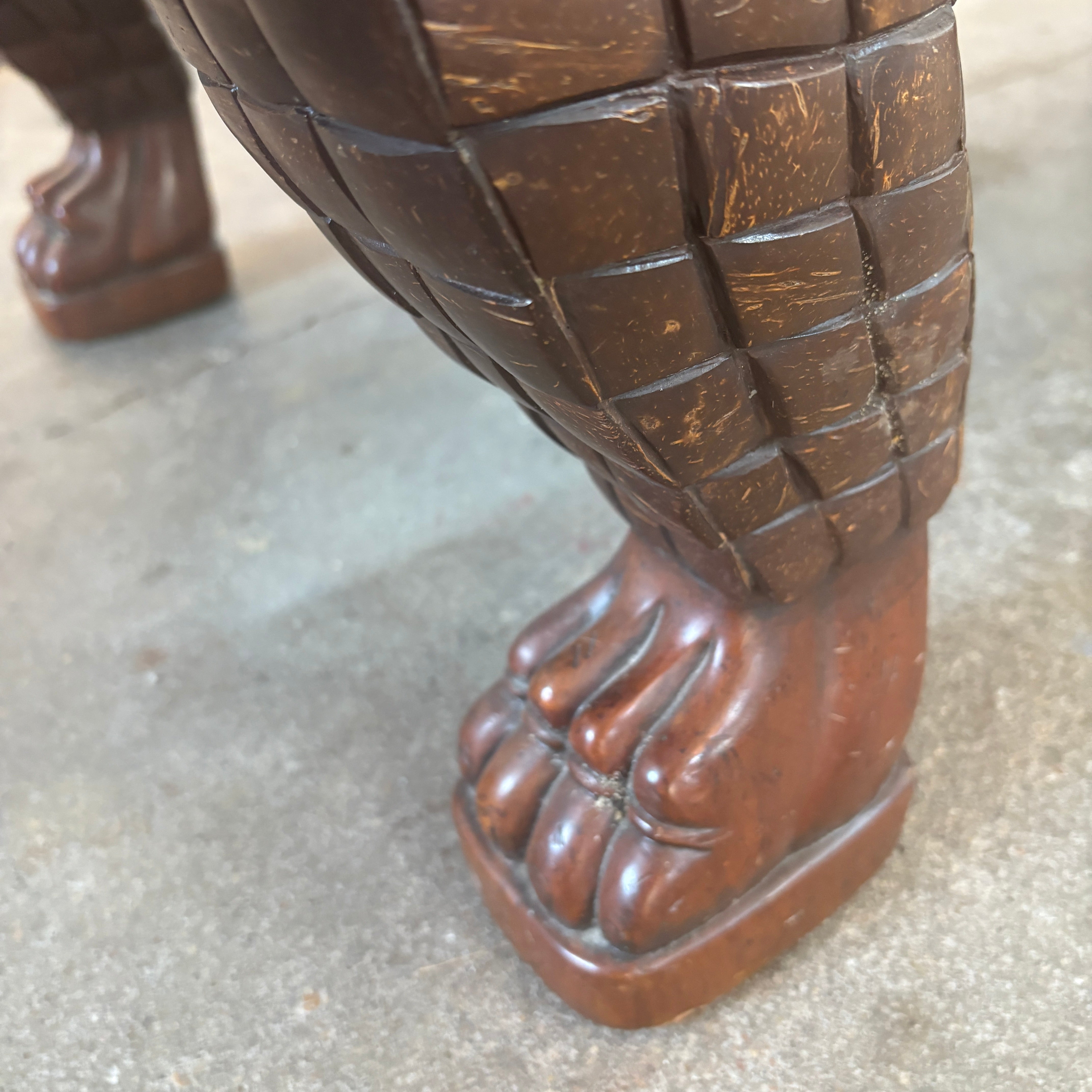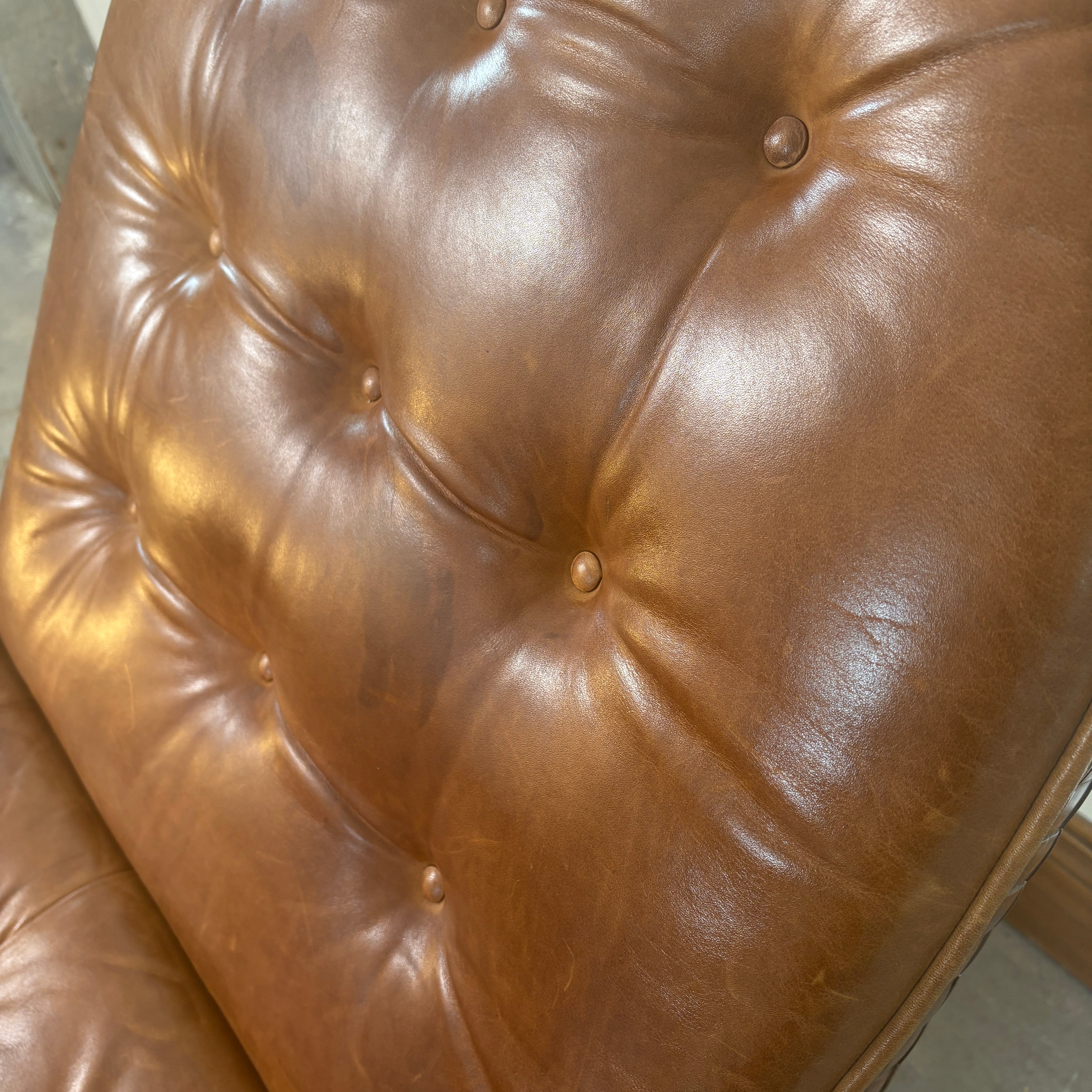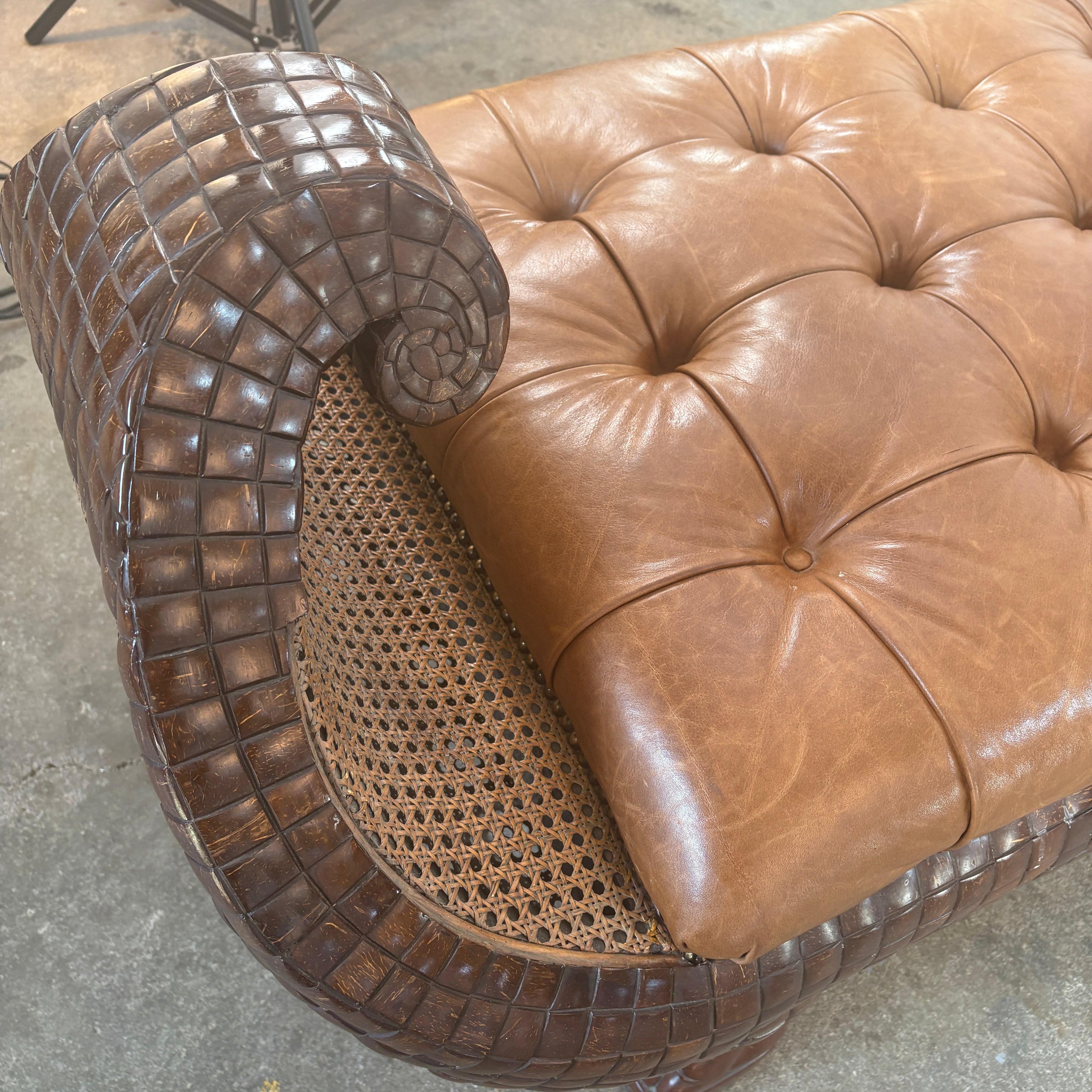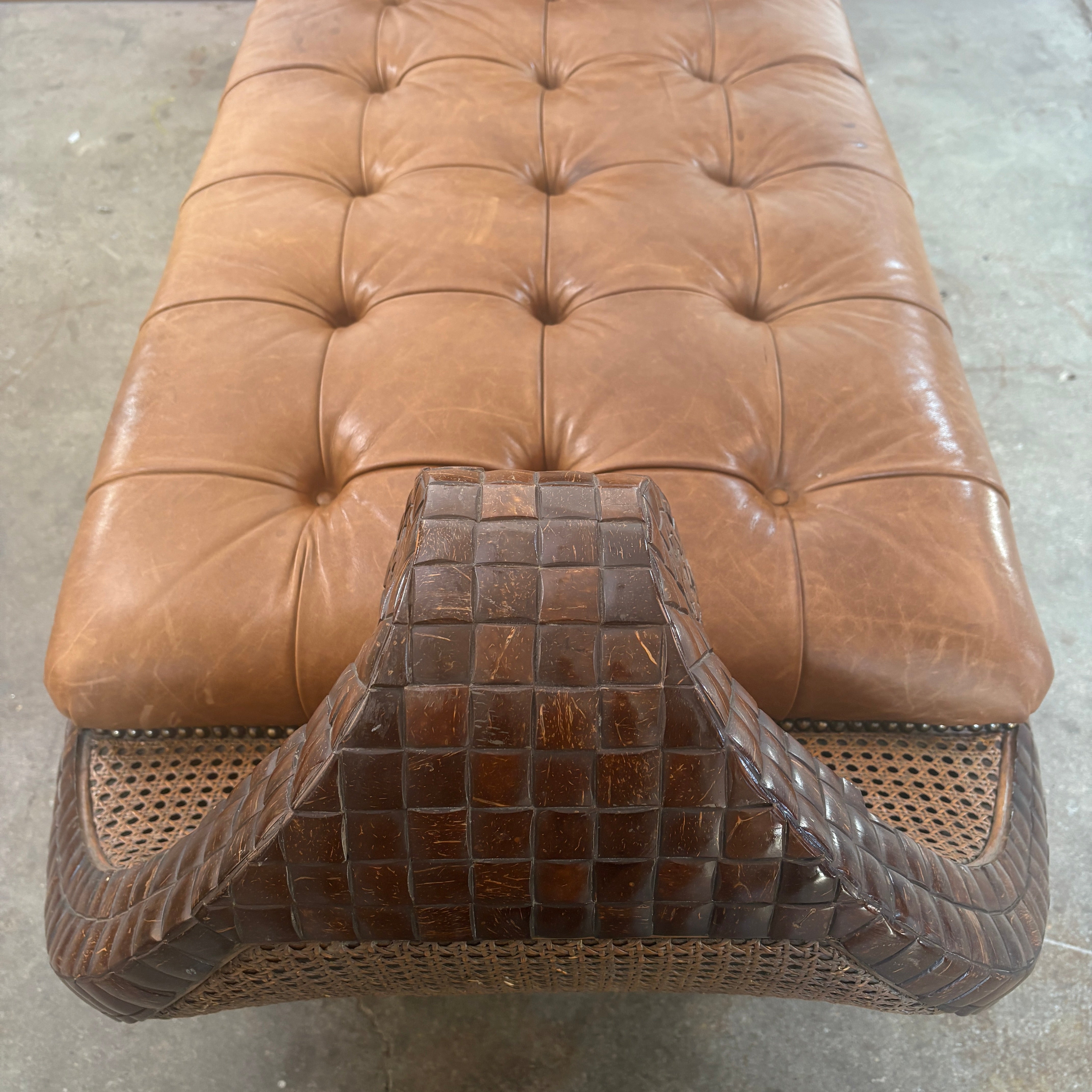 Gondola Style Chaise Tufted Leather Upholstery Case Constructed in Wood and Cane with Coconut Shell Veneer and Claw Feet.