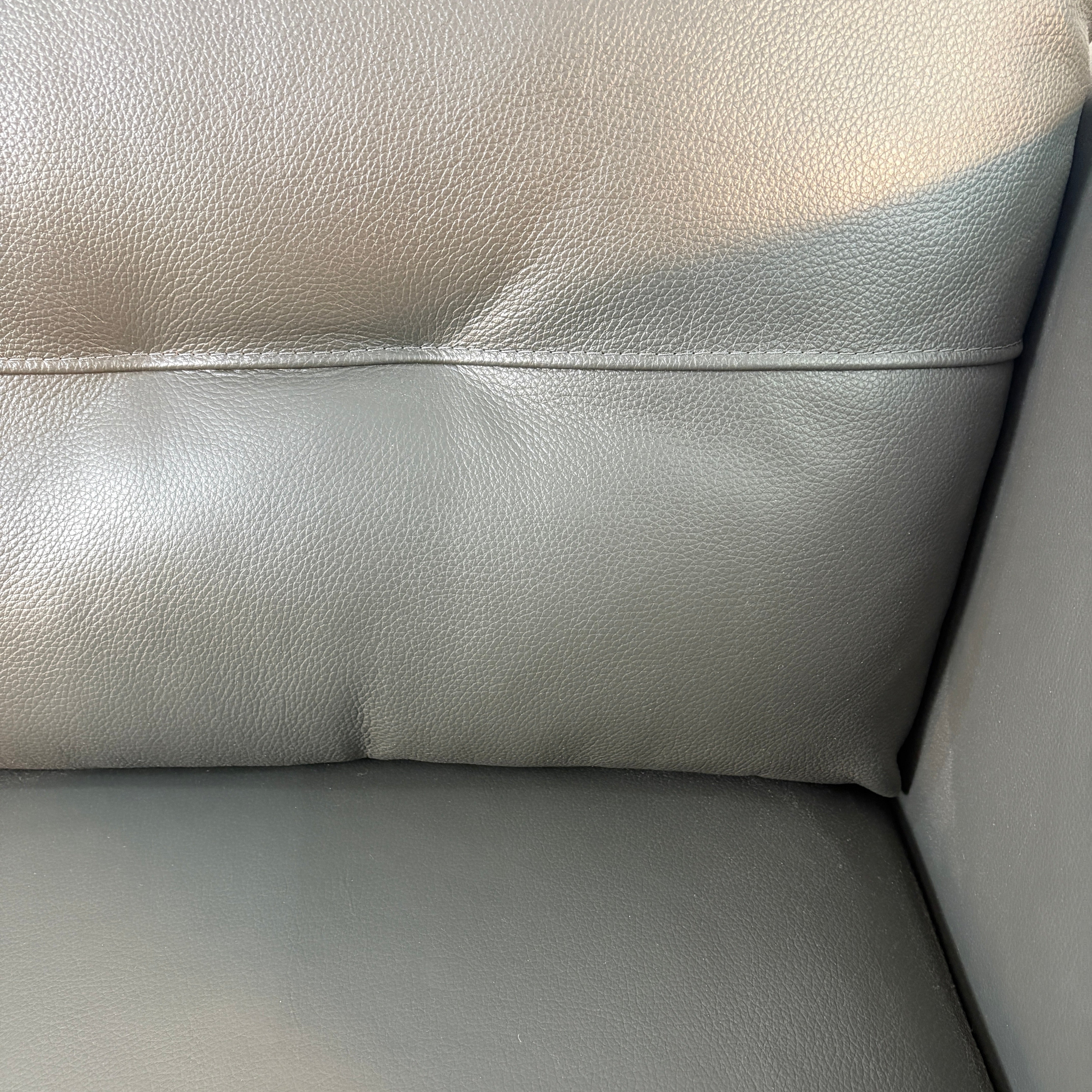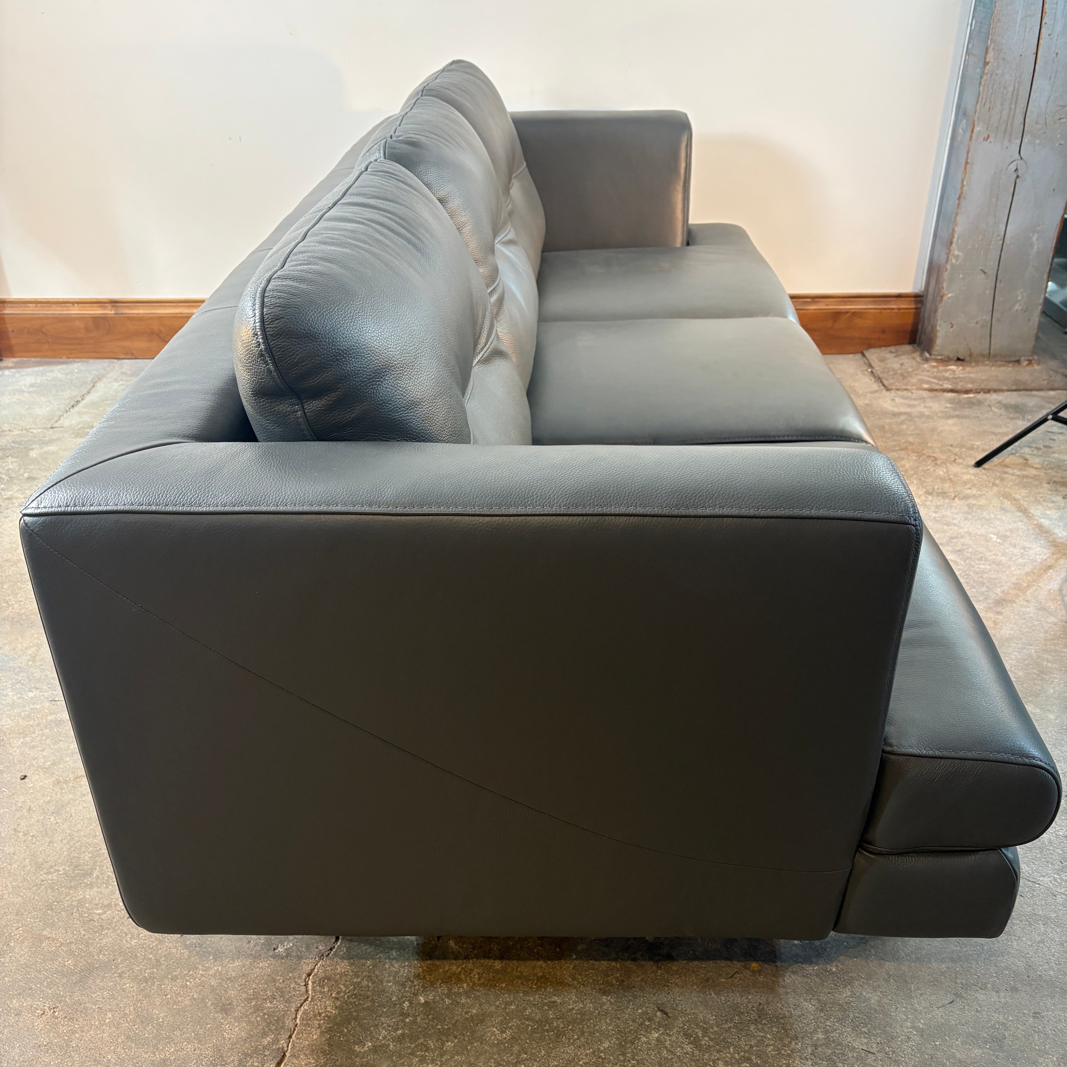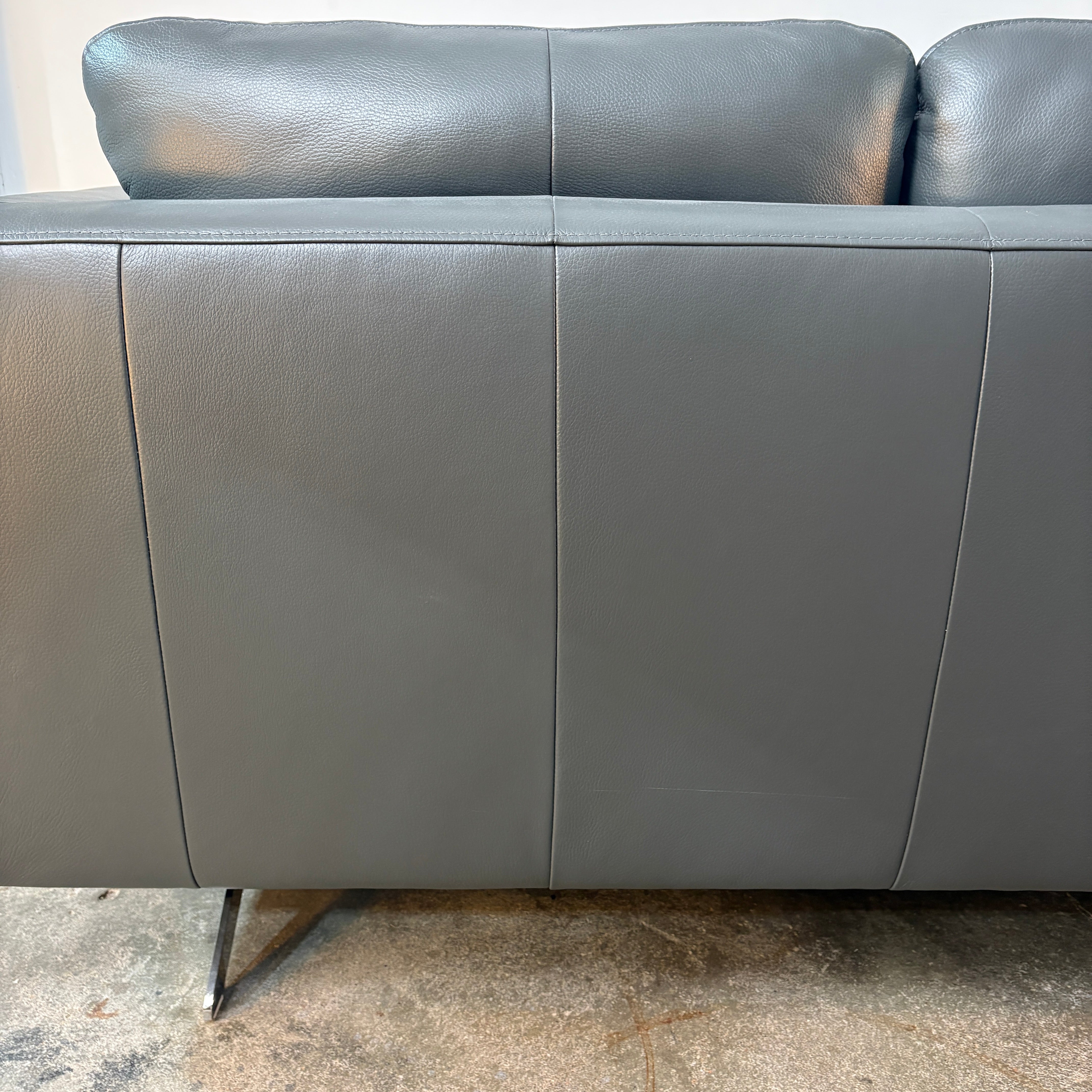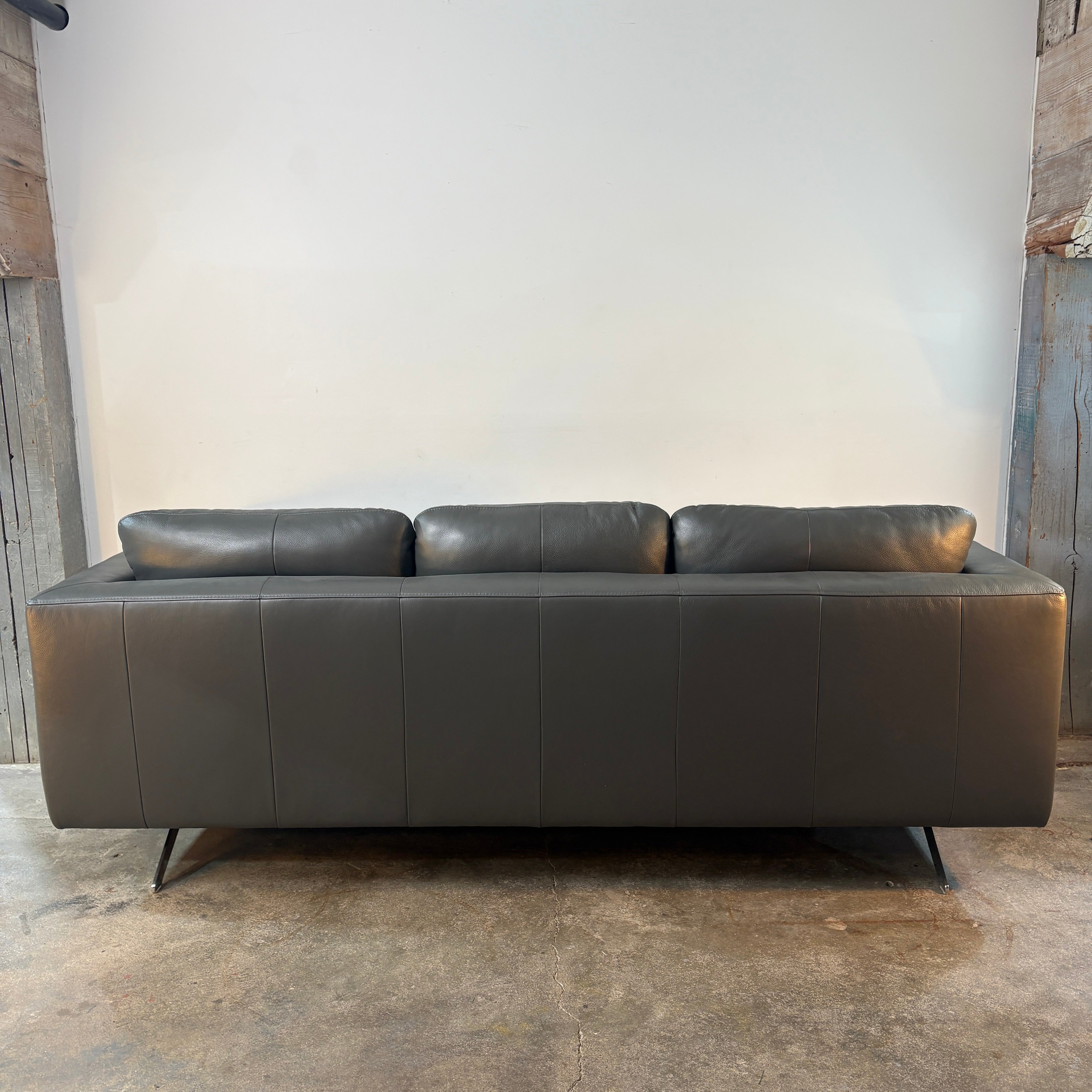 Gray-Green Leather Sofa Modern Styling with Track Arm and Chrome Legs.