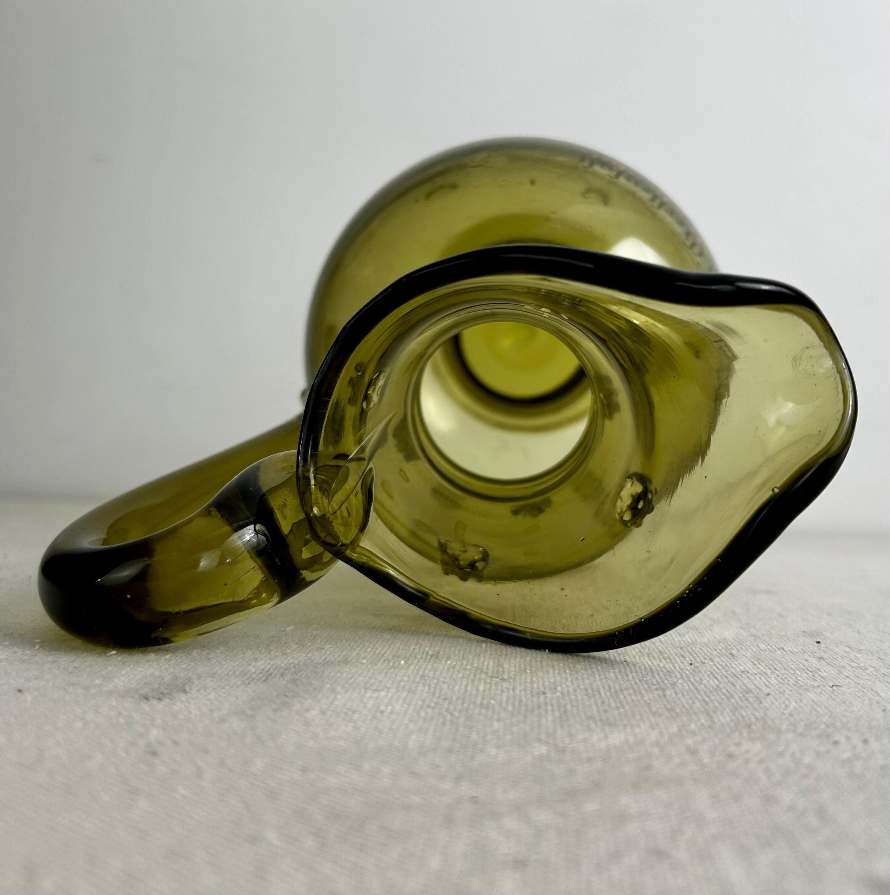 Hand-blown olive green glass German pitcher with German script in gold writing.