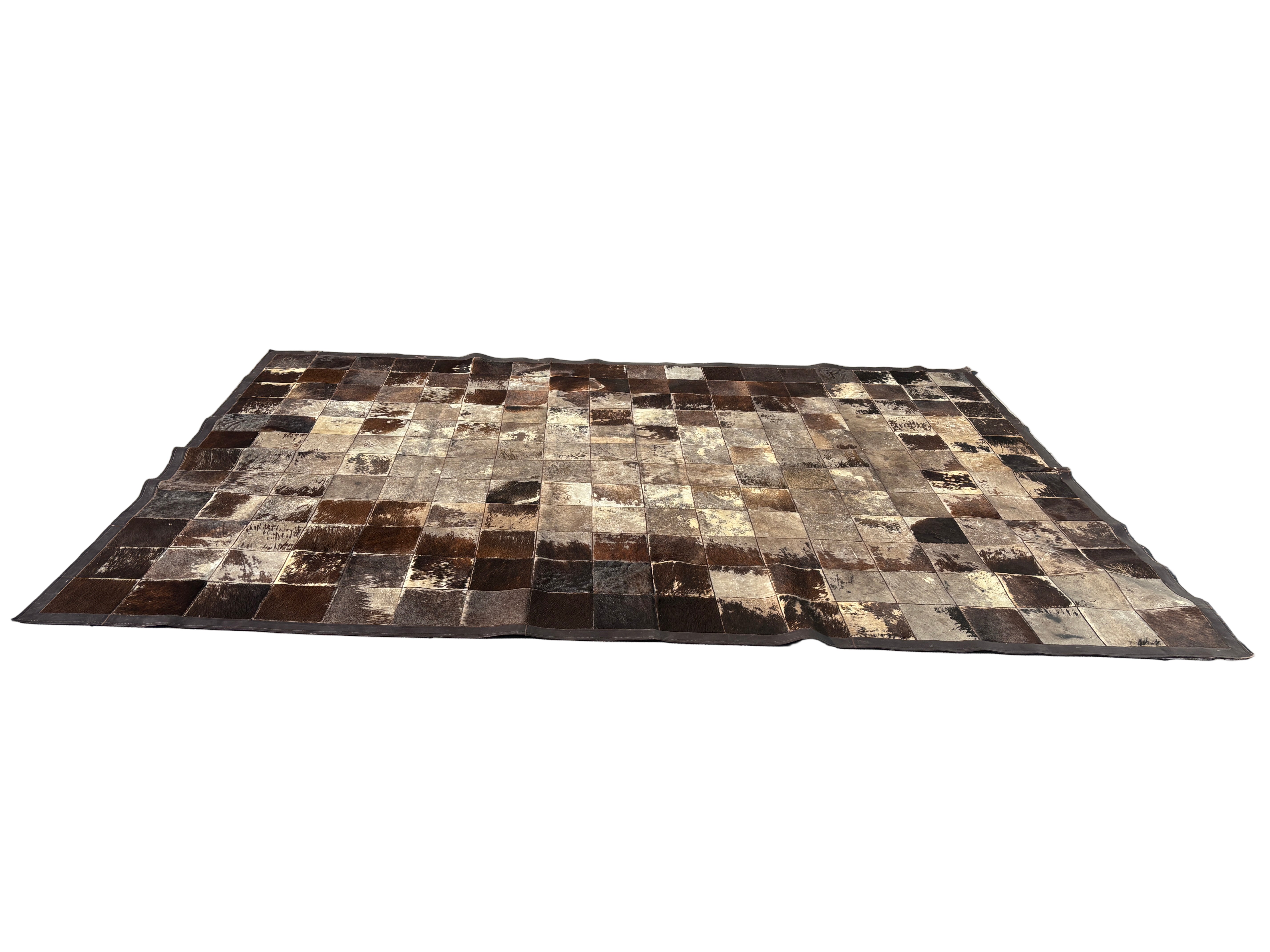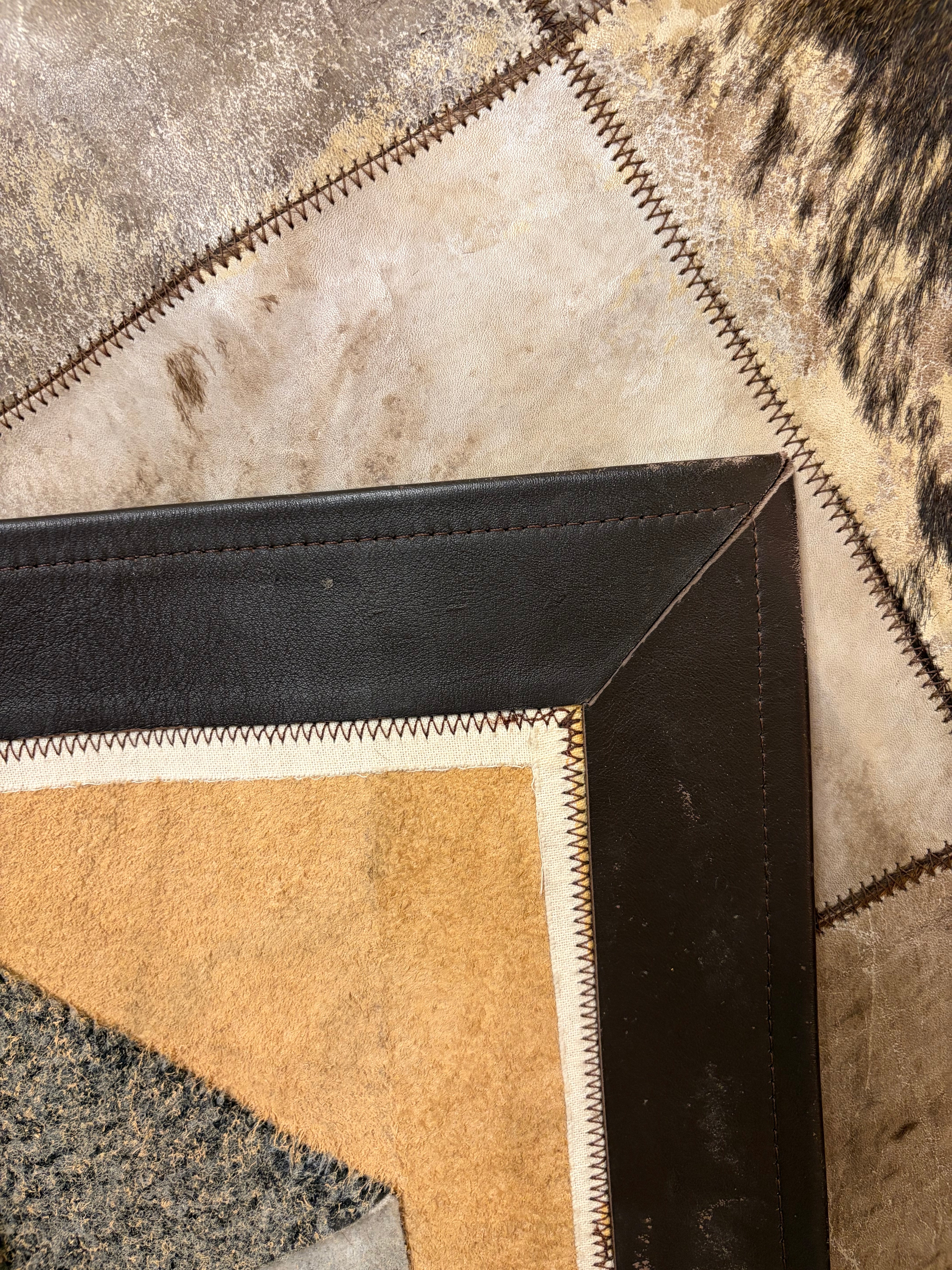 Hair on Hide Large Patchwork Area Rug, Leather Taupe & Brown Tones with Leather Edge Trim. It Has a Felt Backing. Rectangle in Shape.