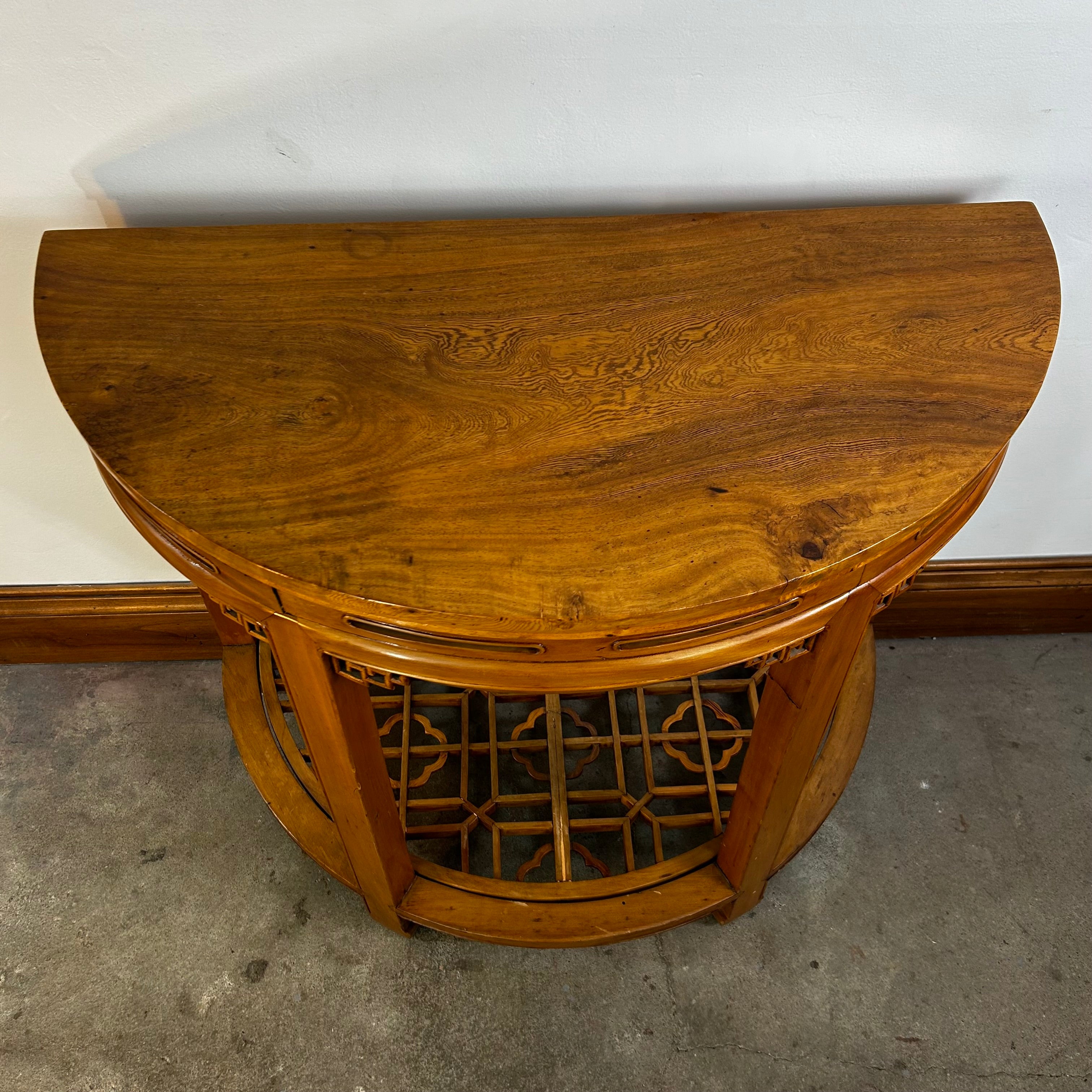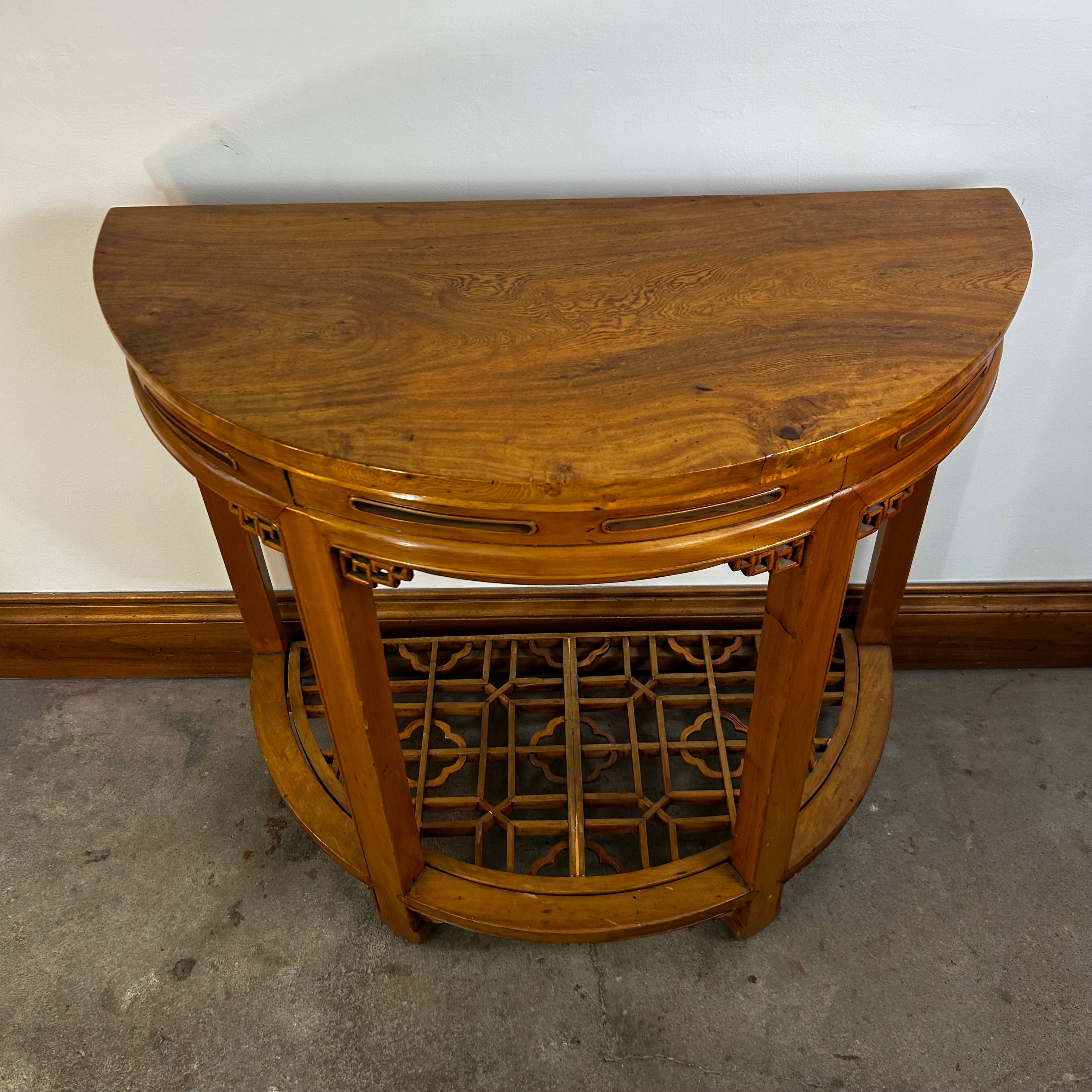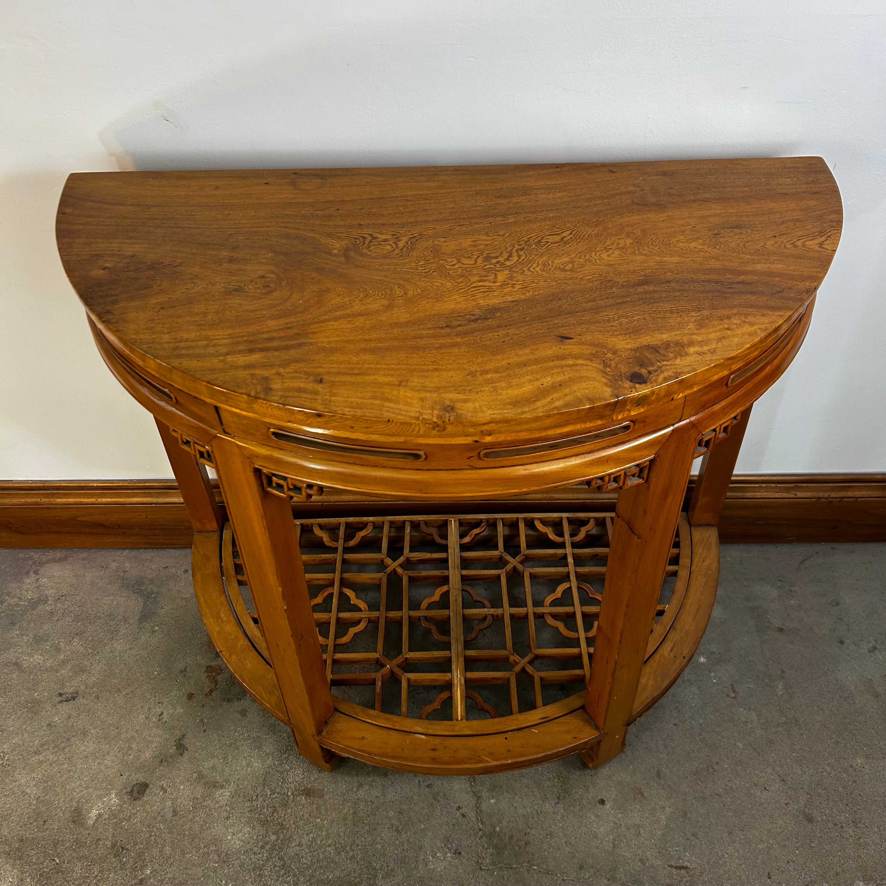 This Half Moon Wall Table features an Asian design and is expertly crafted in solid wood with a honey brown stain. Please note that while these tables are sold individually, they can also be joined together to create one larger table (see gallery images).