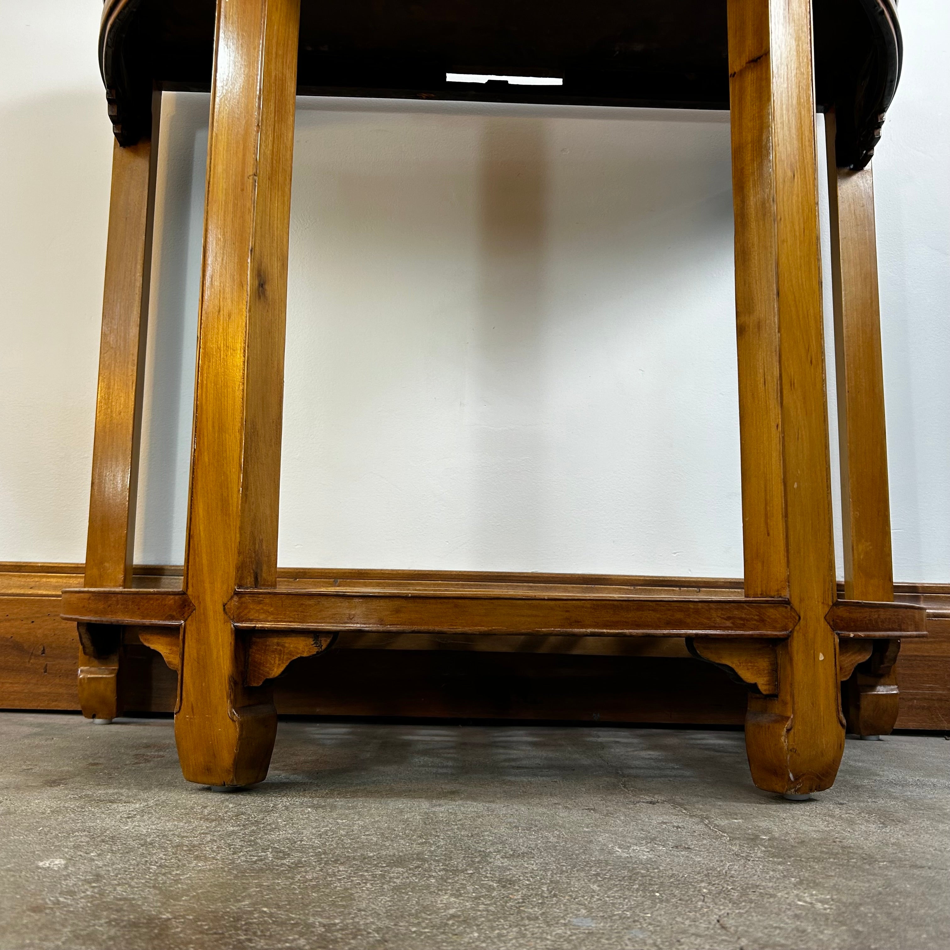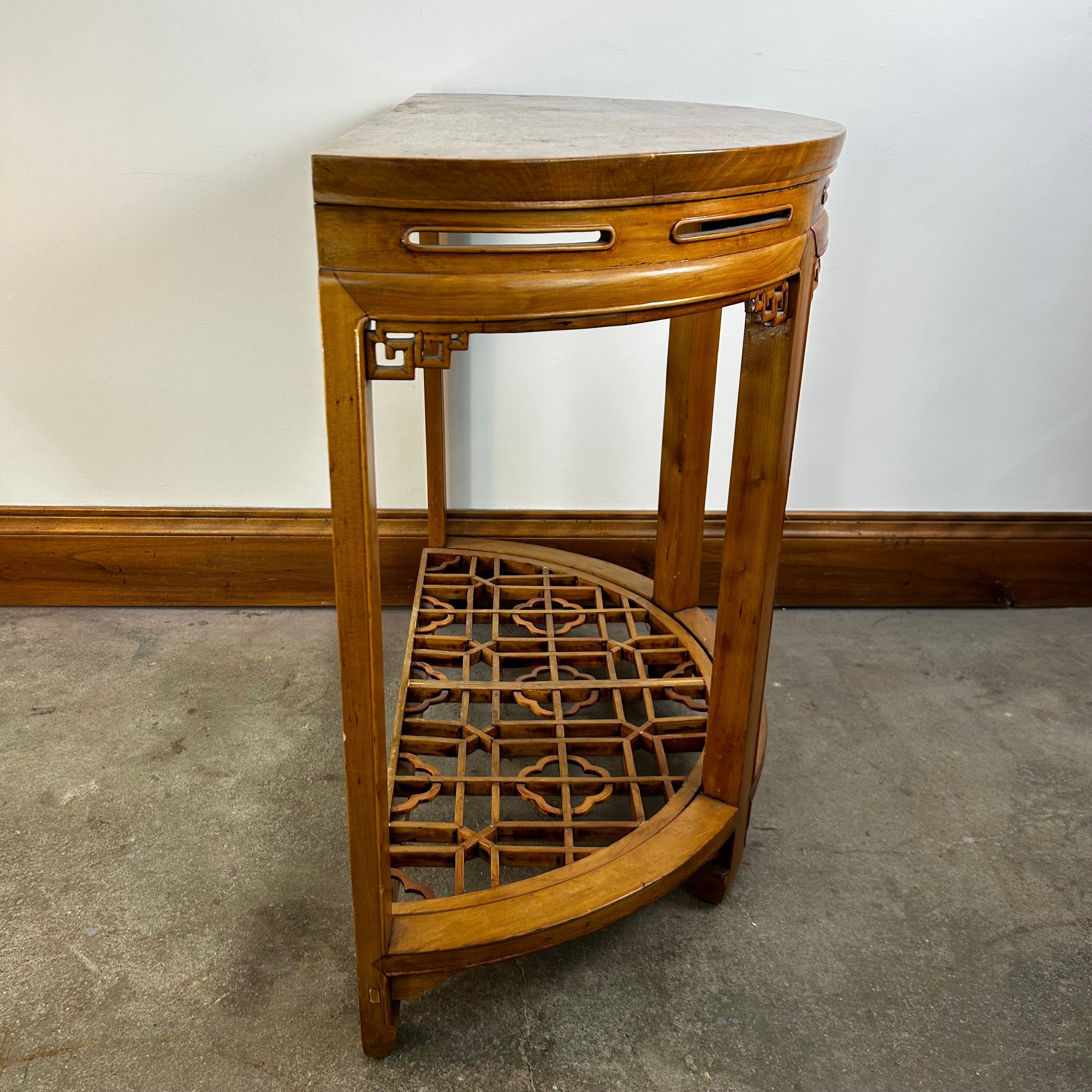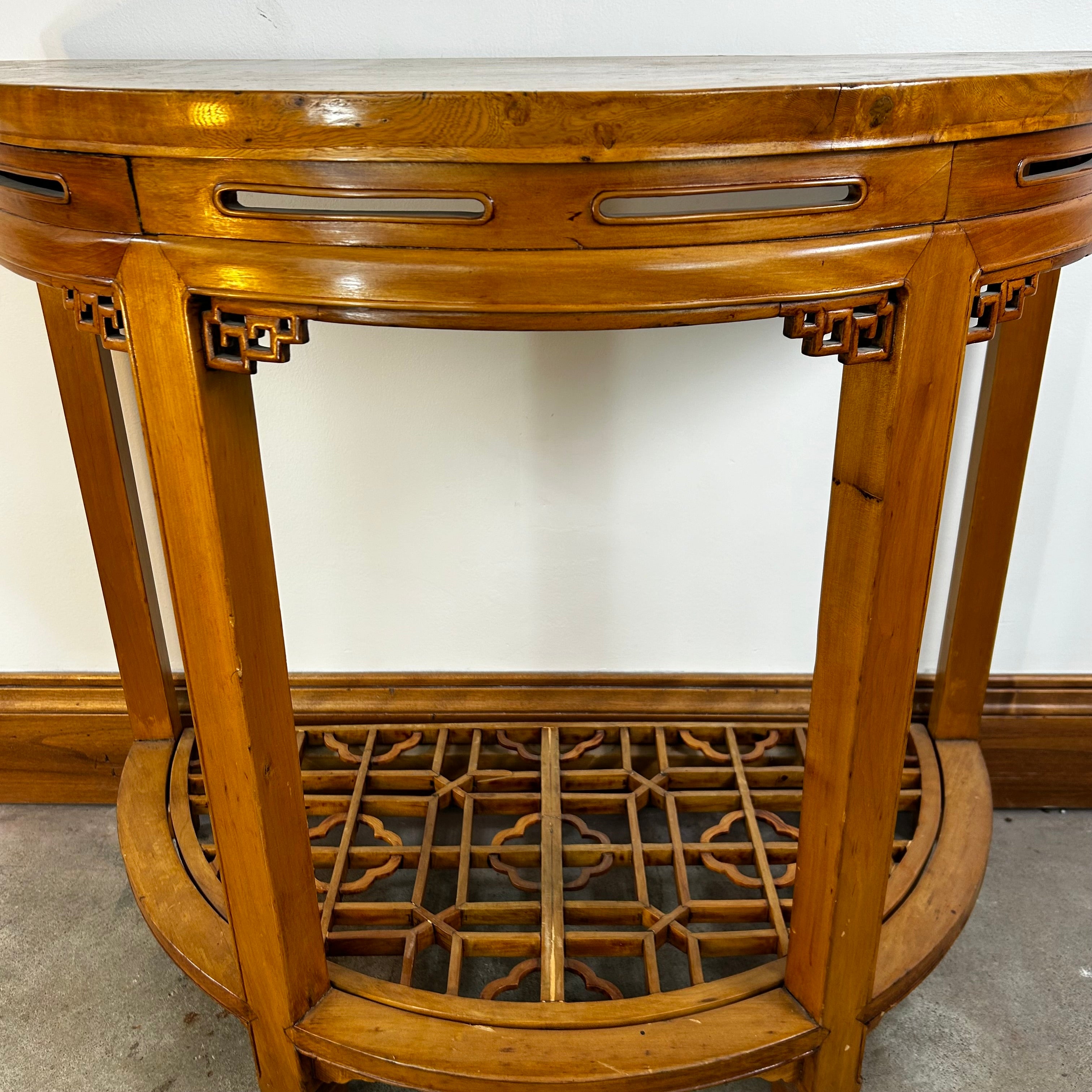 This Half Moon Wall Table features an Asian design and is expertly crafted in solid wood with a honey brown stain. Please note that while these tables are sold individually, they can also be joined together to create one larger table (see gallery images).