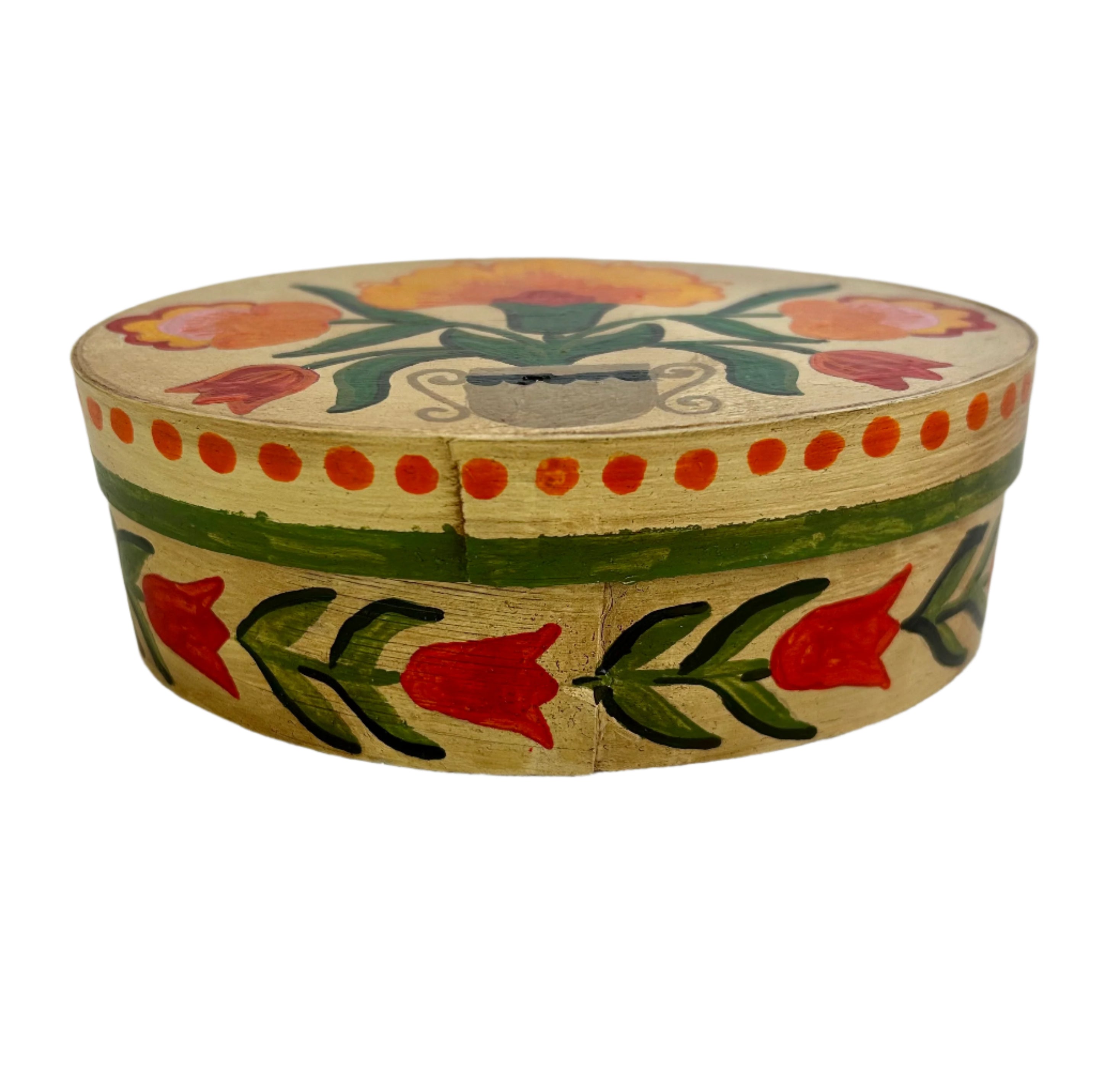 Hand painted oval wood wedding box with lid, with mixed flowers, beige background, German.