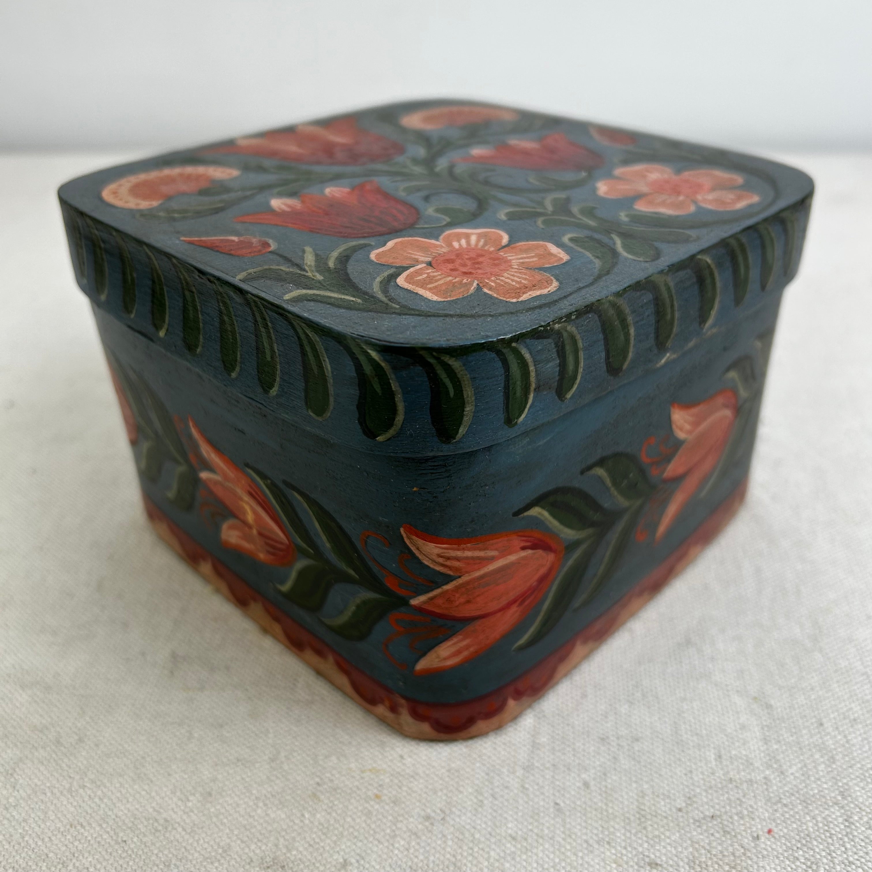 Hand Painted Wood Wedding Box, Mixed Flowers on Blue Green, German.