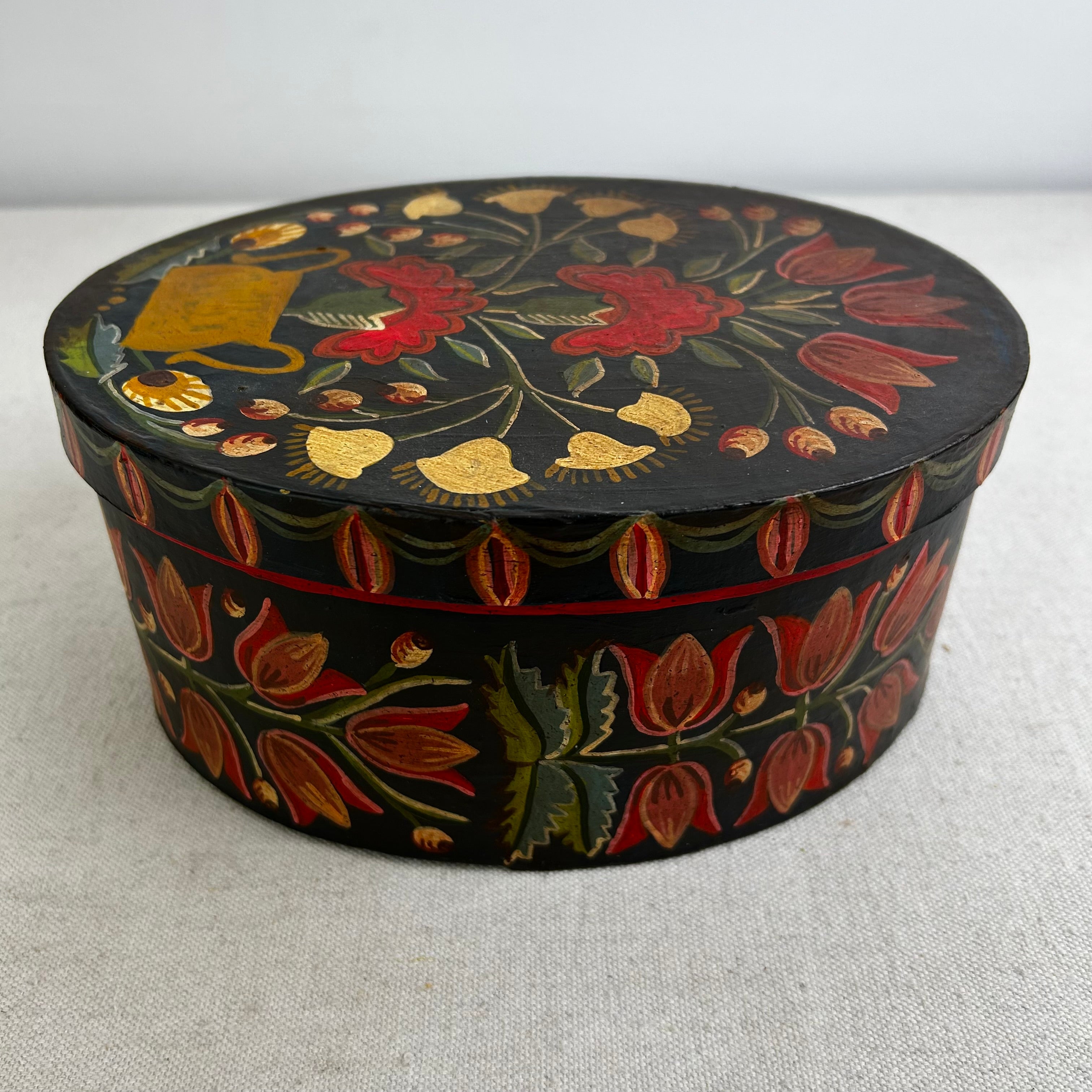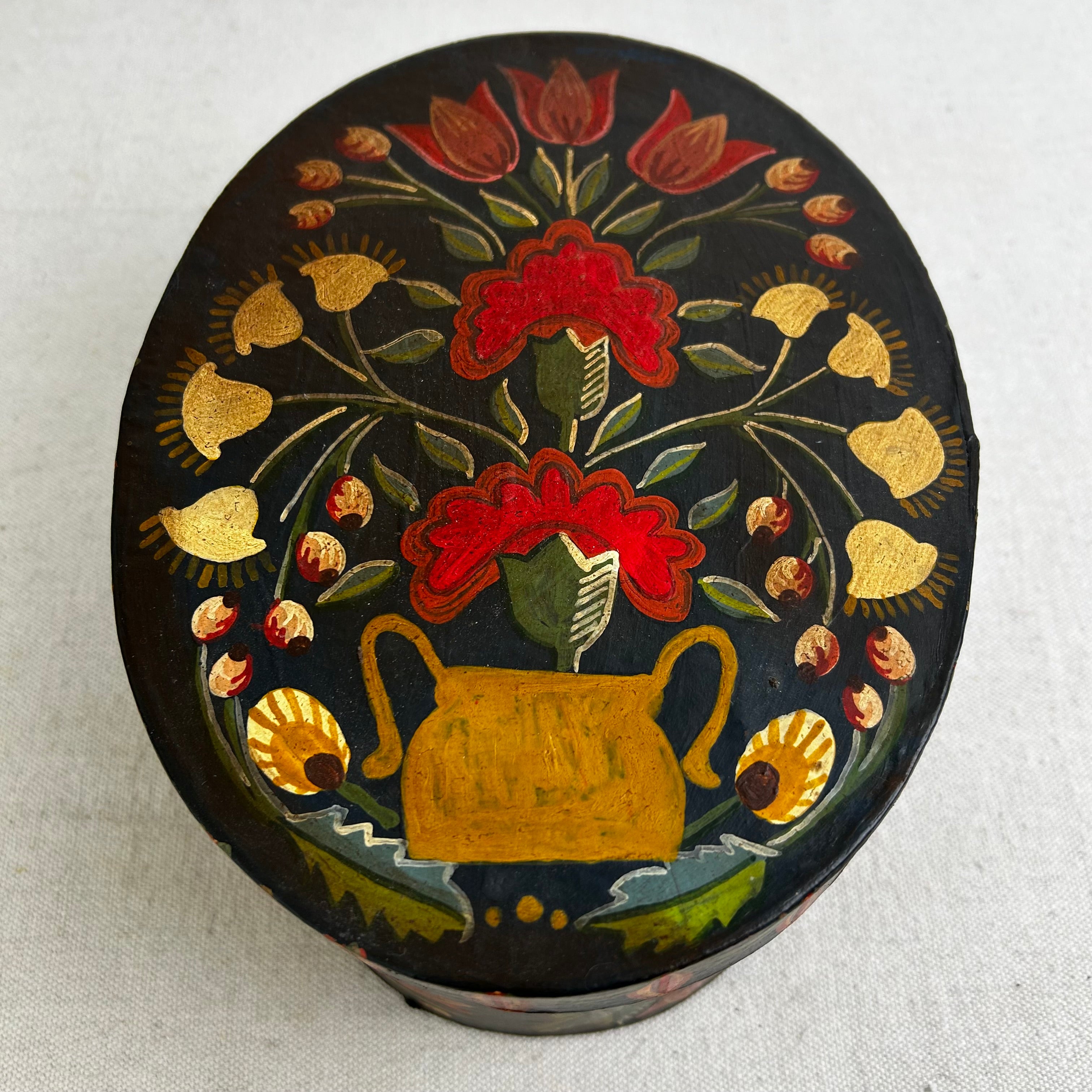 Hand Painted Wood Box with Lid, Oval, Floral, Dark Green Background, Germany