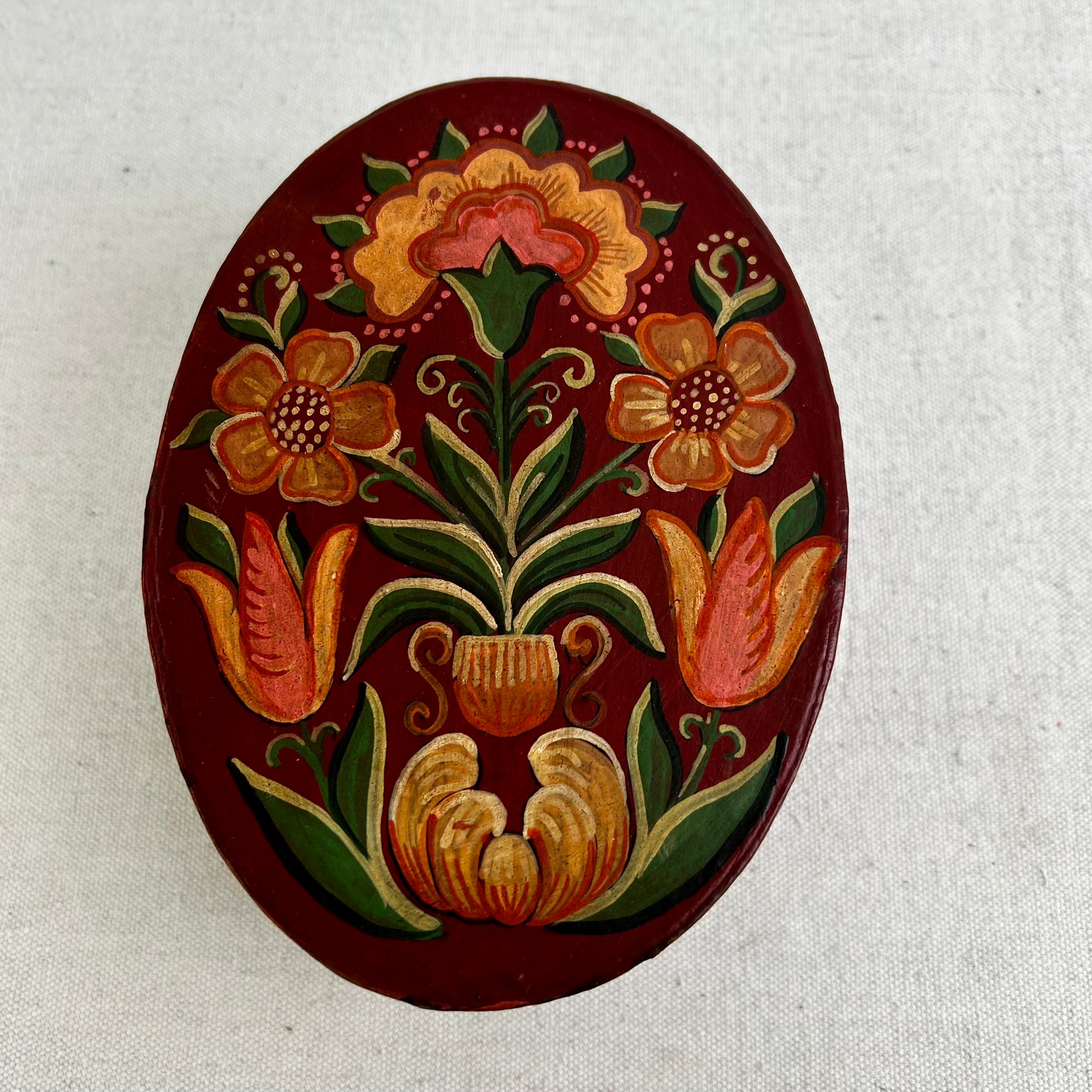 Hand Painted Wood Oval Wedding Box with mixed flowers and red background, Made in Germany