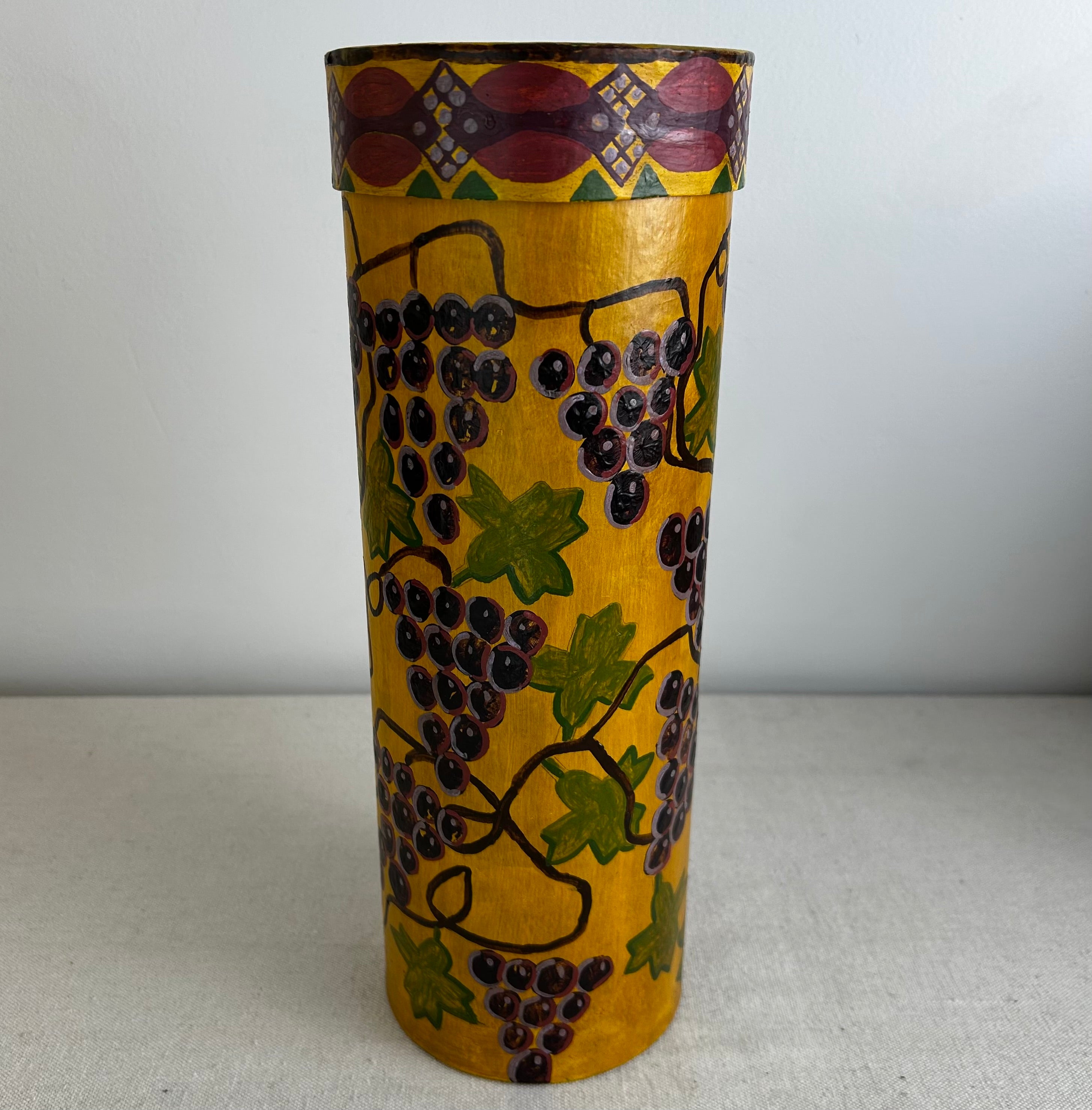 Hand painted cylinder shaped wood wine box with lid, painted grapes, crafted in Germany.