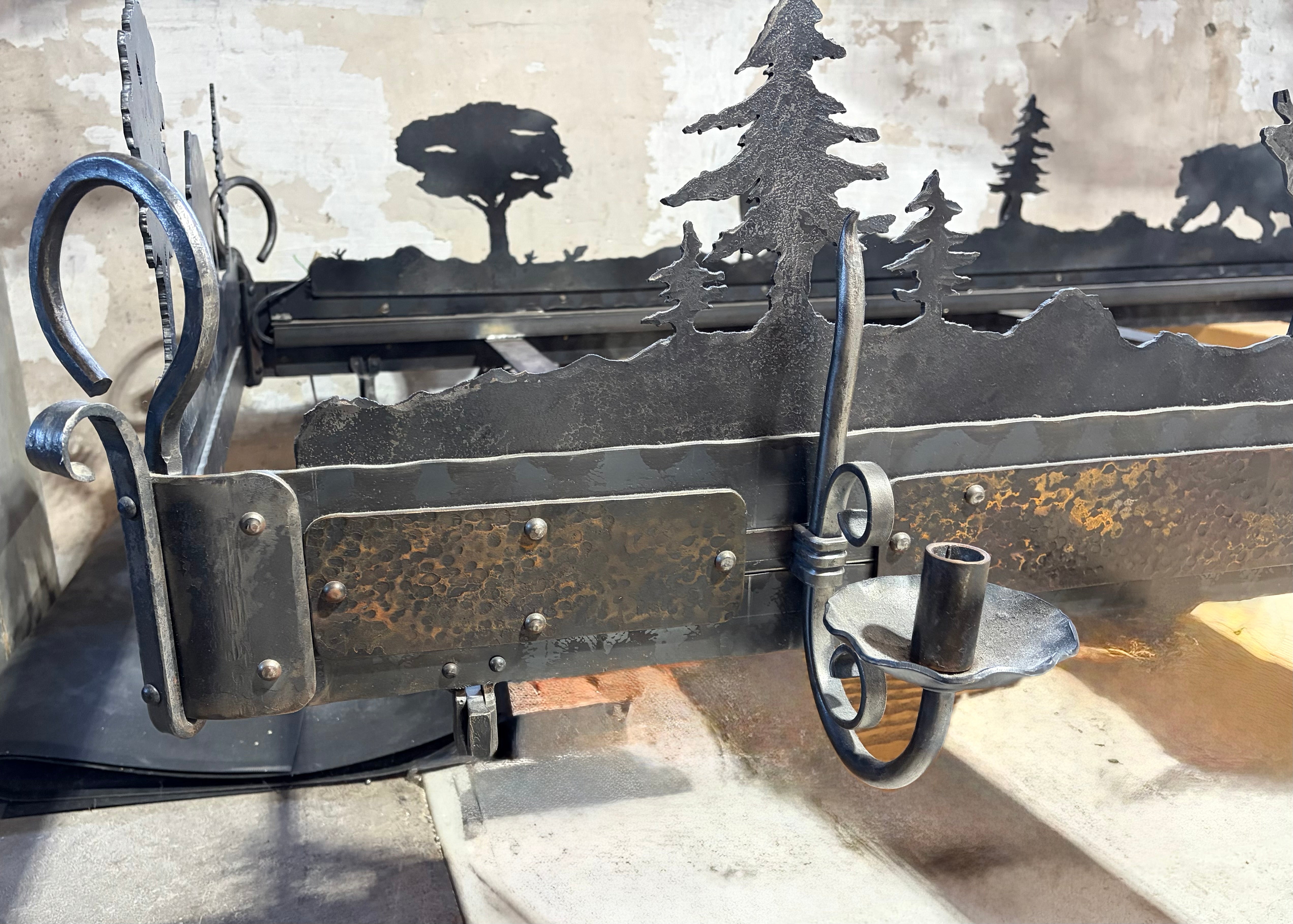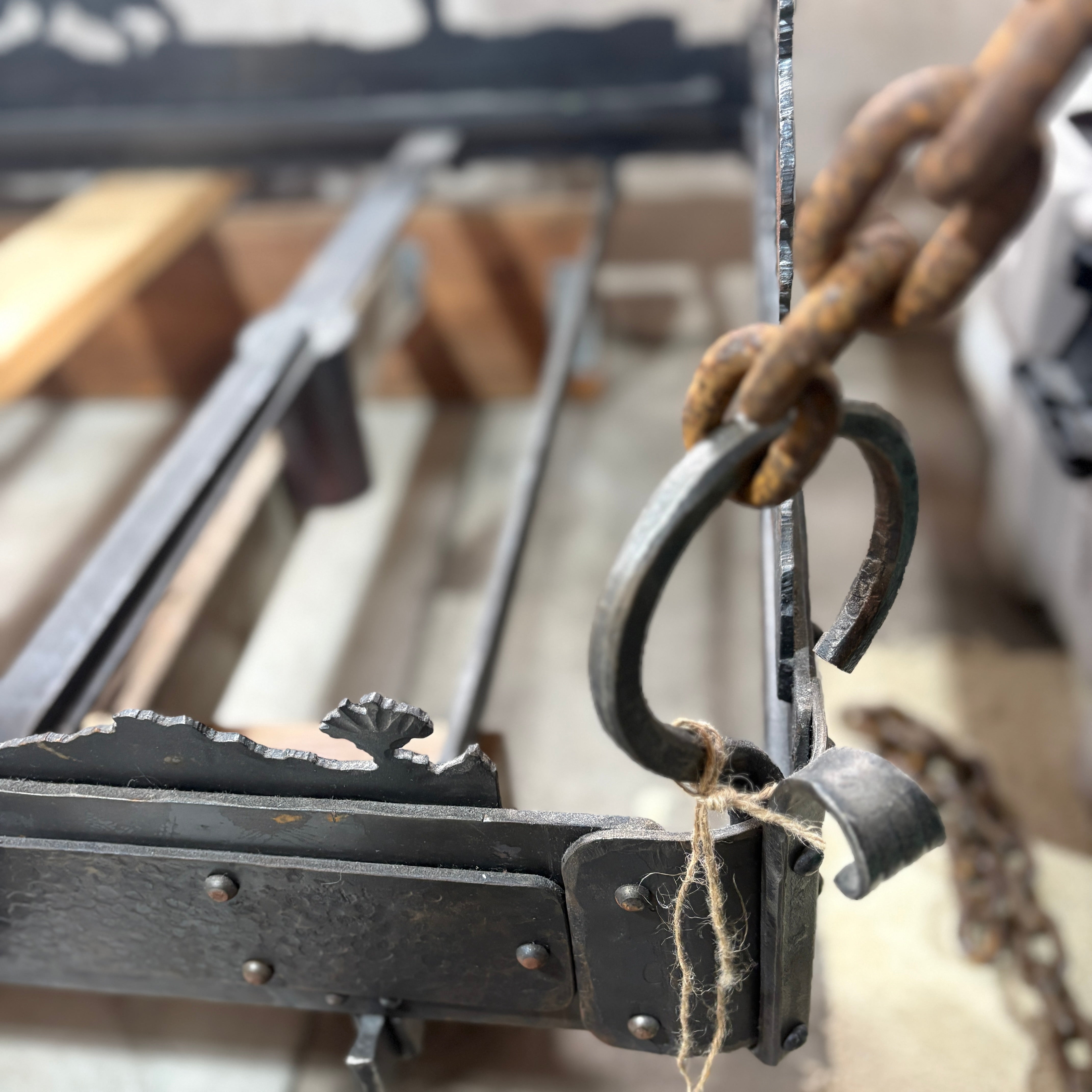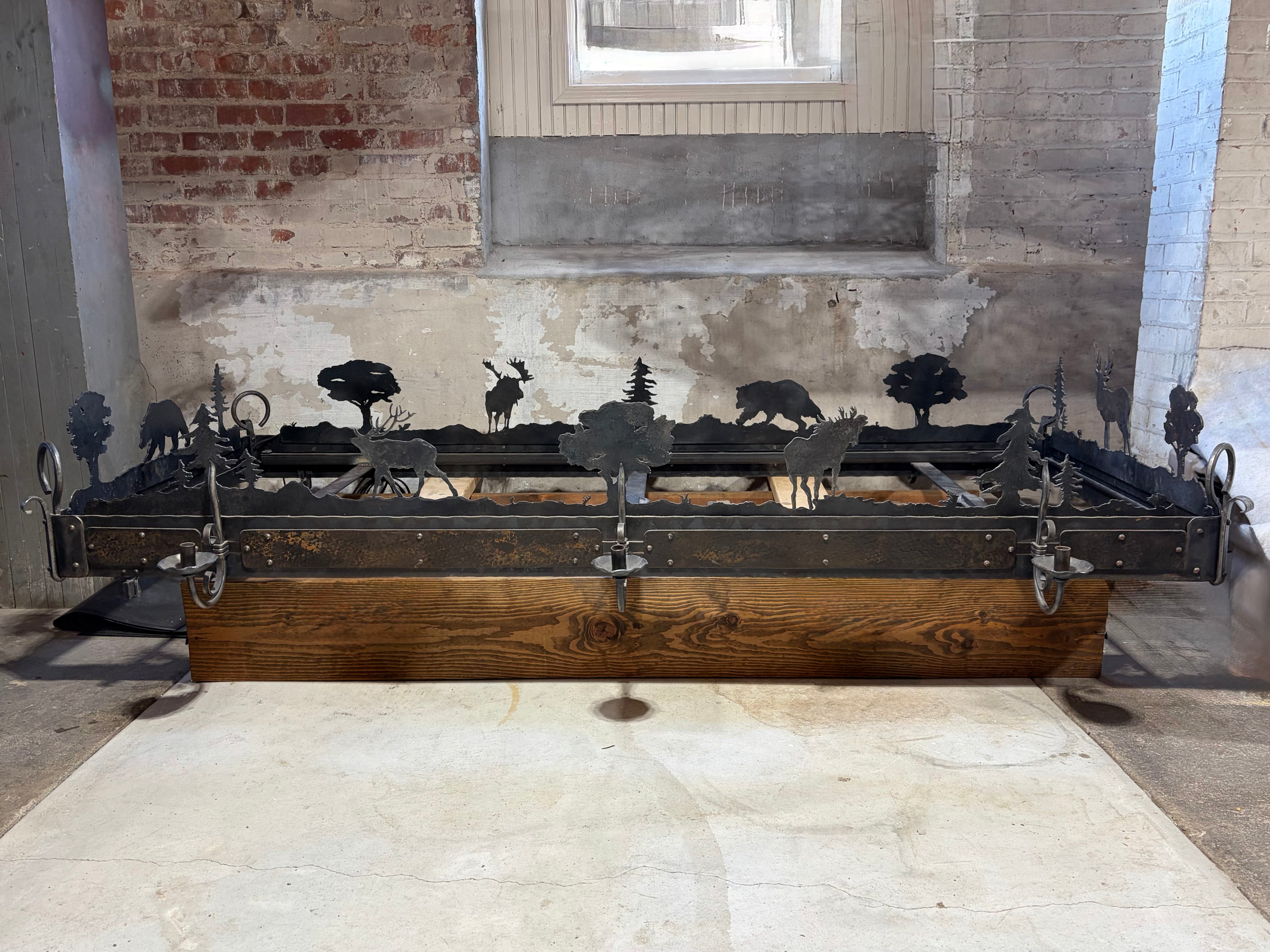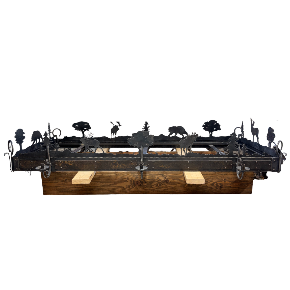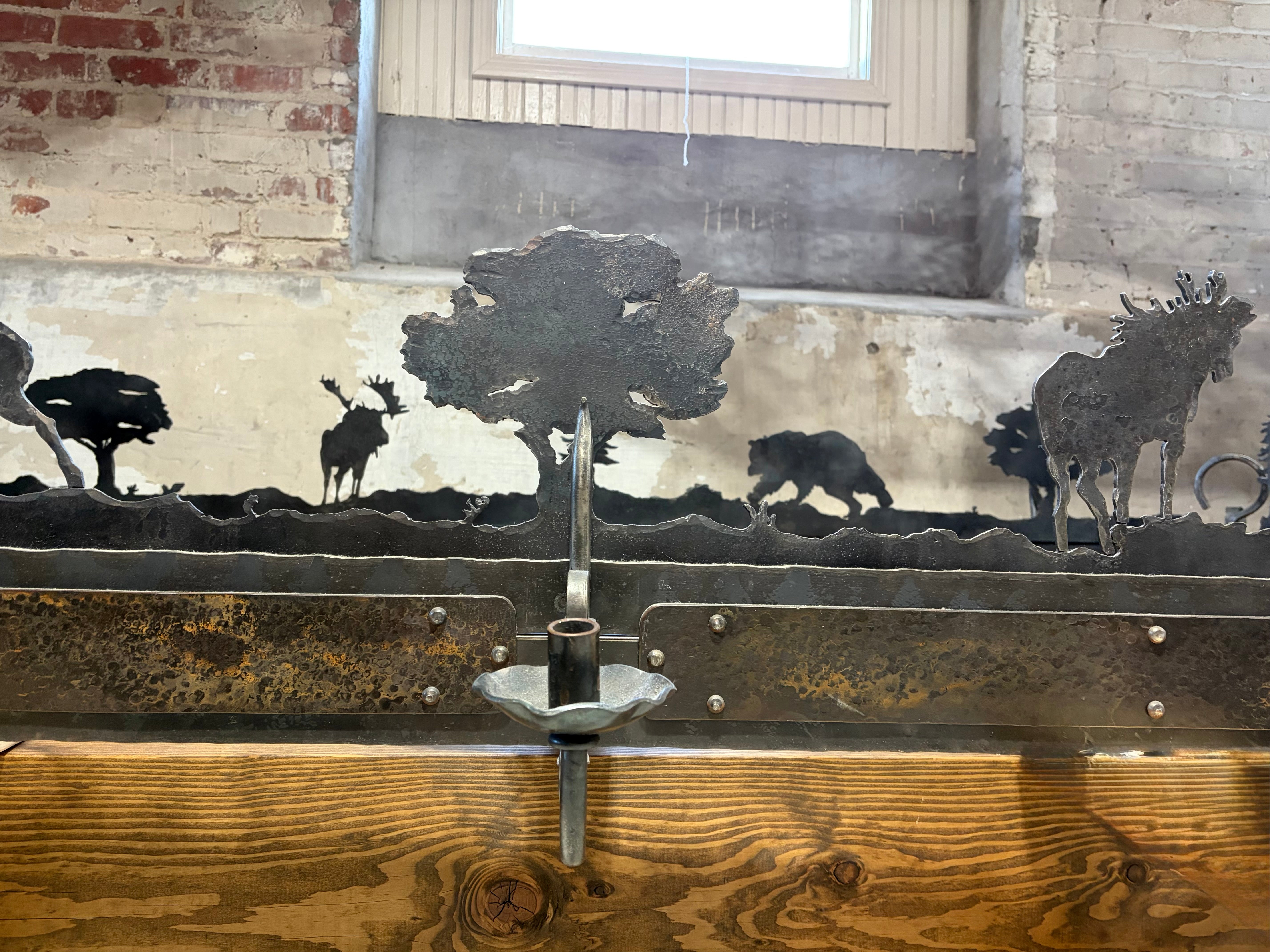 Extra Large Pot Rack: Handcrafted Steel Tree Frame with Animal Motif, 6 Candlestick Lights and 3 Can Lights. See chains for hanging in the gallery images. Note: Wood under light is not part of it but is simply supporting it.