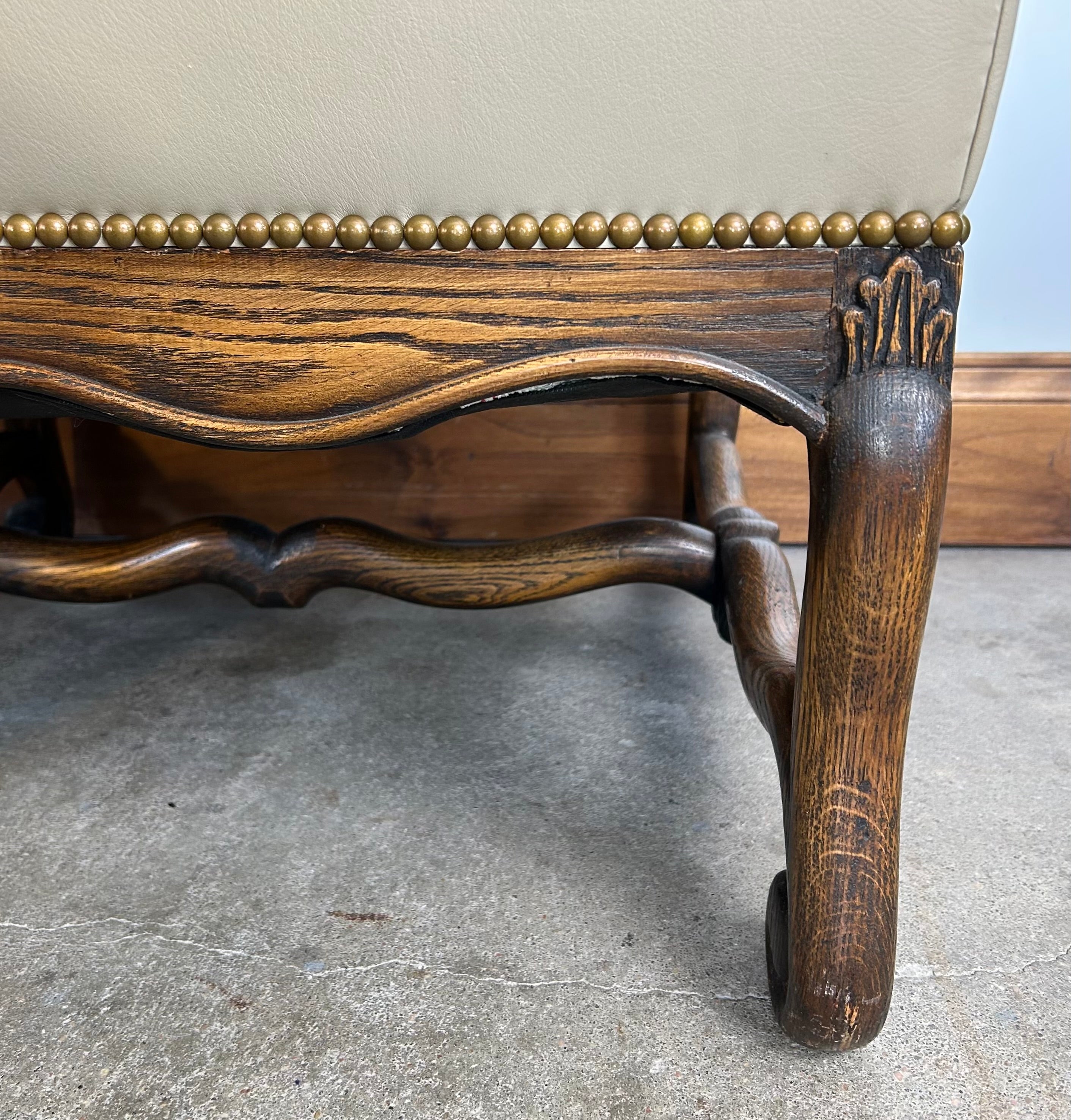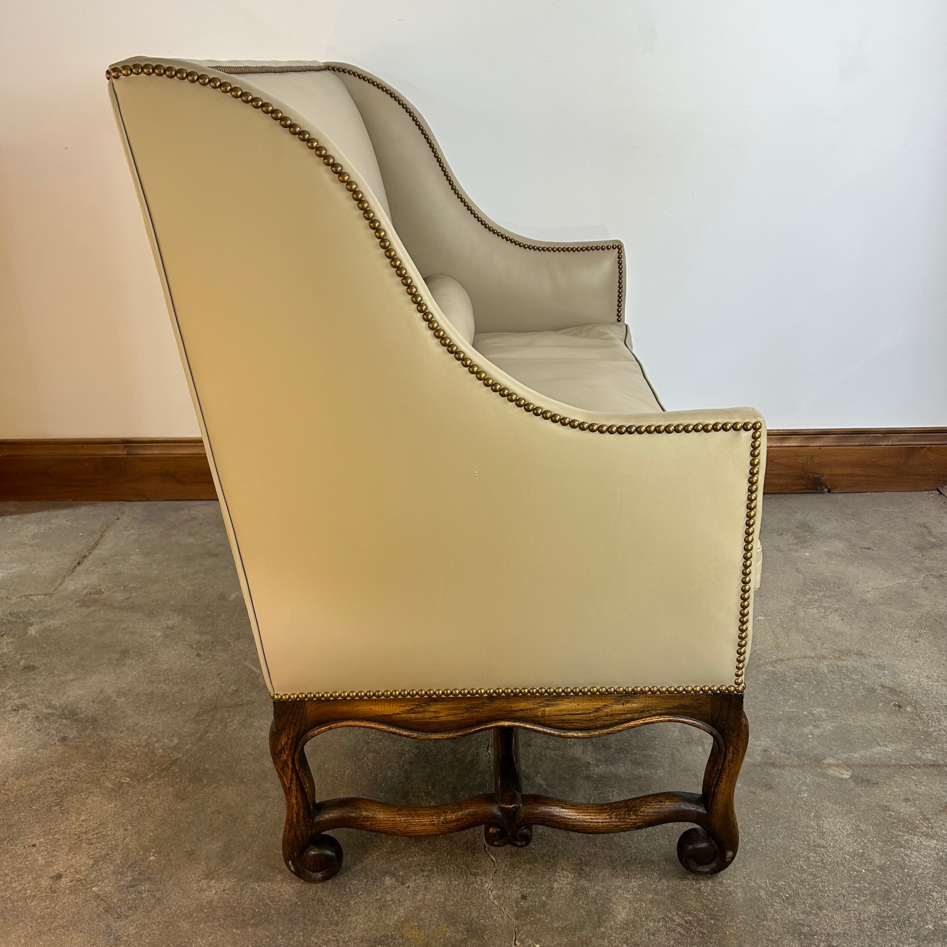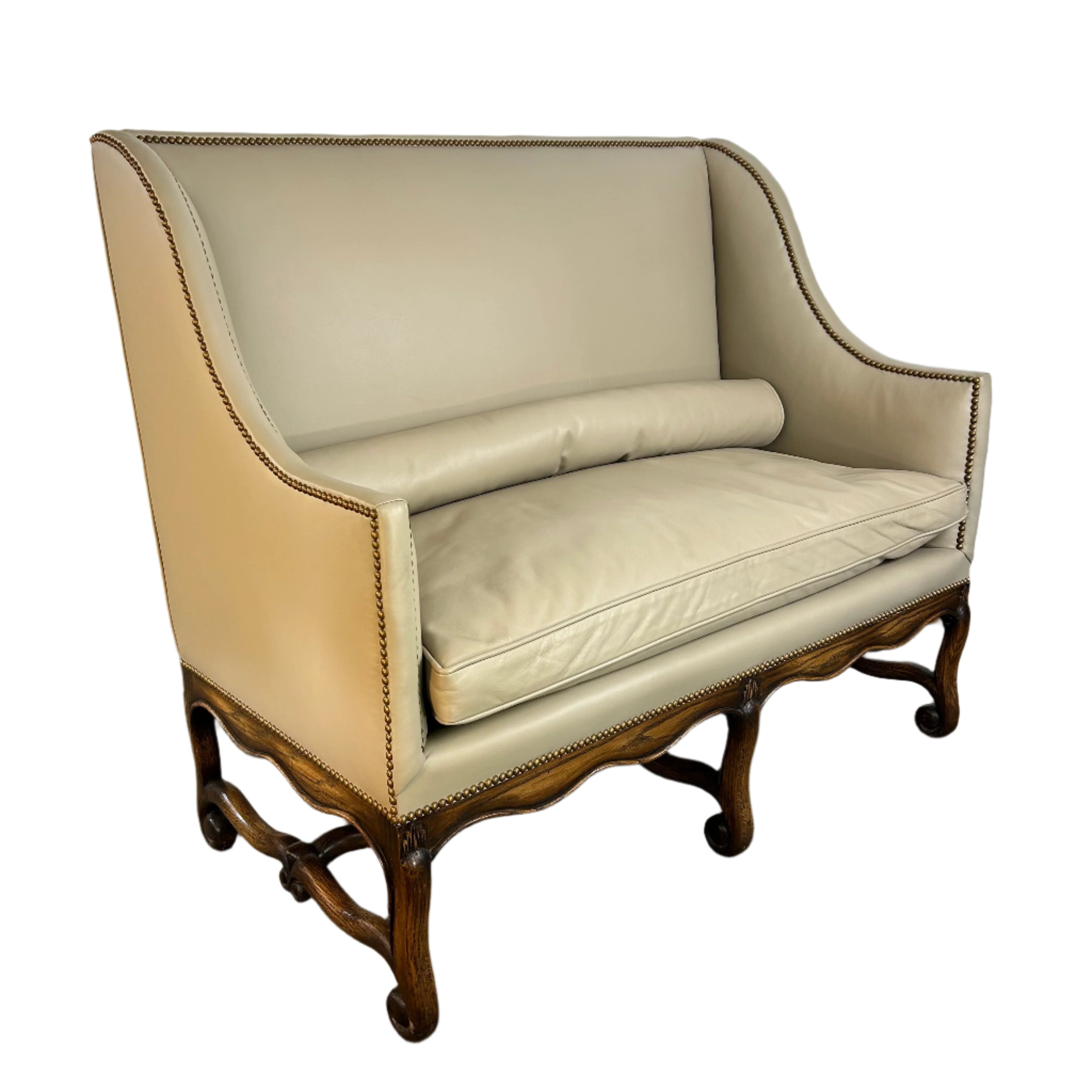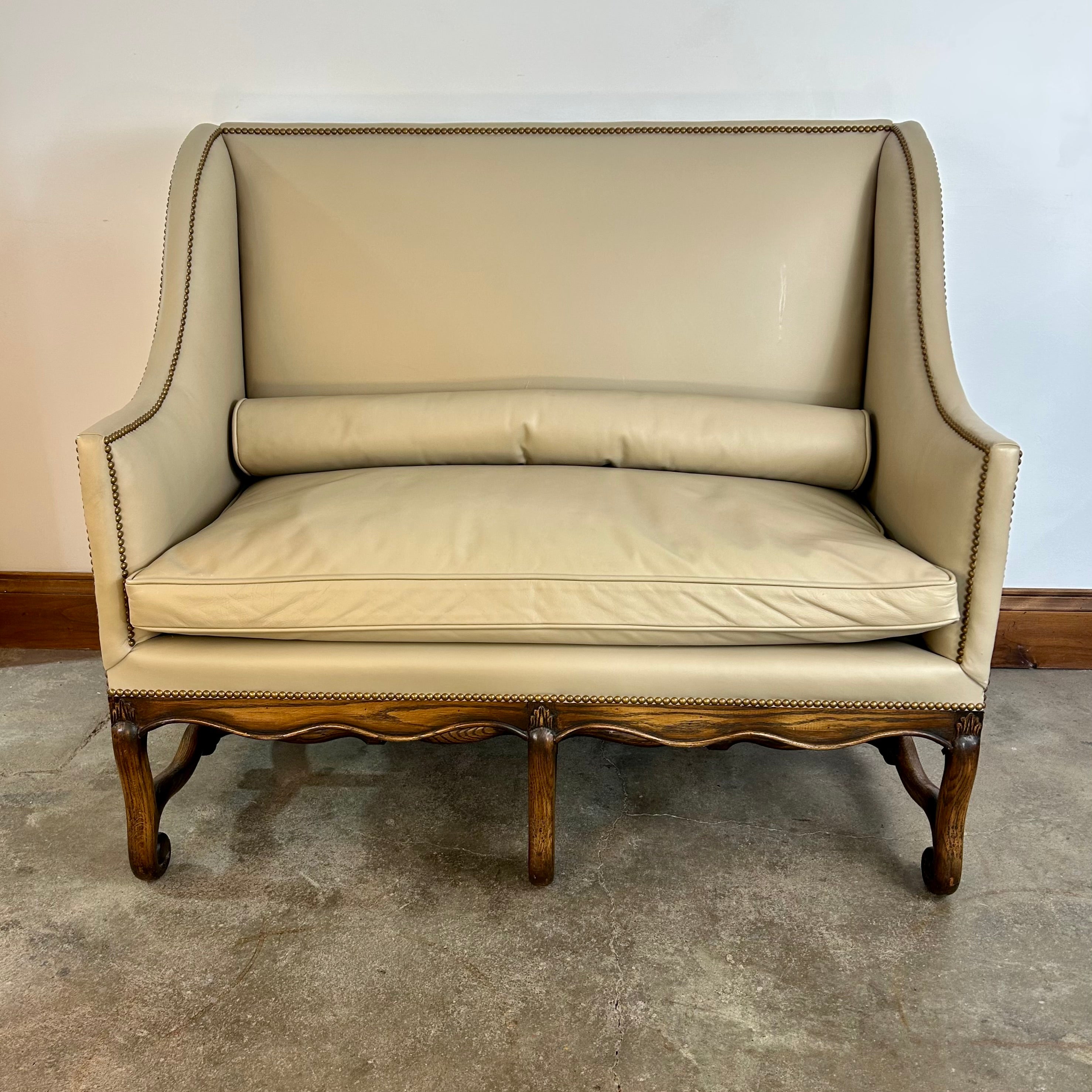 High-back banquette or loveseat, cream color leather with nailhead trim and slim bolster pillow.