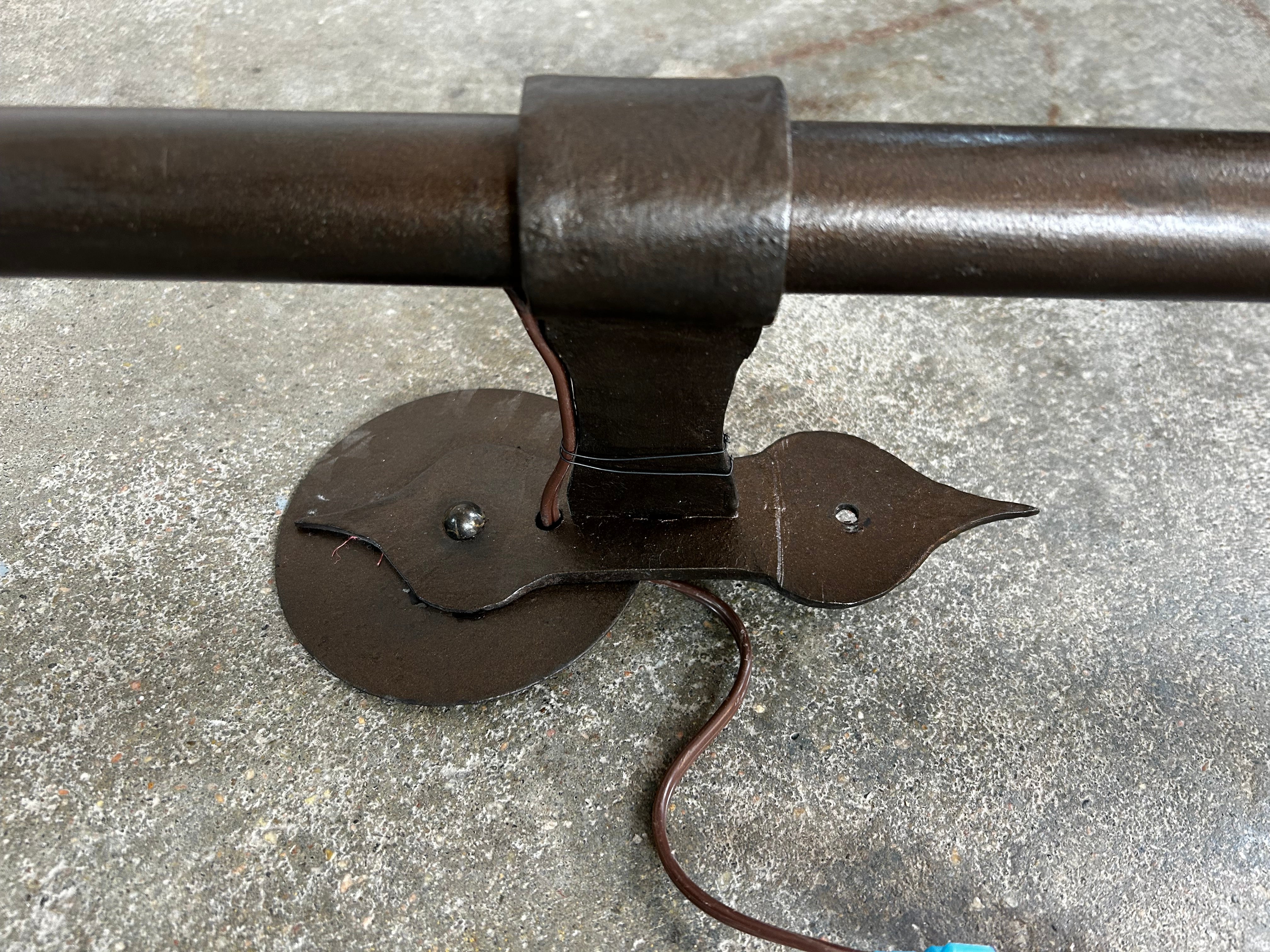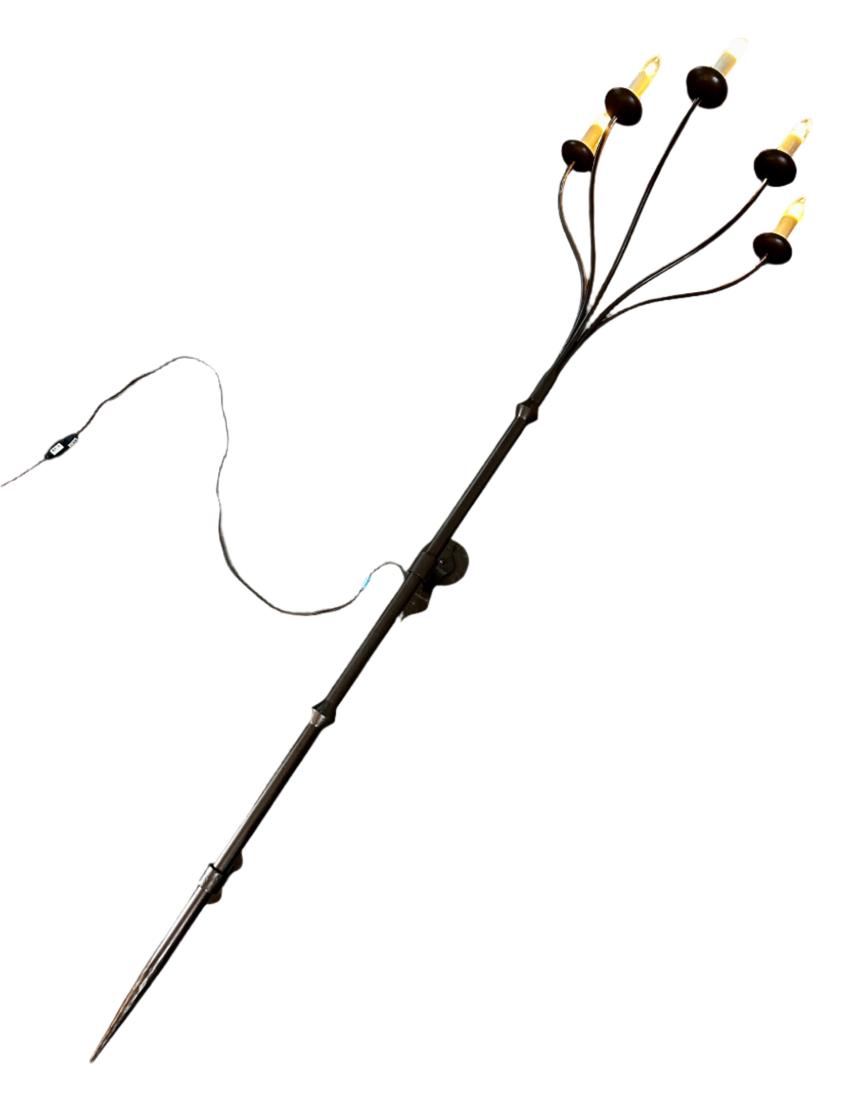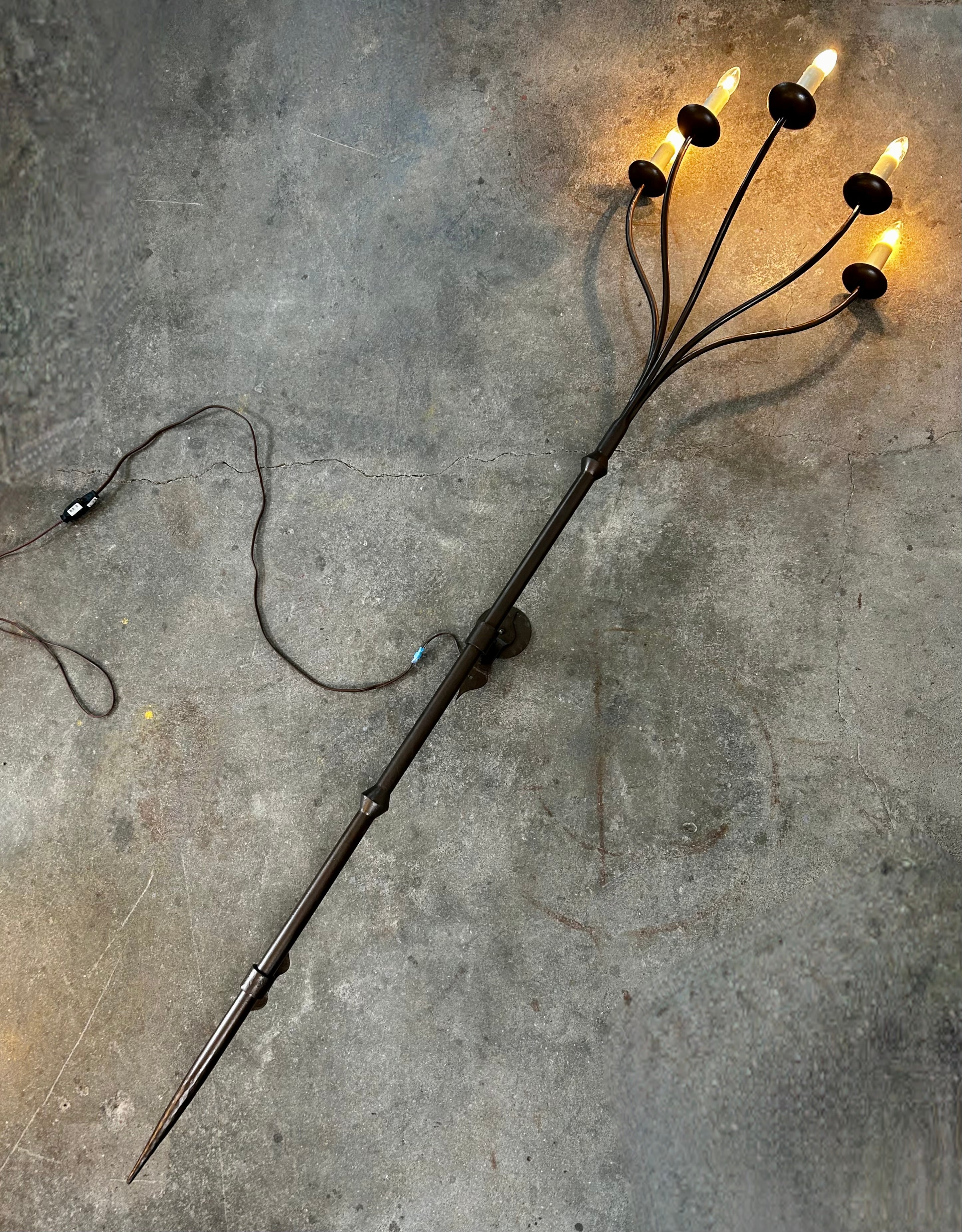 International Ironware tall wall mounted lights, five candle light, large base. Iron has a brown cast.