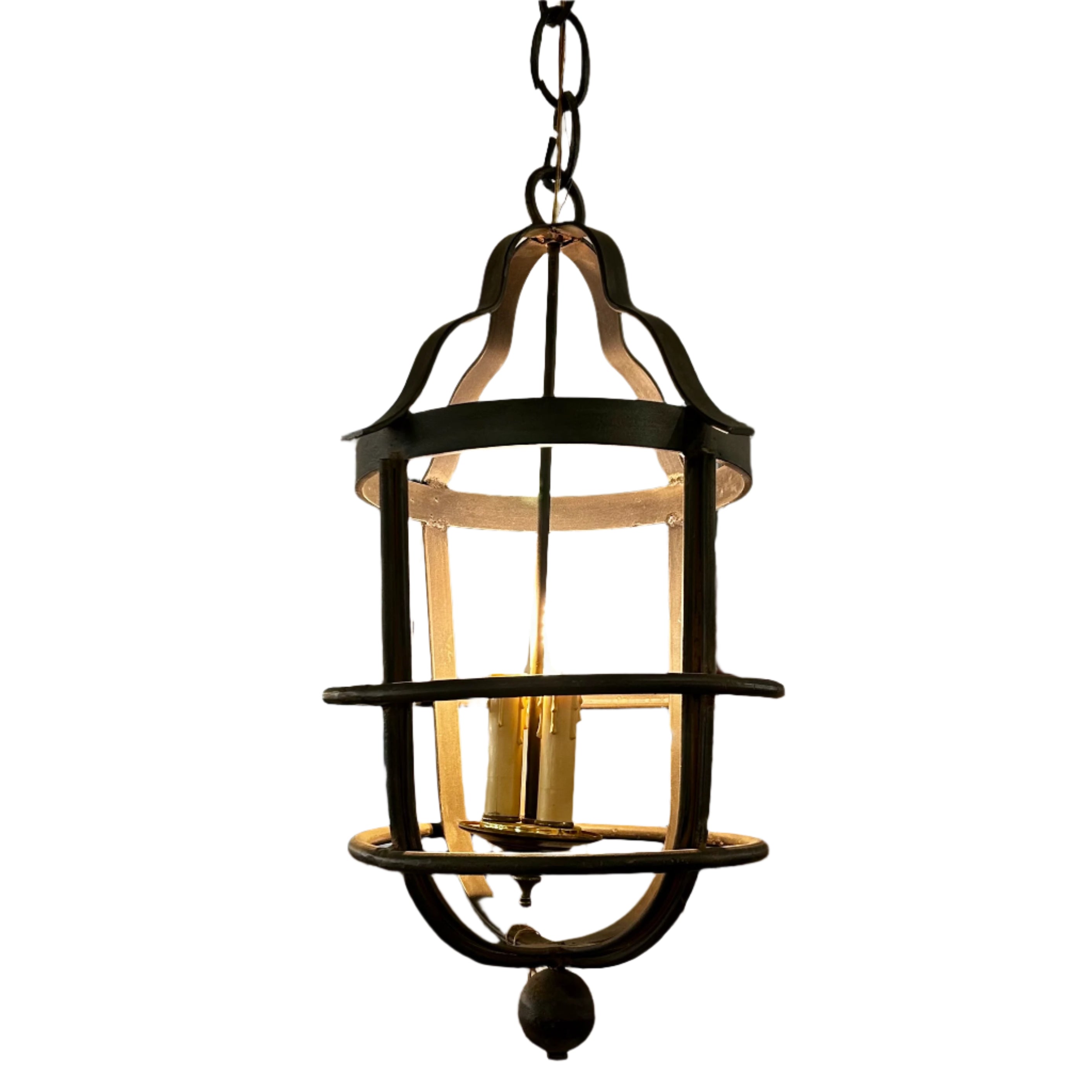 Iron pendant light, rustic style, three candle sticks. Heavy iron. Ideal for entry foyer, or covered porch. Does not include canopy. We do not know the maker name. Note: we have only two light bulbs in this at time of photo.