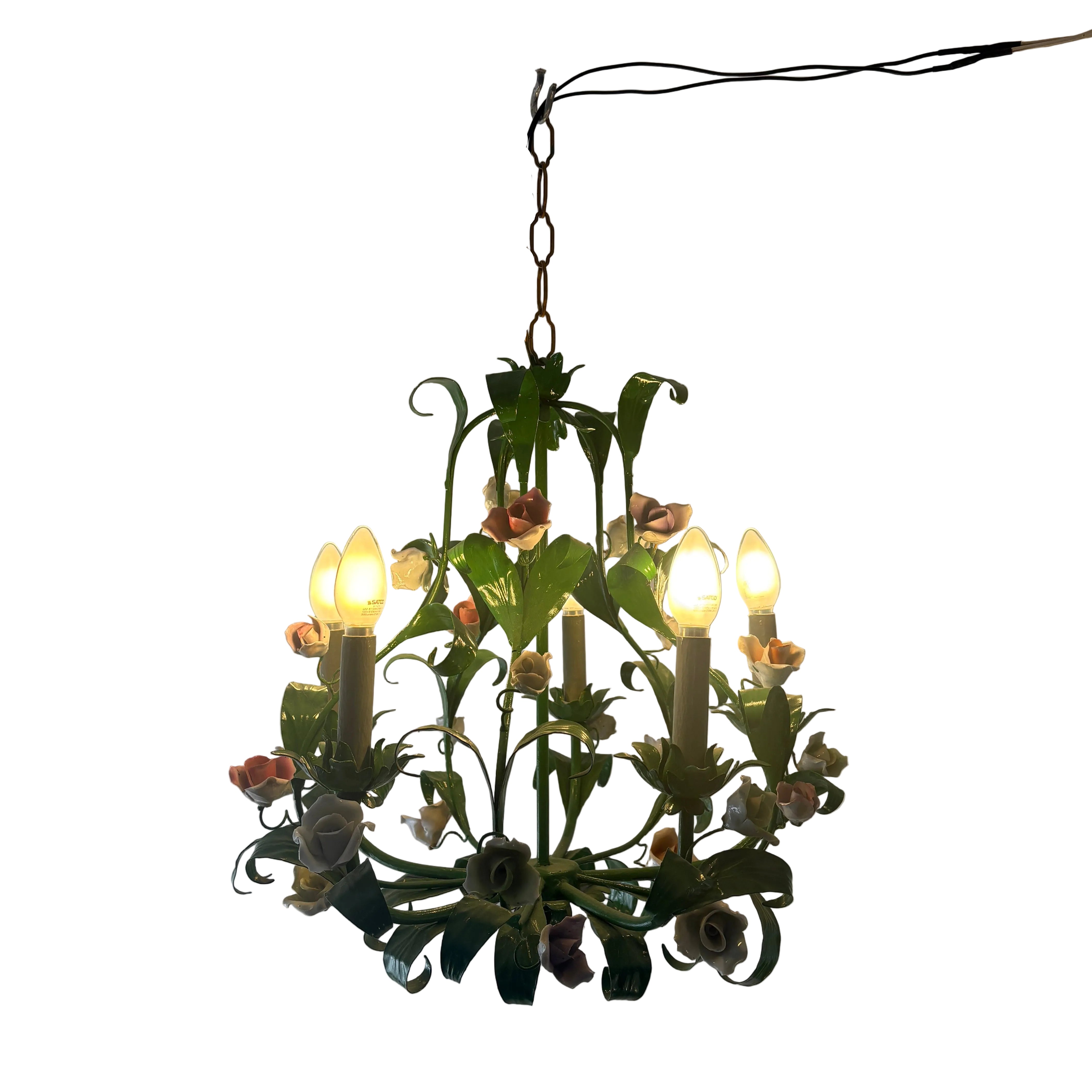 Italian Metal Toleware 5 Arm Chandelier Painted a Lush Green with Pastel Flowers
