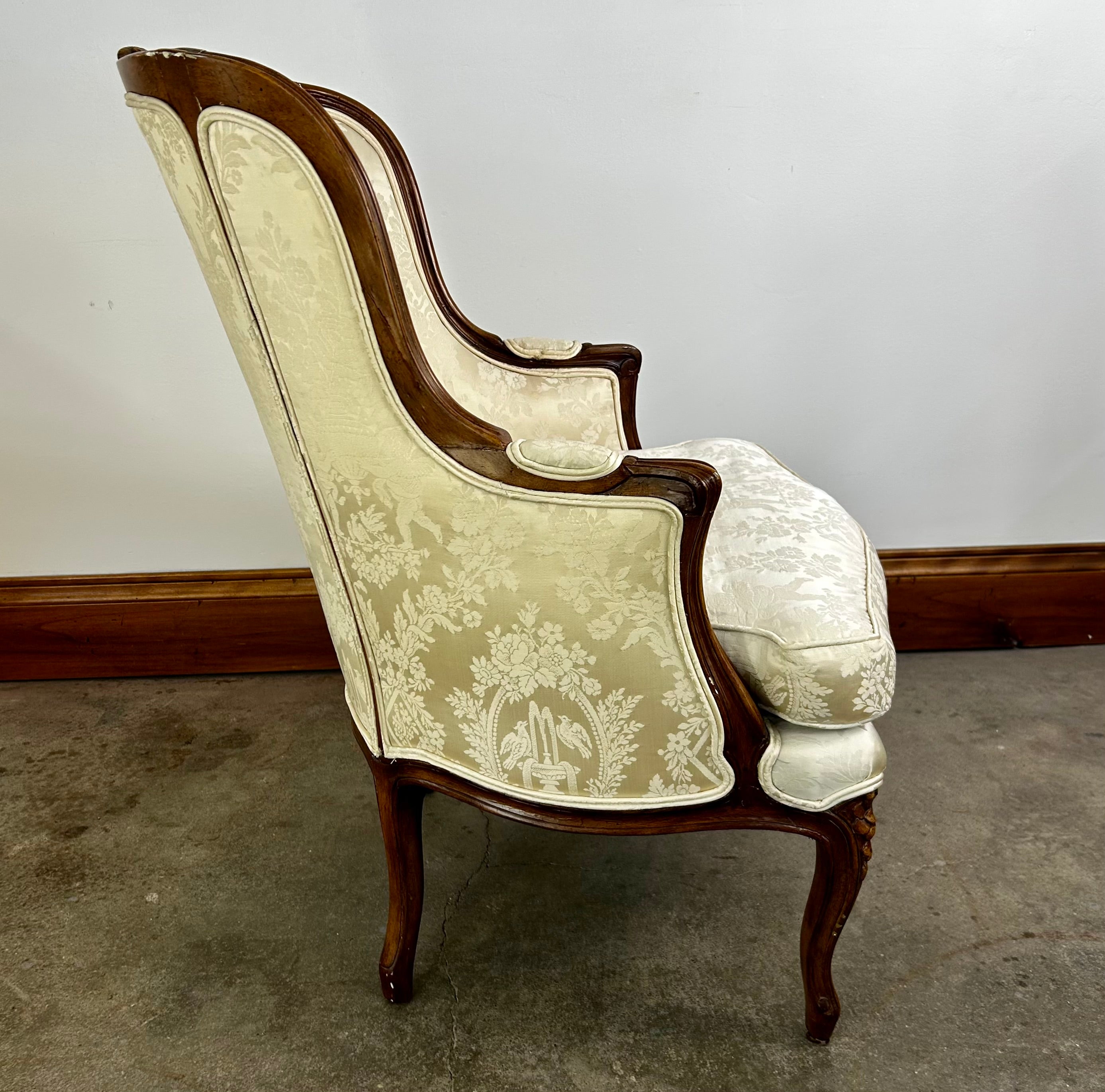 Ivory brocade armchair footstool set with dark wood frame and small padded arms rests. Includes footstool.