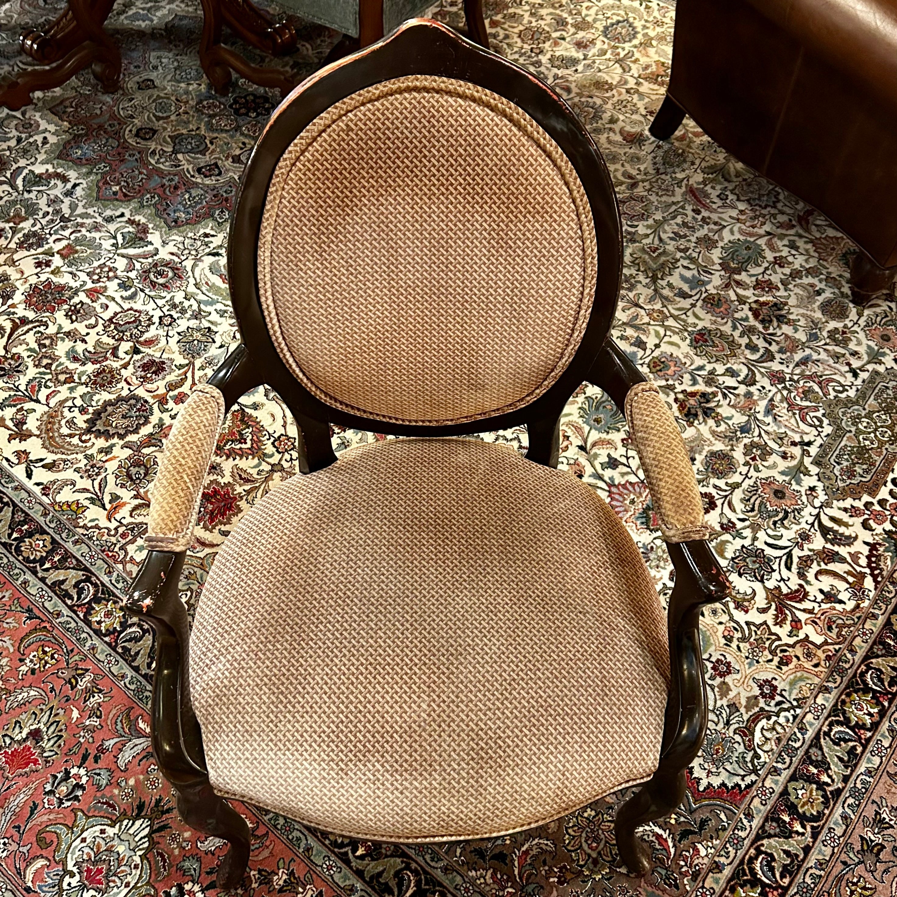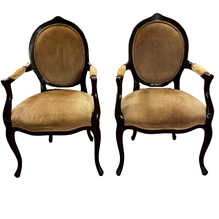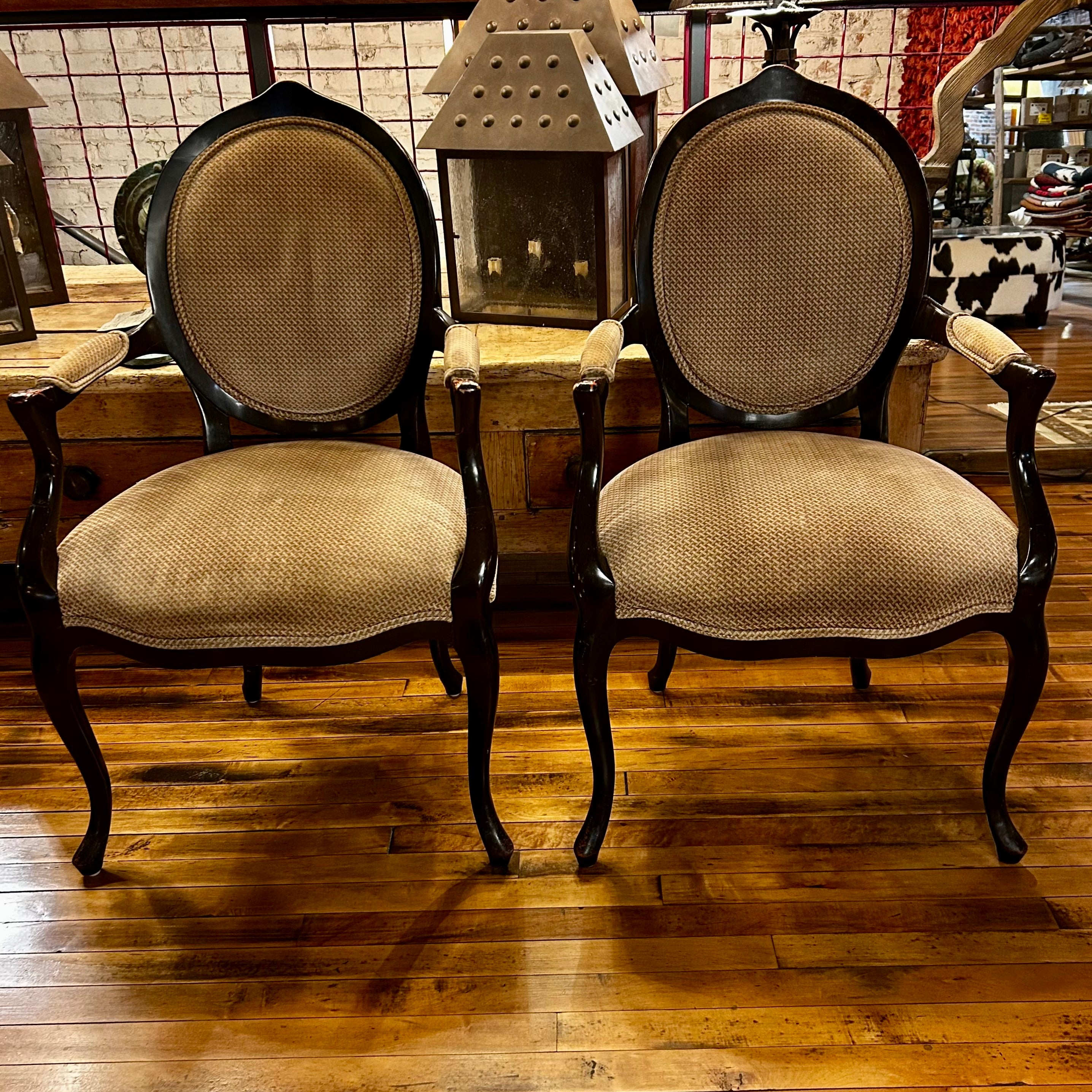 Pair of oval back embossed suede leather arm chairs in brown. Cabriole style legs, with lattice print embossed on suede.