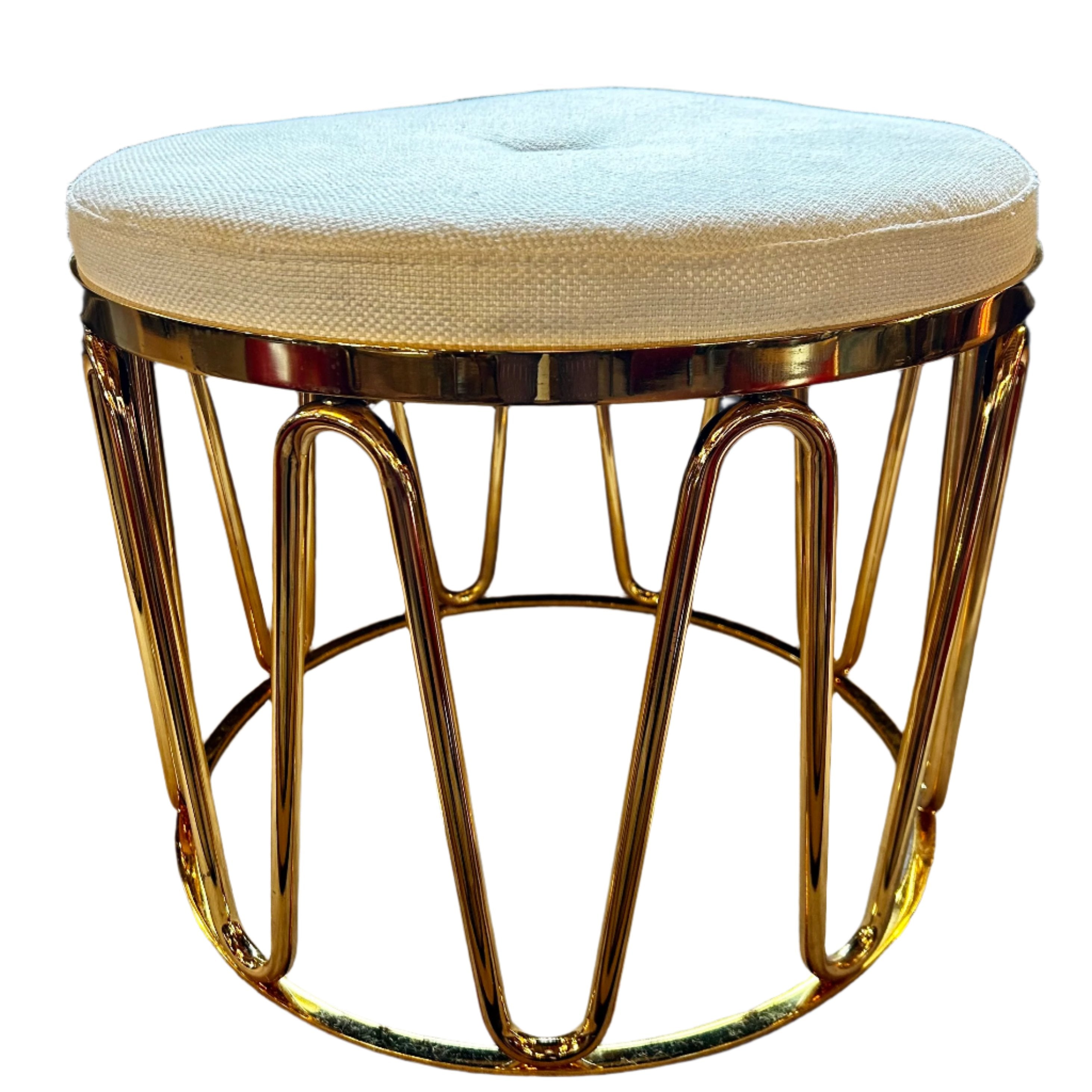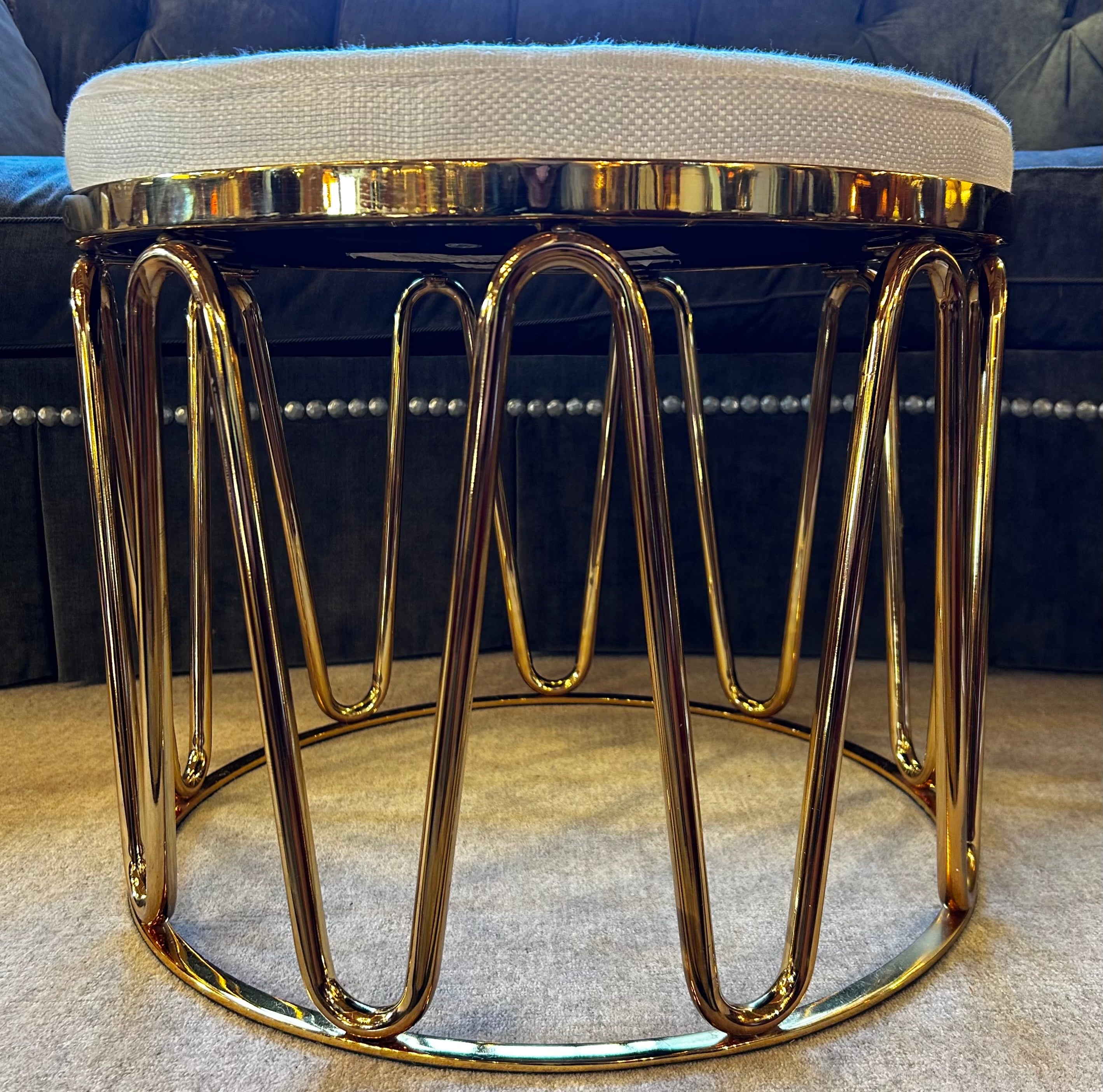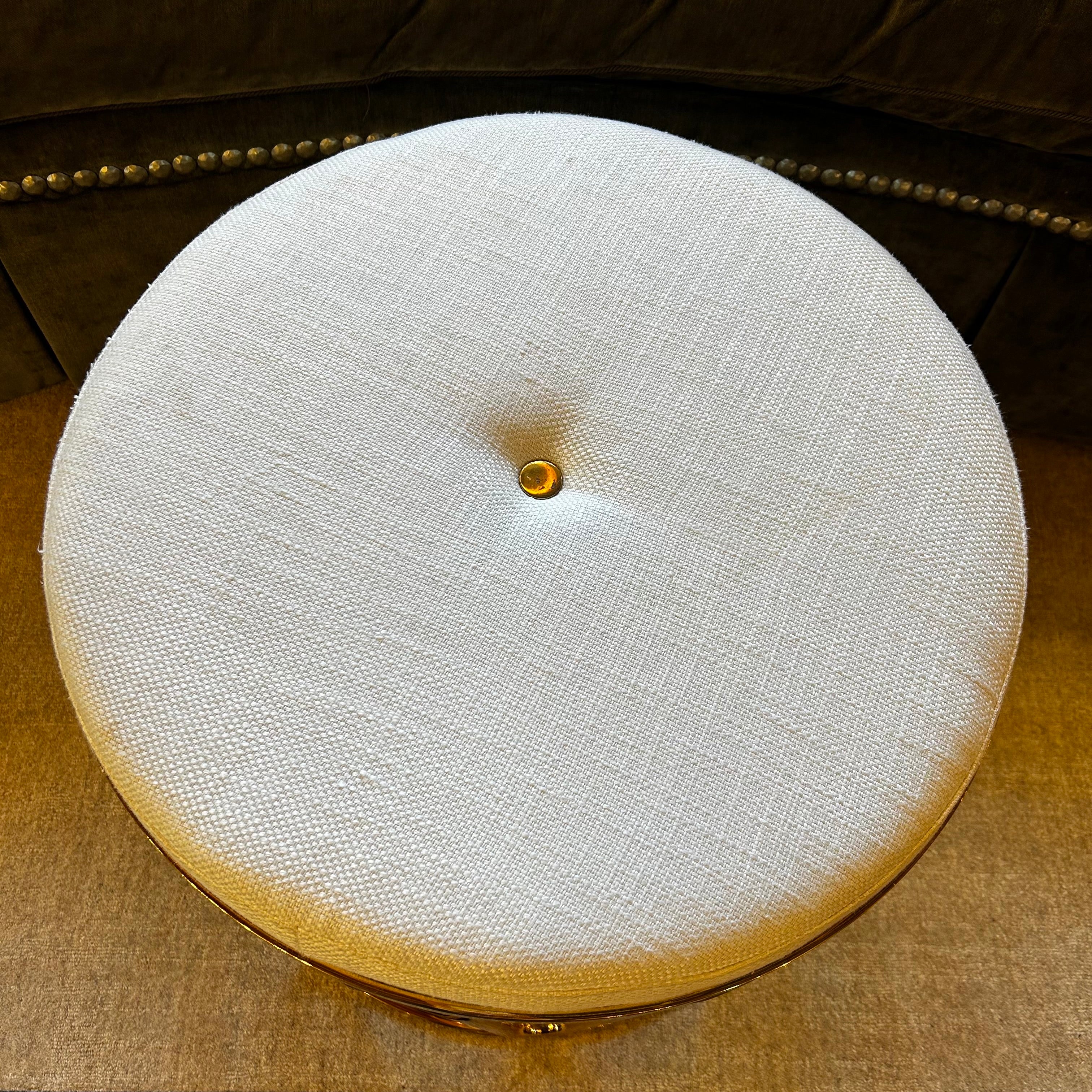 The Jonathan Adler Maxim white linen Tuffet side table with its stunning contemporary brass frame. This elegant and versatile piece is the perfect addition to any room, adding both style and functionality.