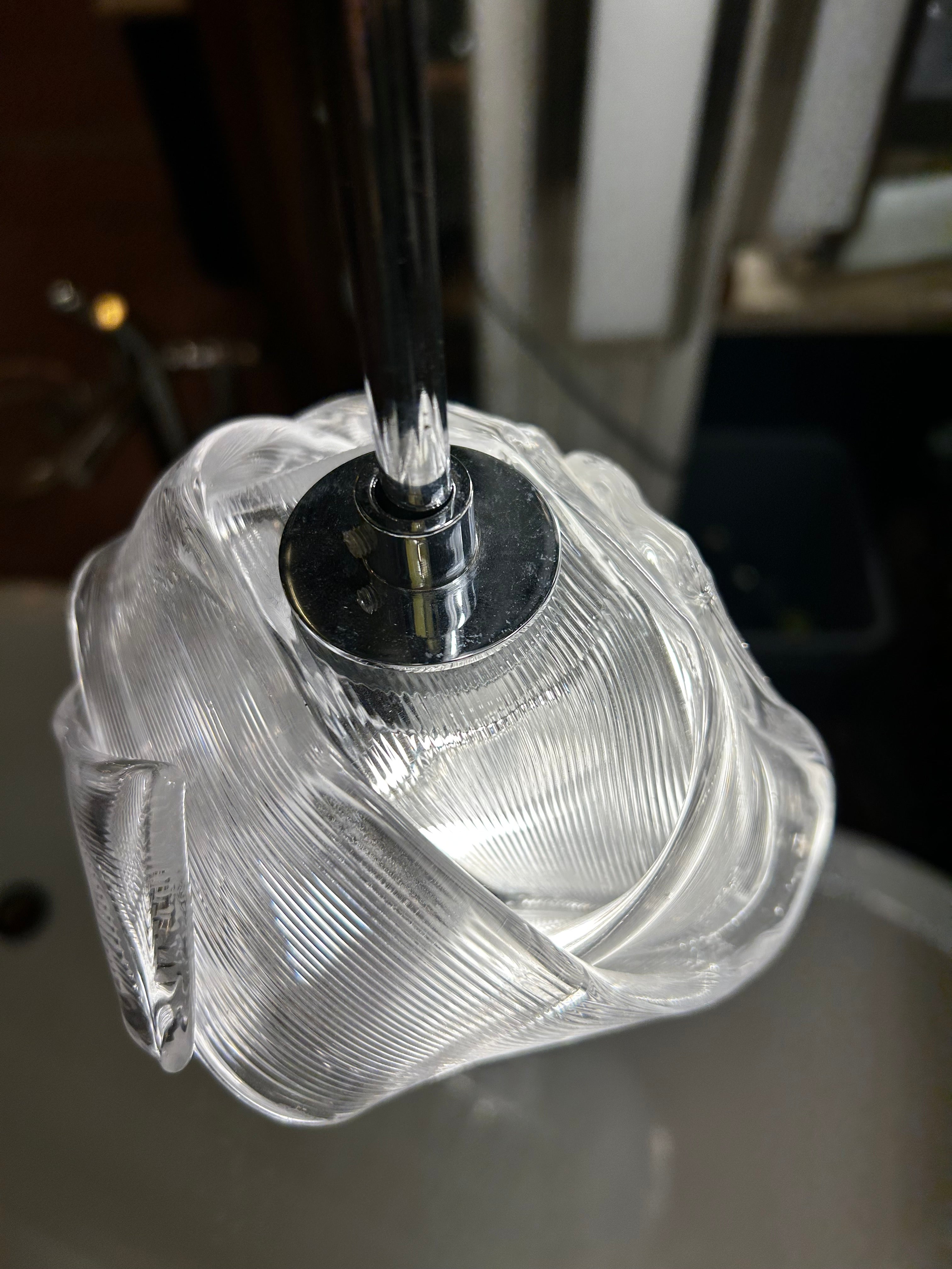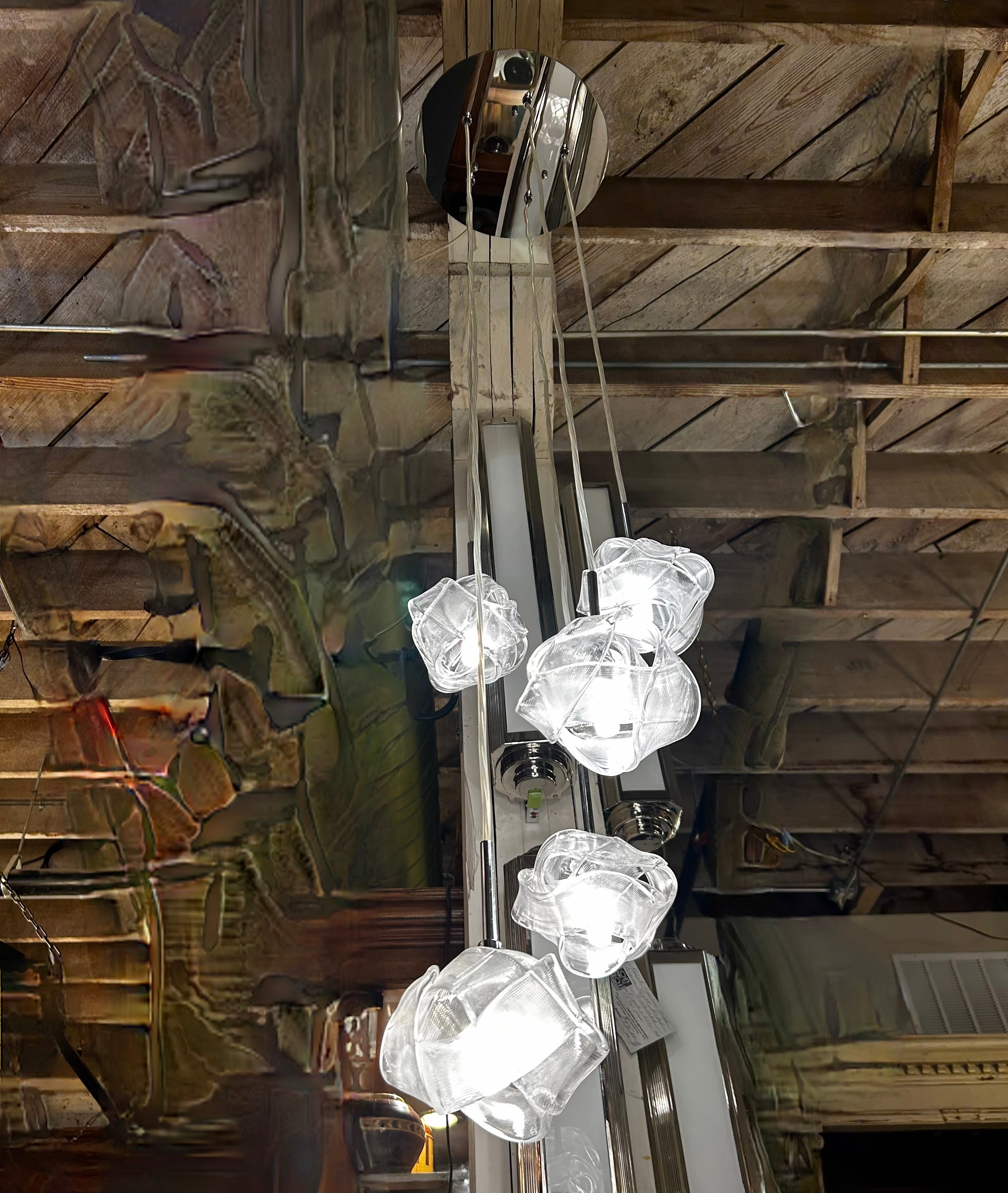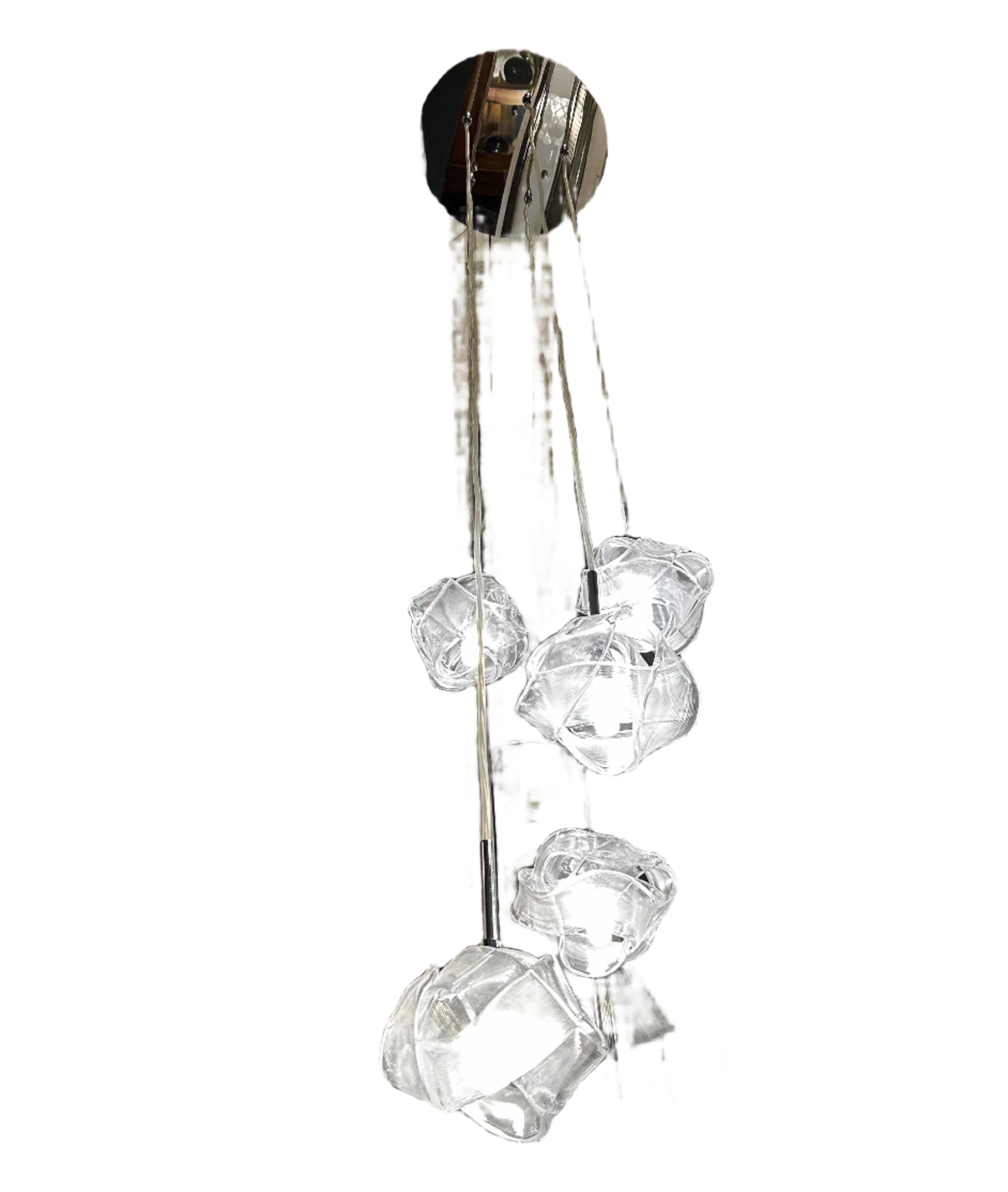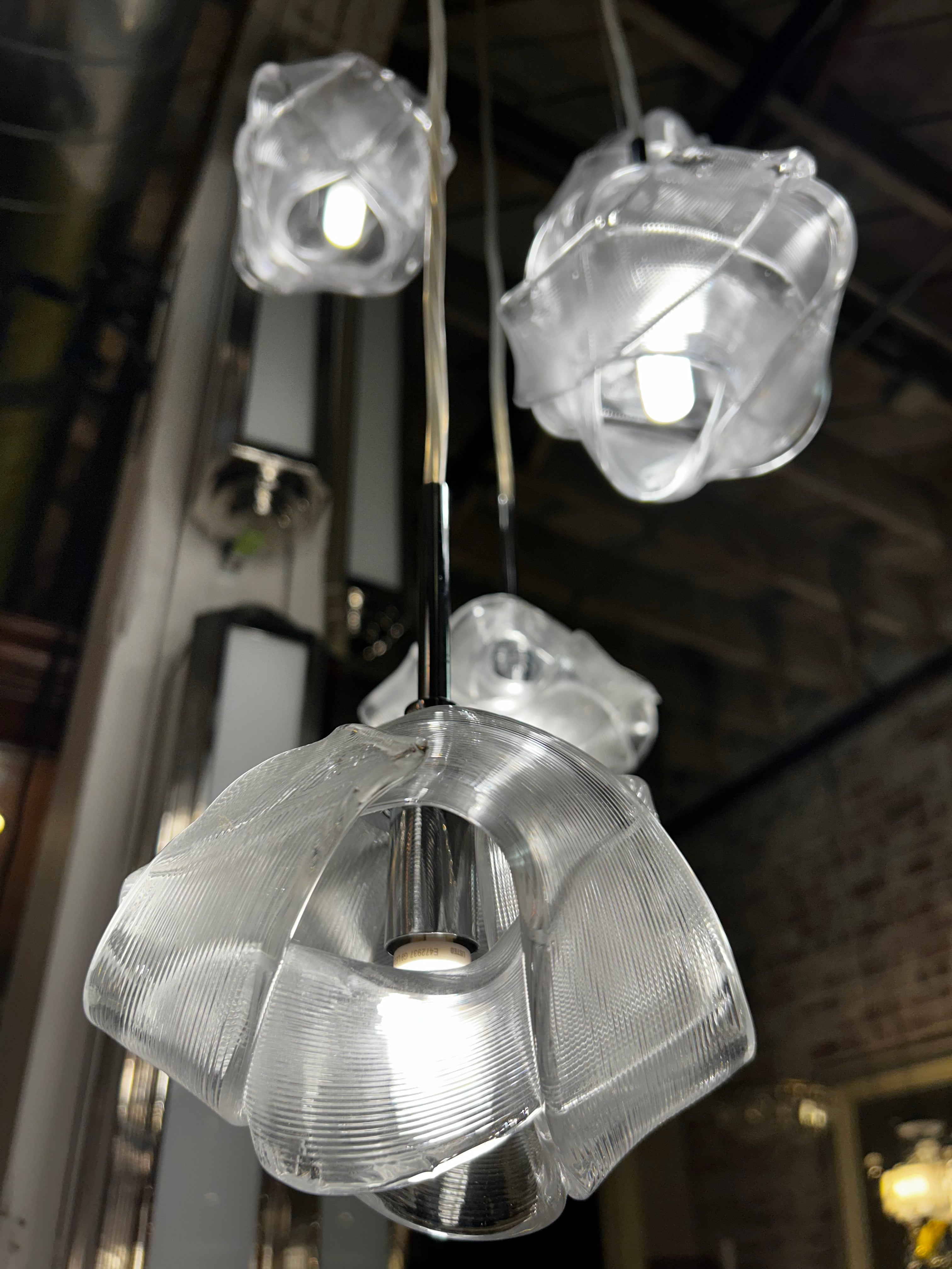 Kalco Lighting, hanging light, pendant light with ribbed knots. It has five glass shades.