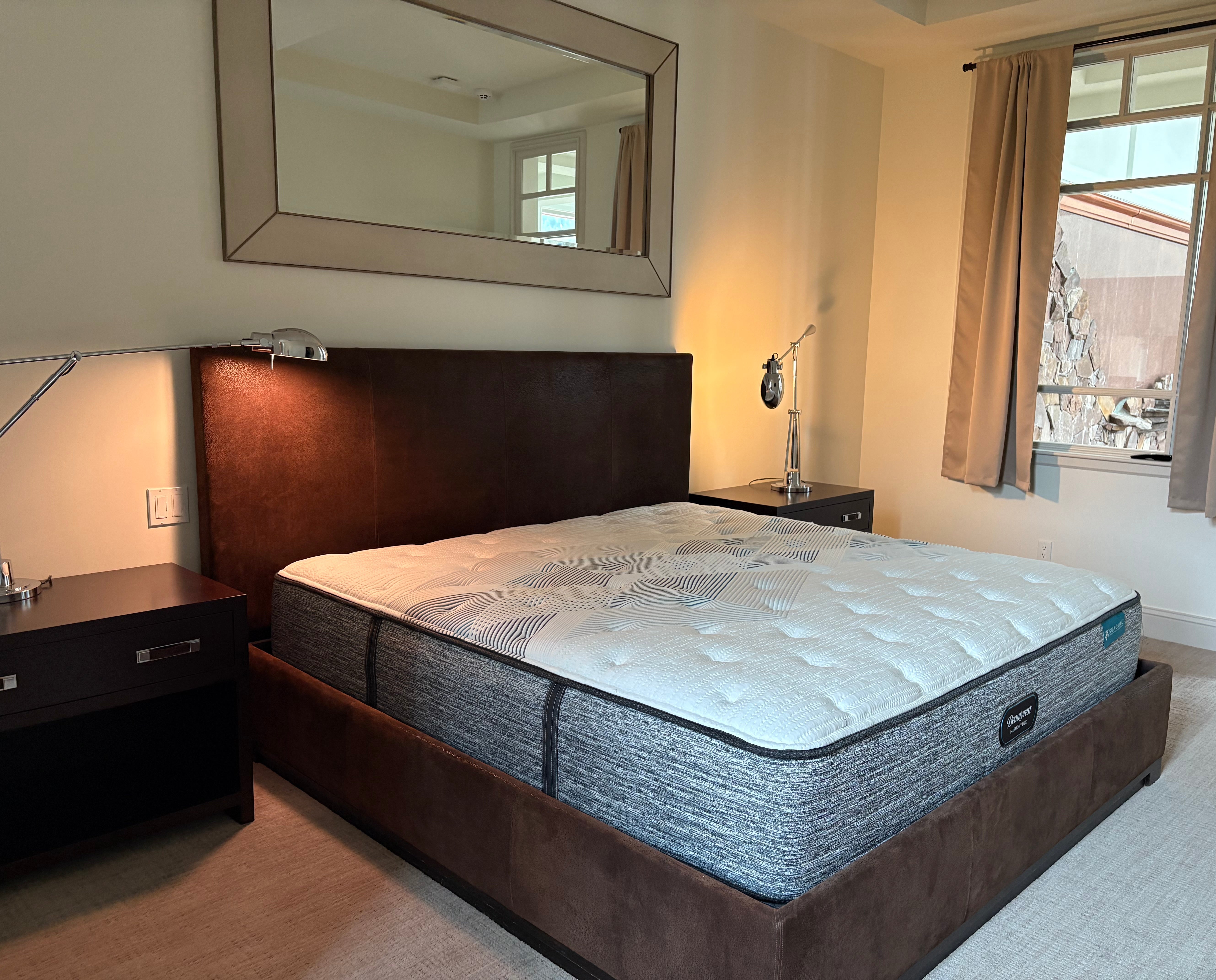 King bed with split leather headboard and sideboards in brown. We do not see a maker name but these are of top quality and came out of a luxury home with furnishings chosen by an interior designer. Note: mattress not included in price.