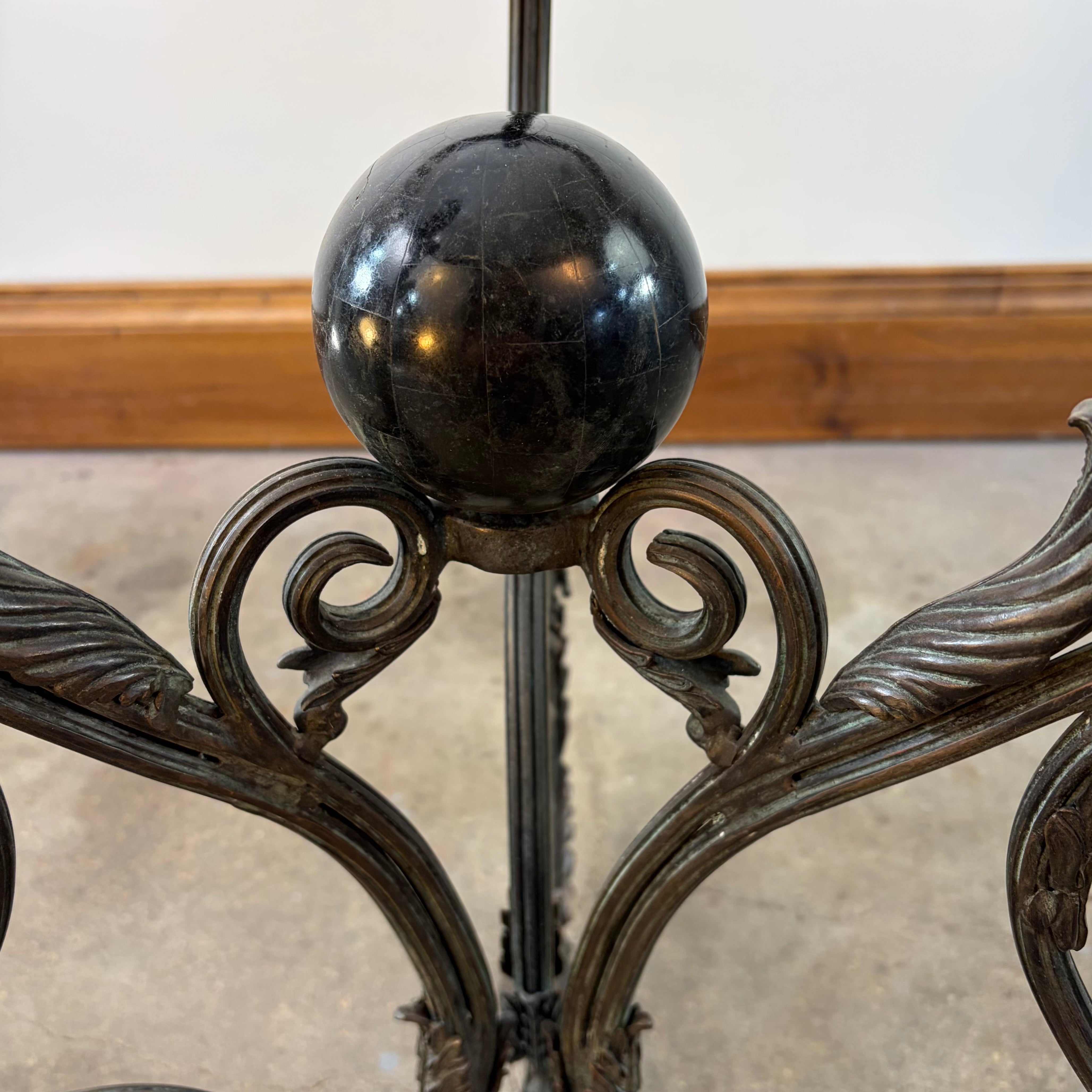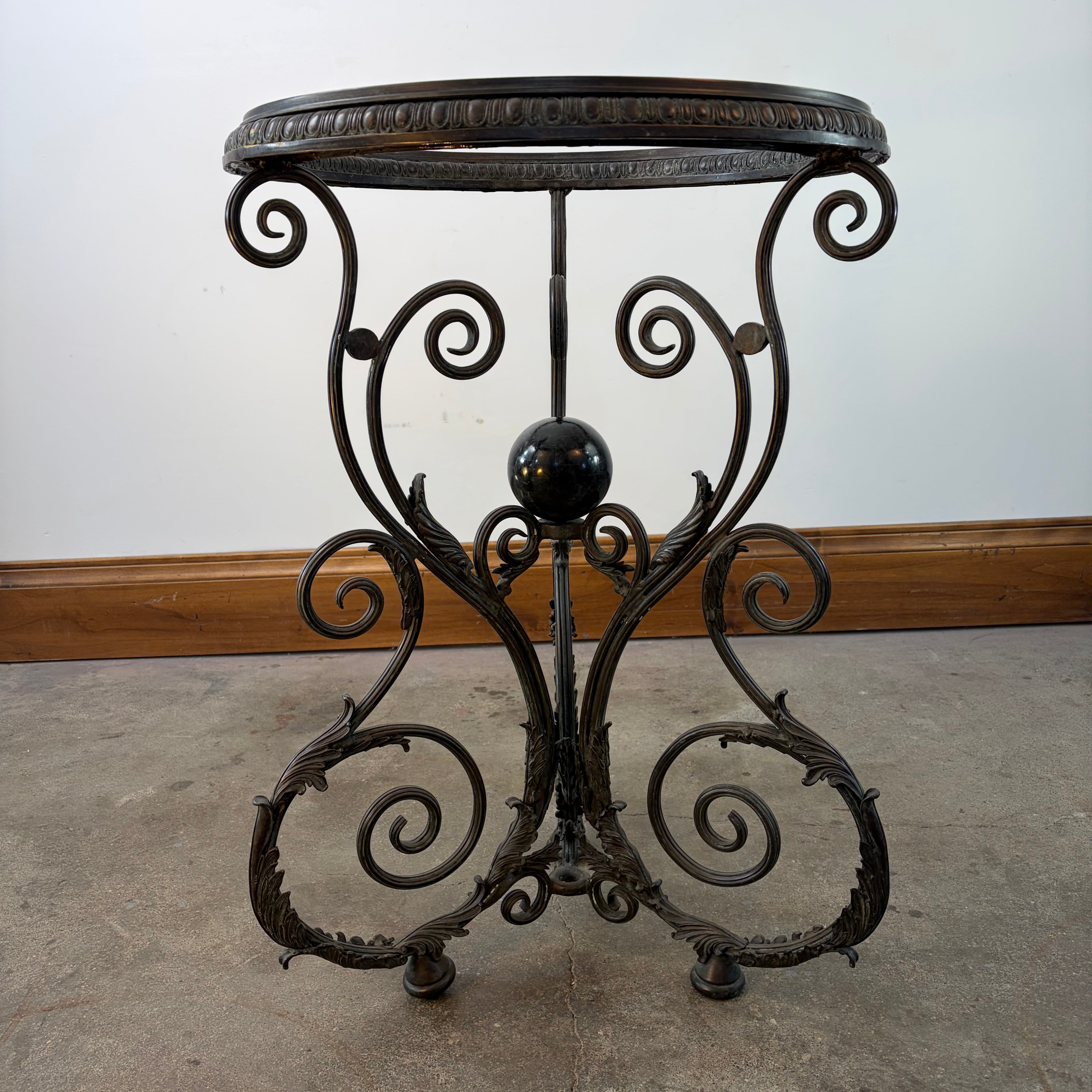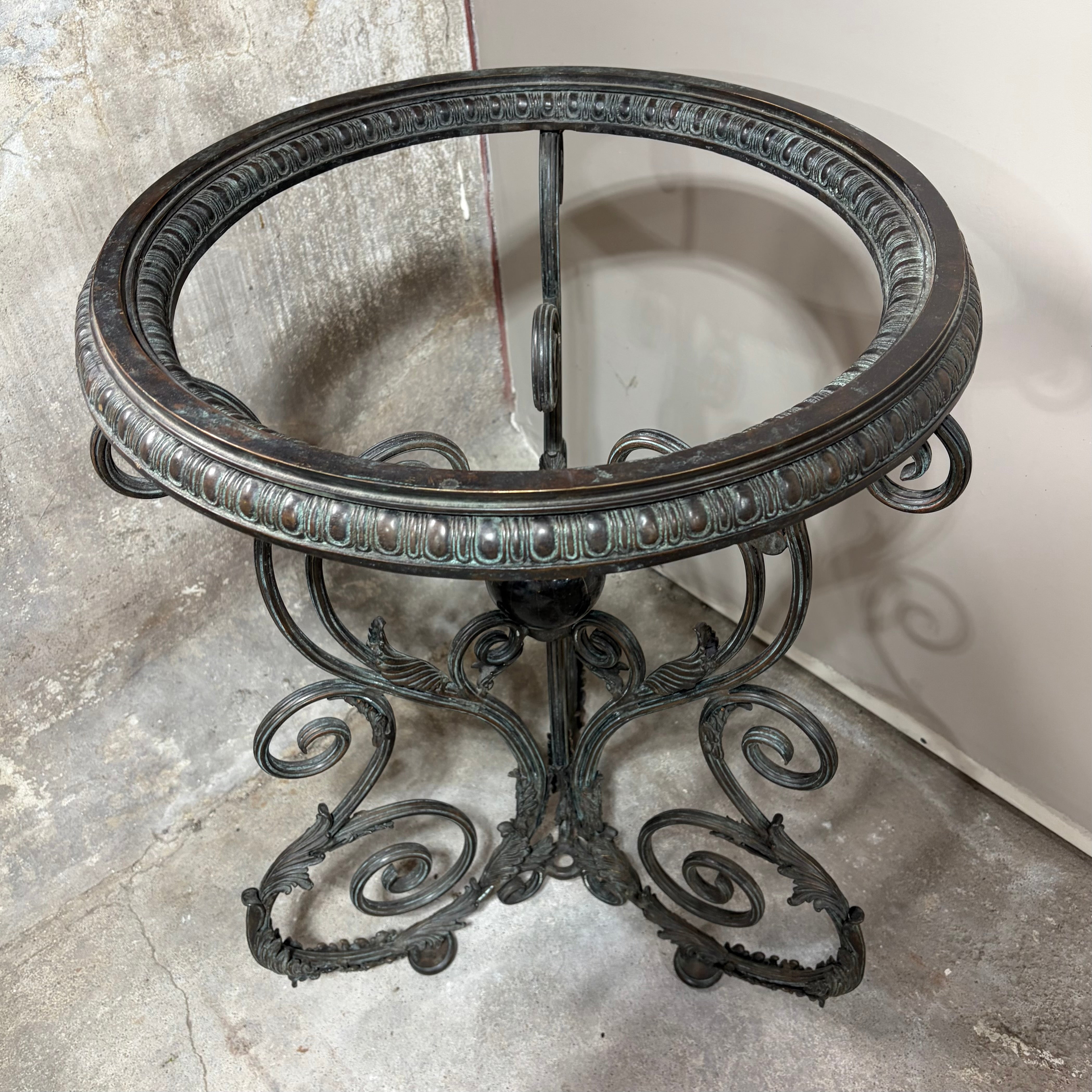La Barge Table, Bronze, Round, Tripod Base. Hand made in the Philippines. Note: the top of this table is missing. It most likely had a round glass insert, approx. 20" in dia. and could be replaced.