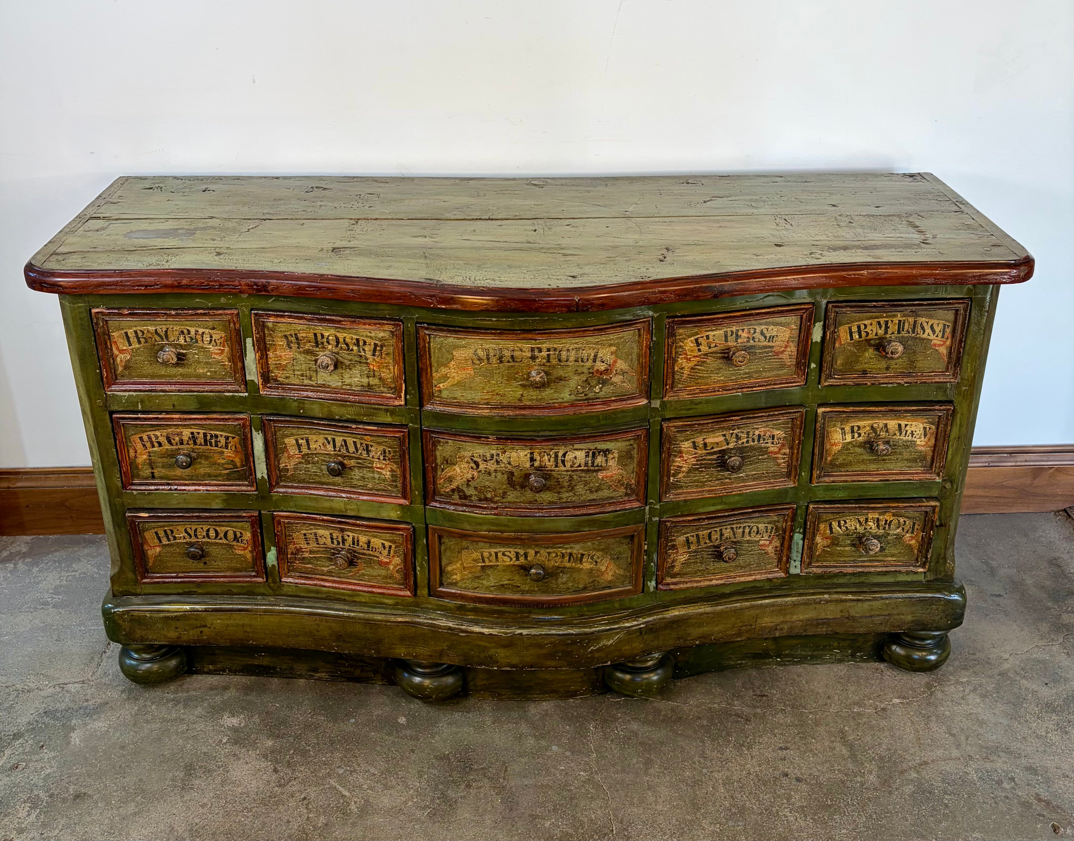 Large Rustic Cabinet, Twelve-Drawer, One Center Cabinet (hidden behind 3 Faux Drawers). Painted in colors of Olive Green and Beige.