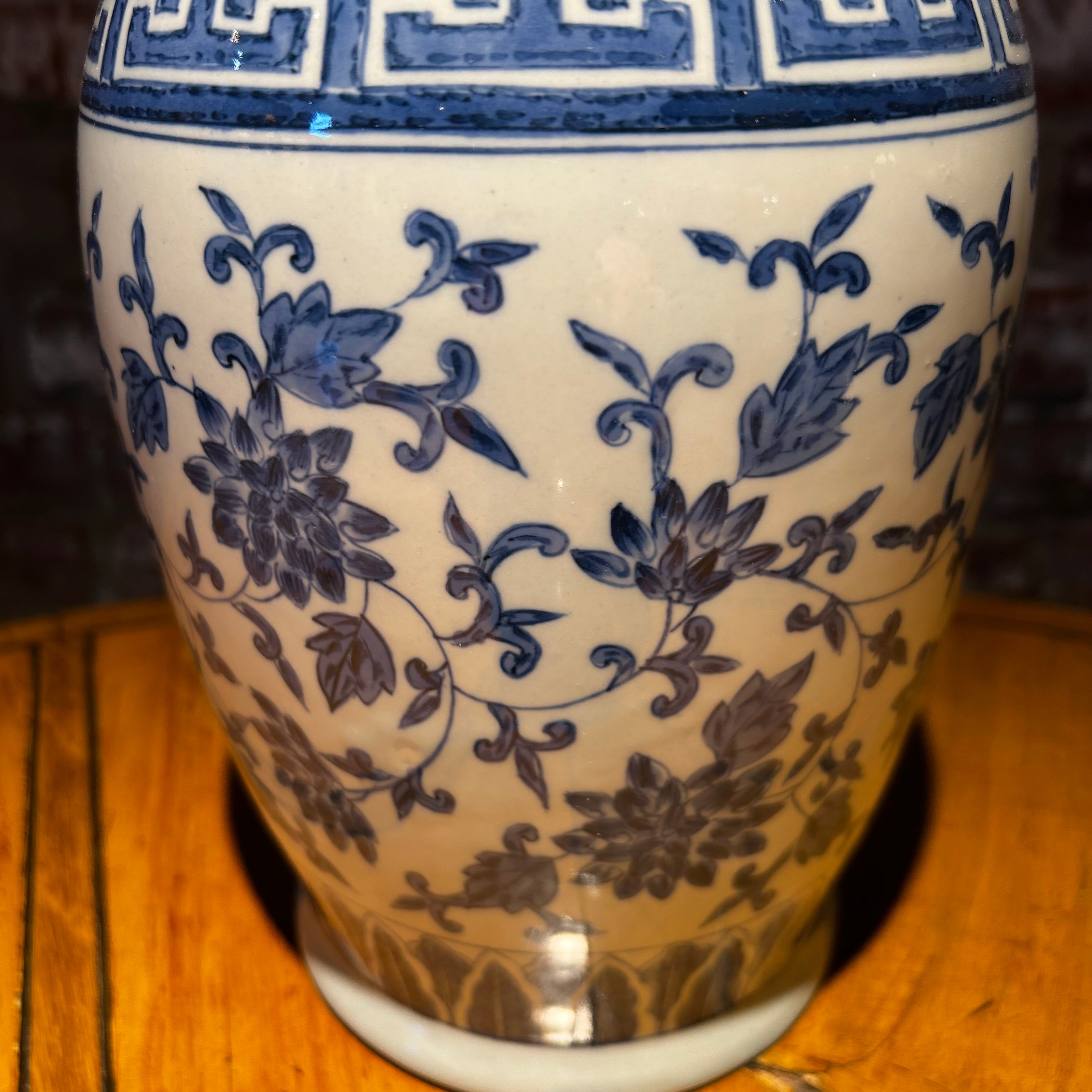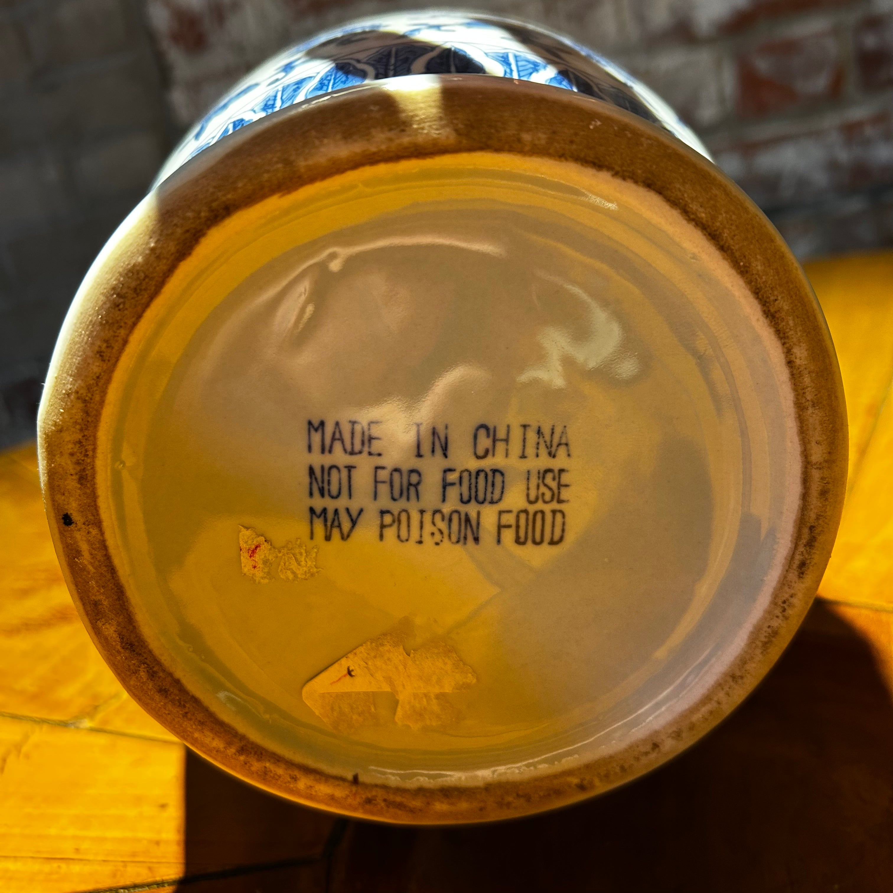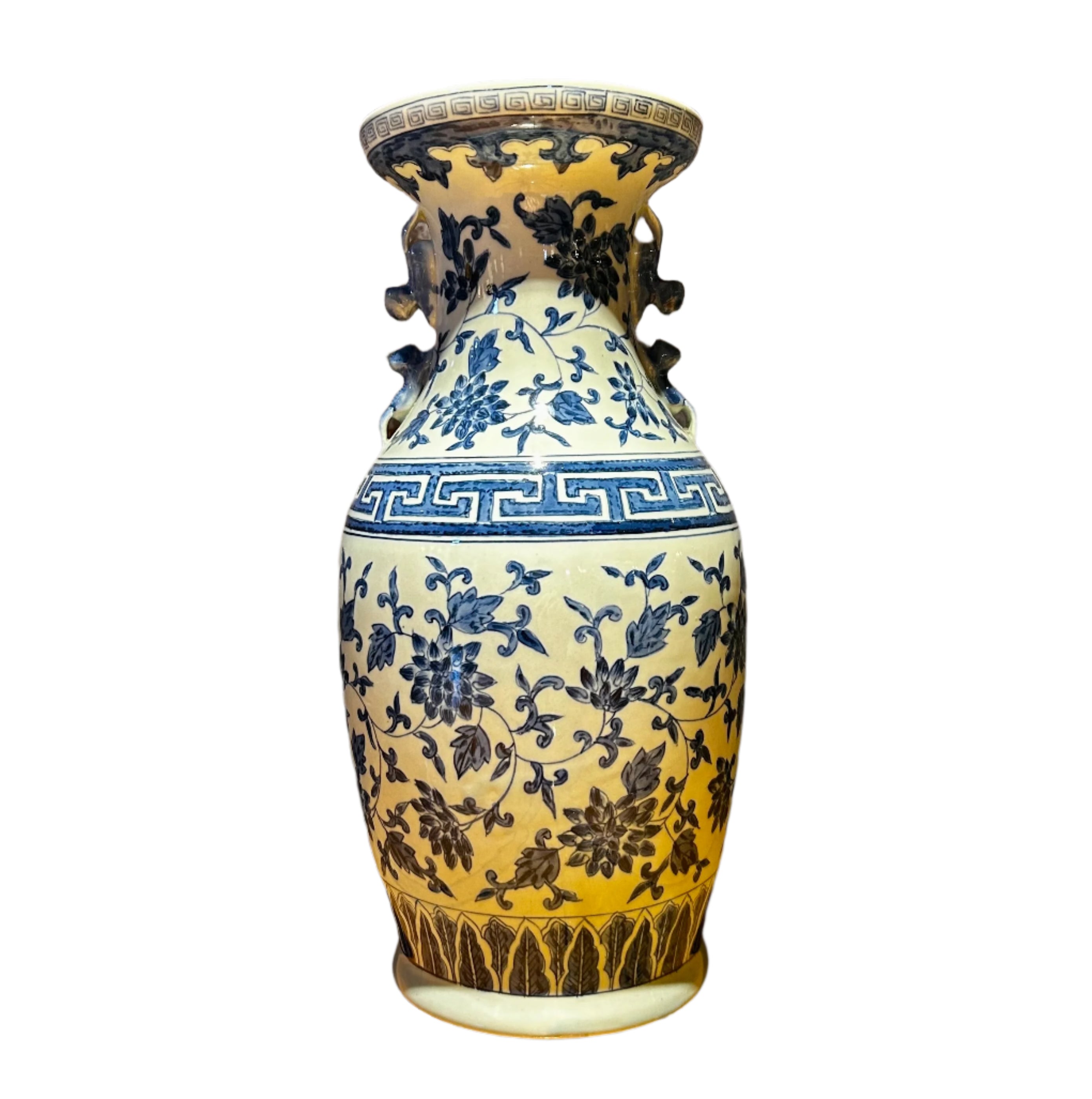 Tall porcelain vase, white background with blue flowers. Made in China.