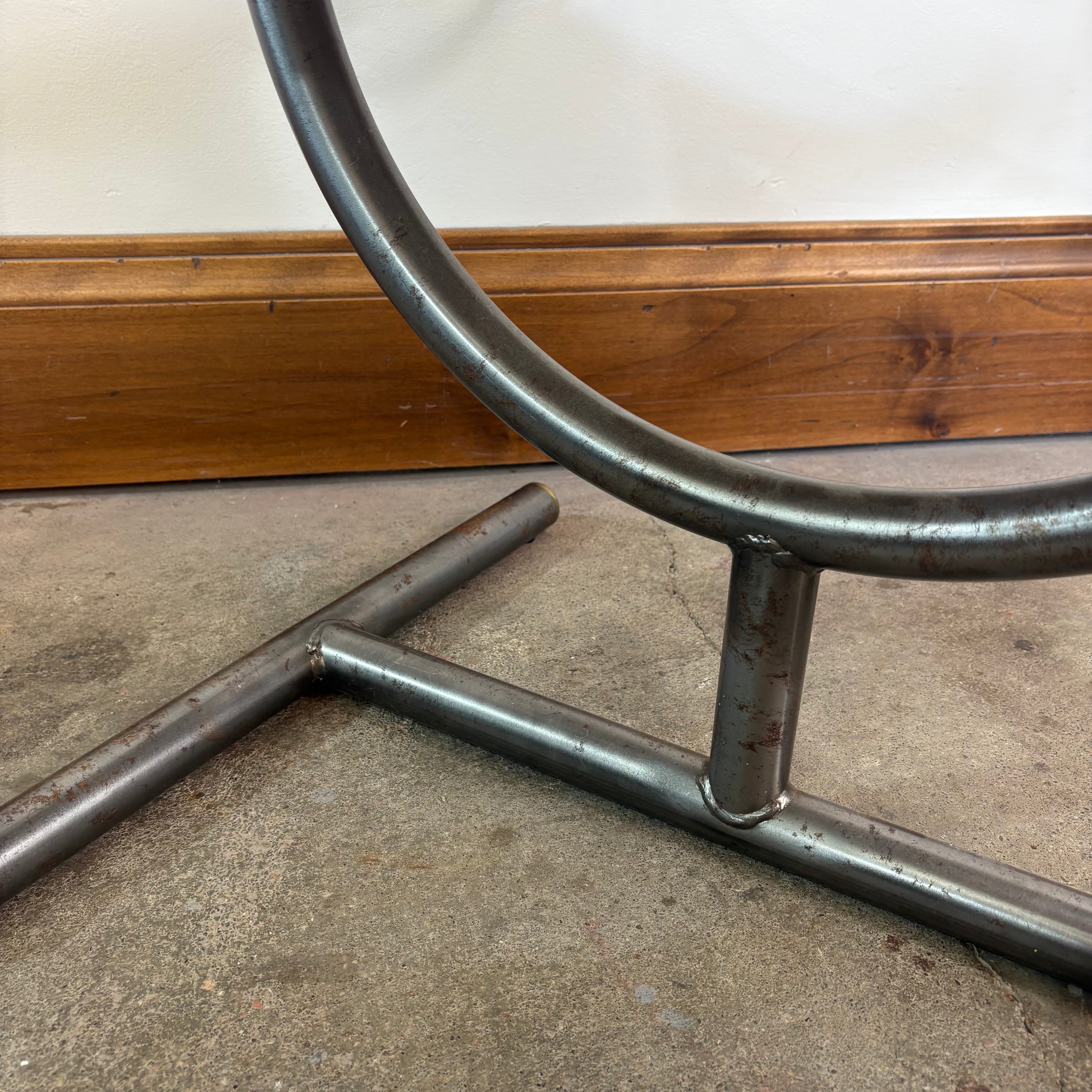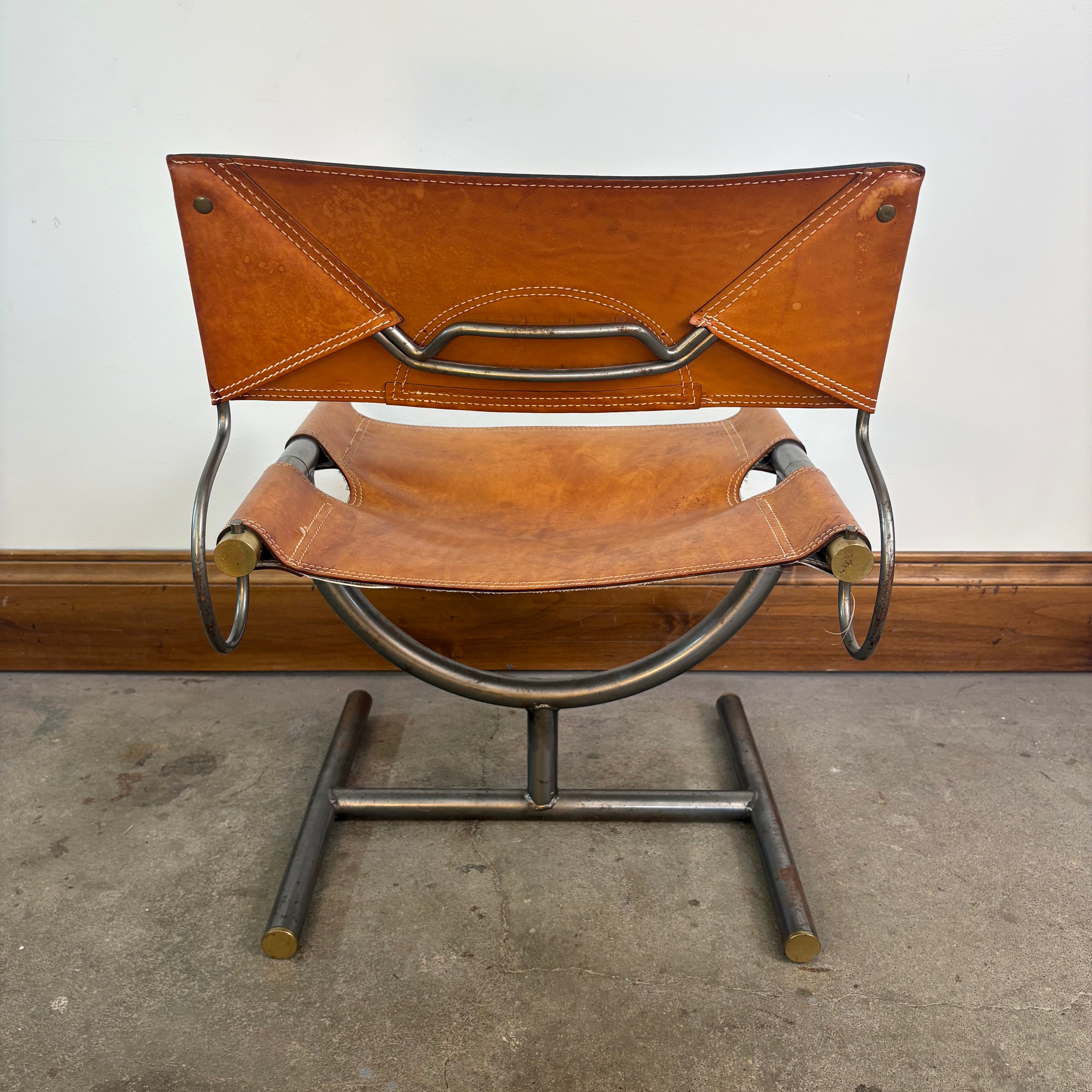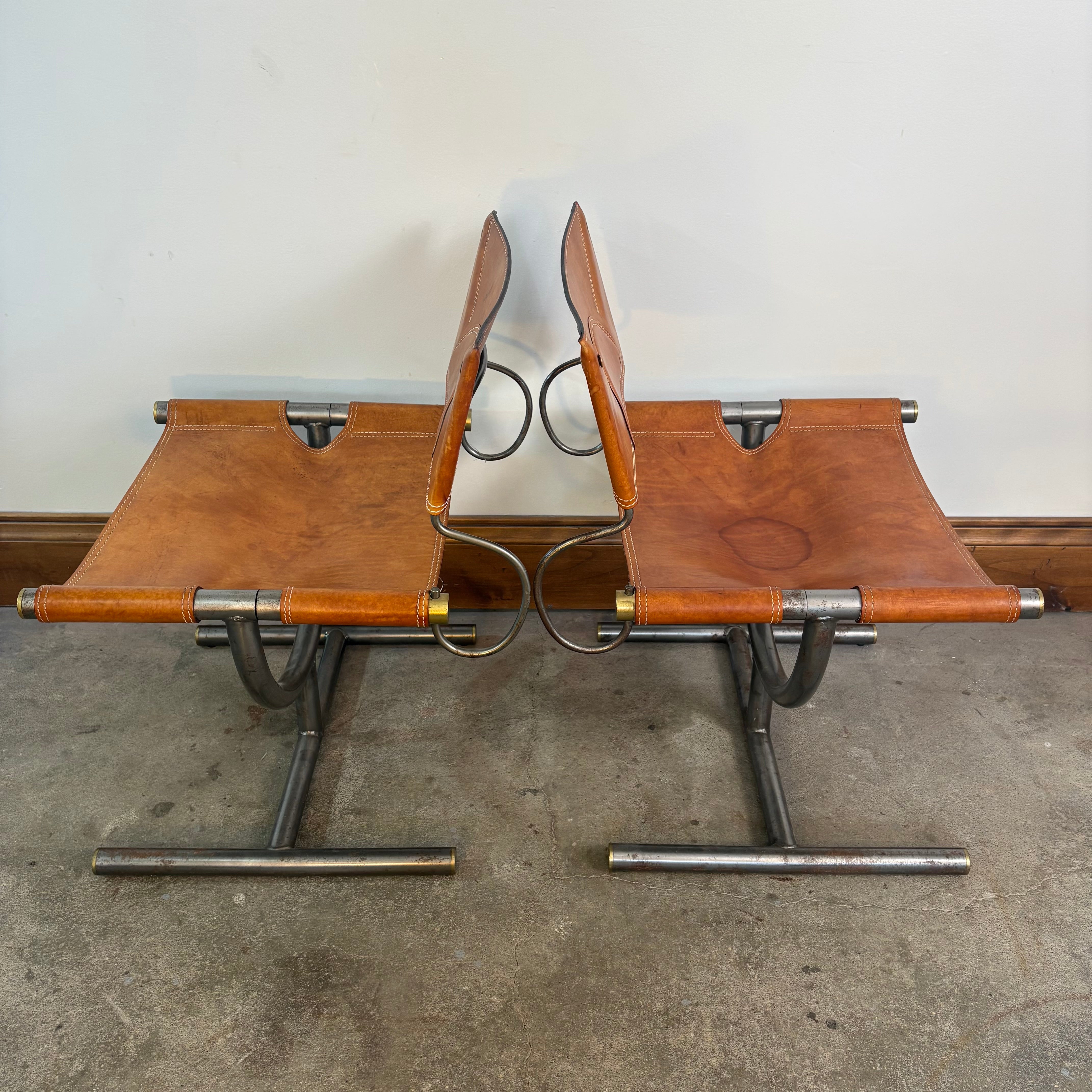 These chairs are thought to be designed by Afra and Tobia Scarpa for Benetton Stores in Leather and Steel with Brass Detail. Sold as a Pair but Will Separated.