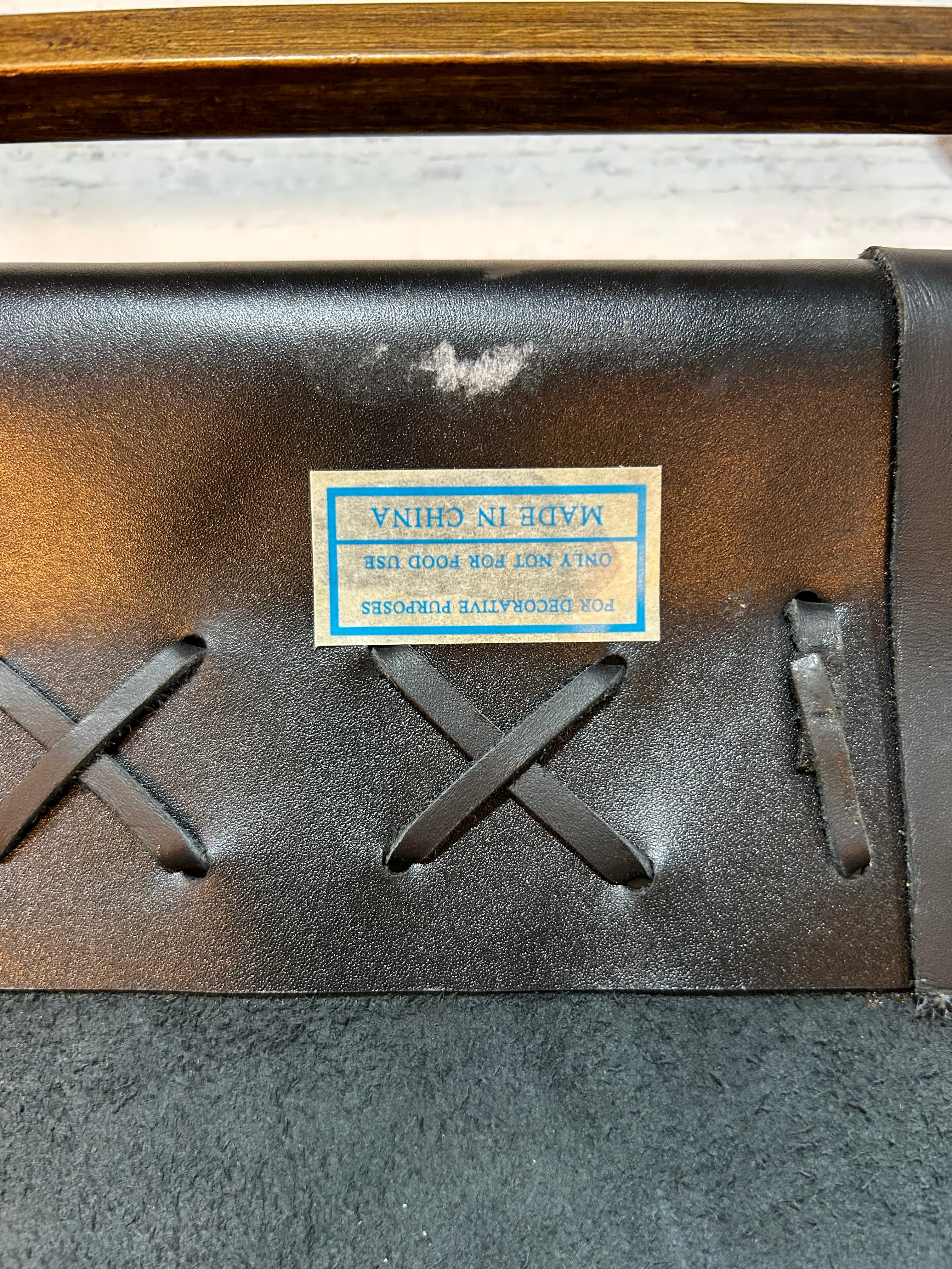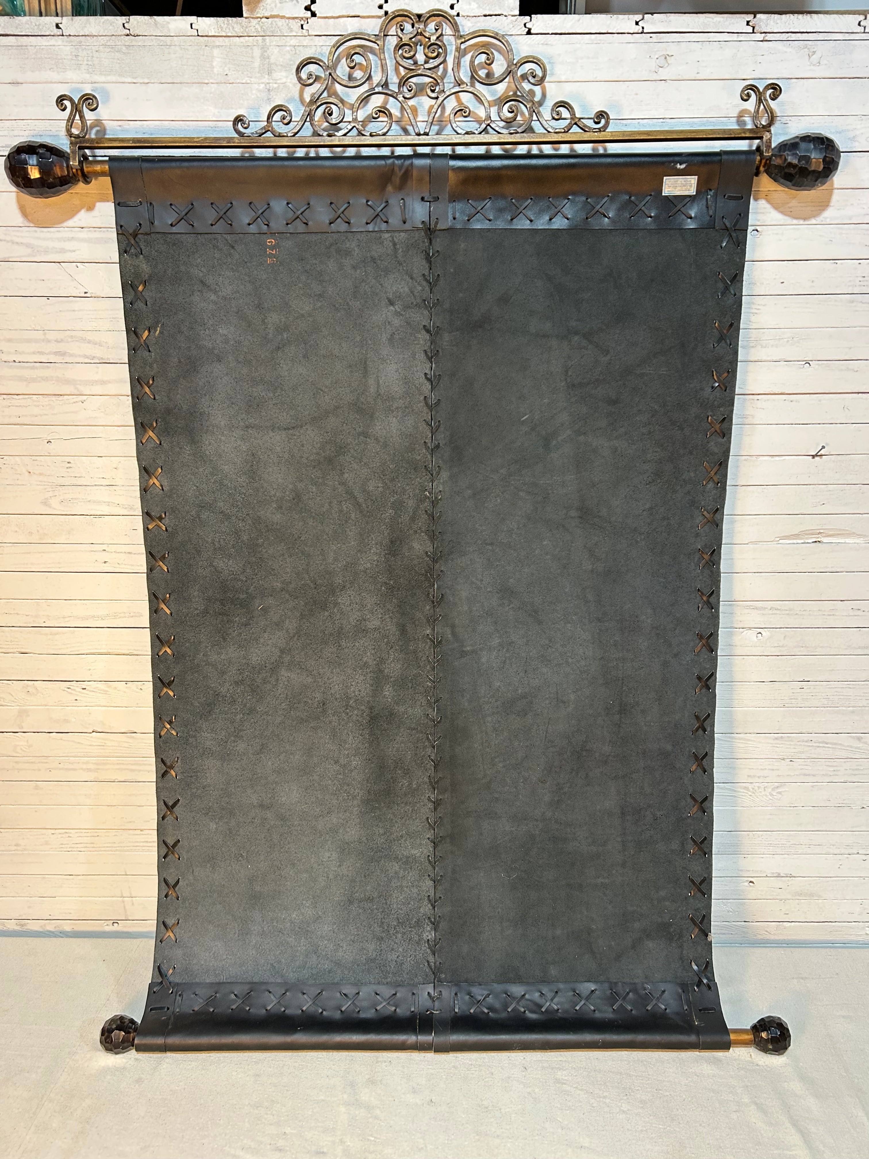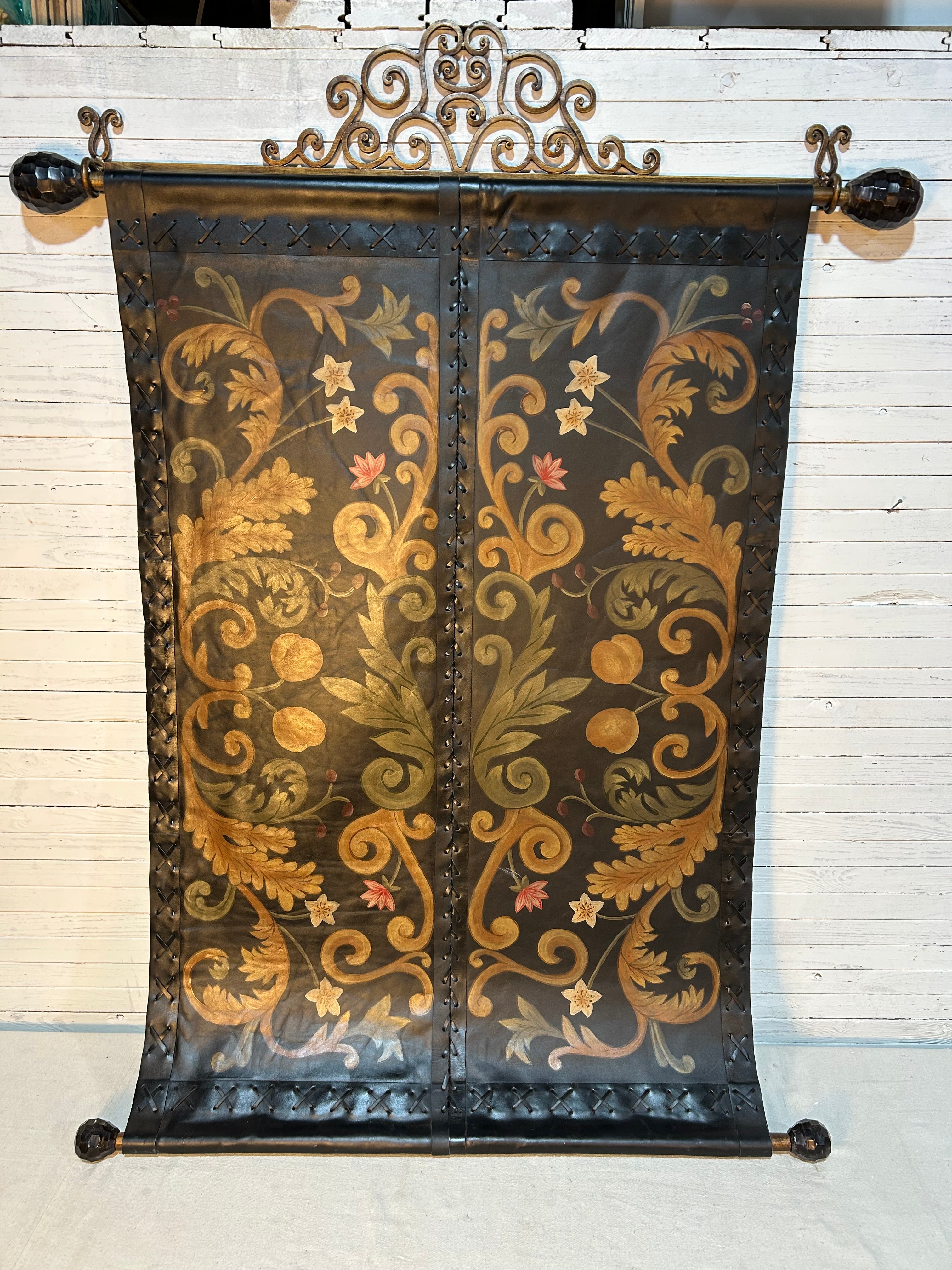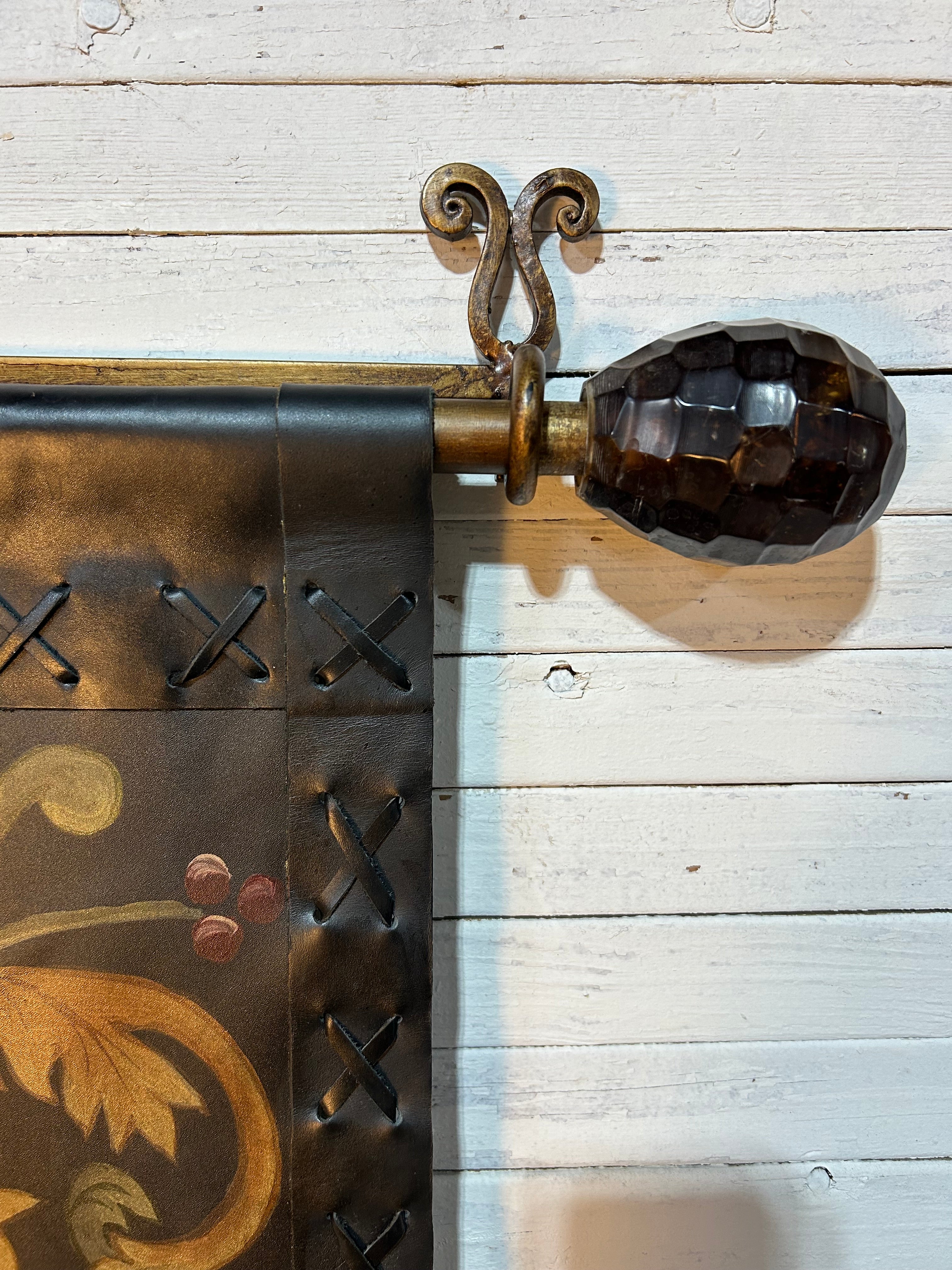 Leather wall hanging, hand painted floral images with metal hardware. Leather panels have whip stitching.