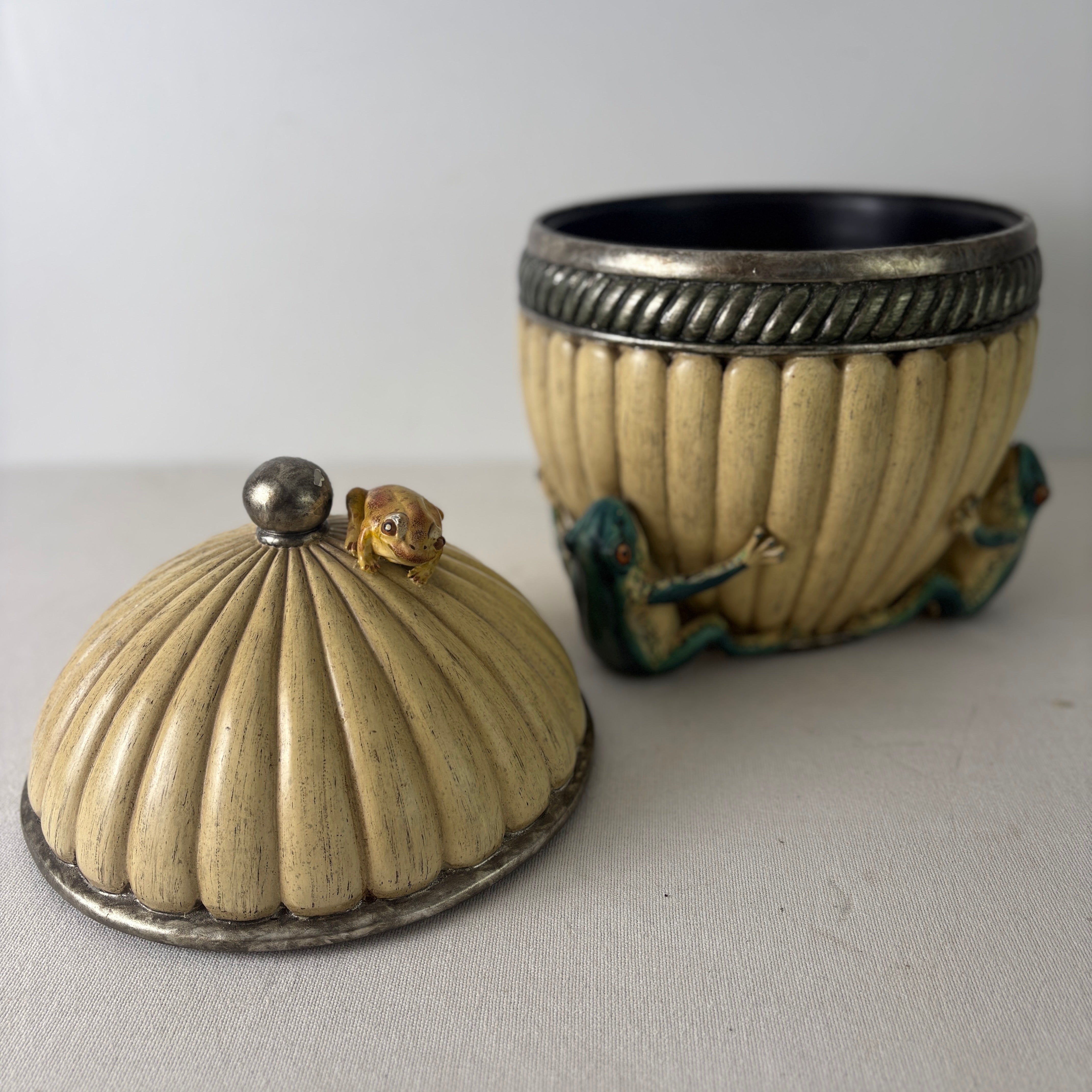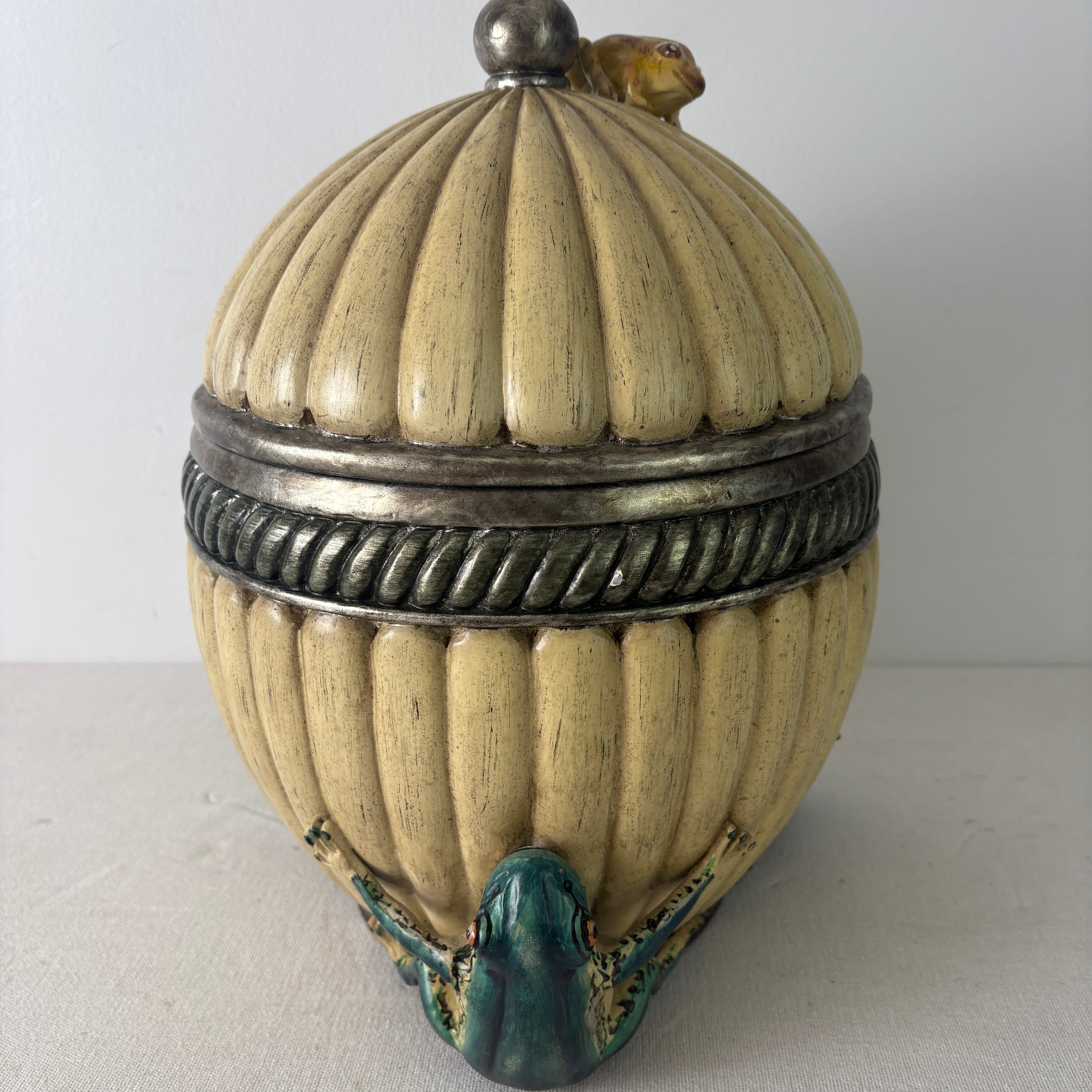 Lidded Vessel, Fluted Detail with Four Frogs, Constructed of Resin. In colors of cream, beige, silver, green.
