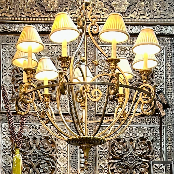 Maitland Smith Chandelier, Nine Arms, Brass, Gun Metal Iron, Ornate