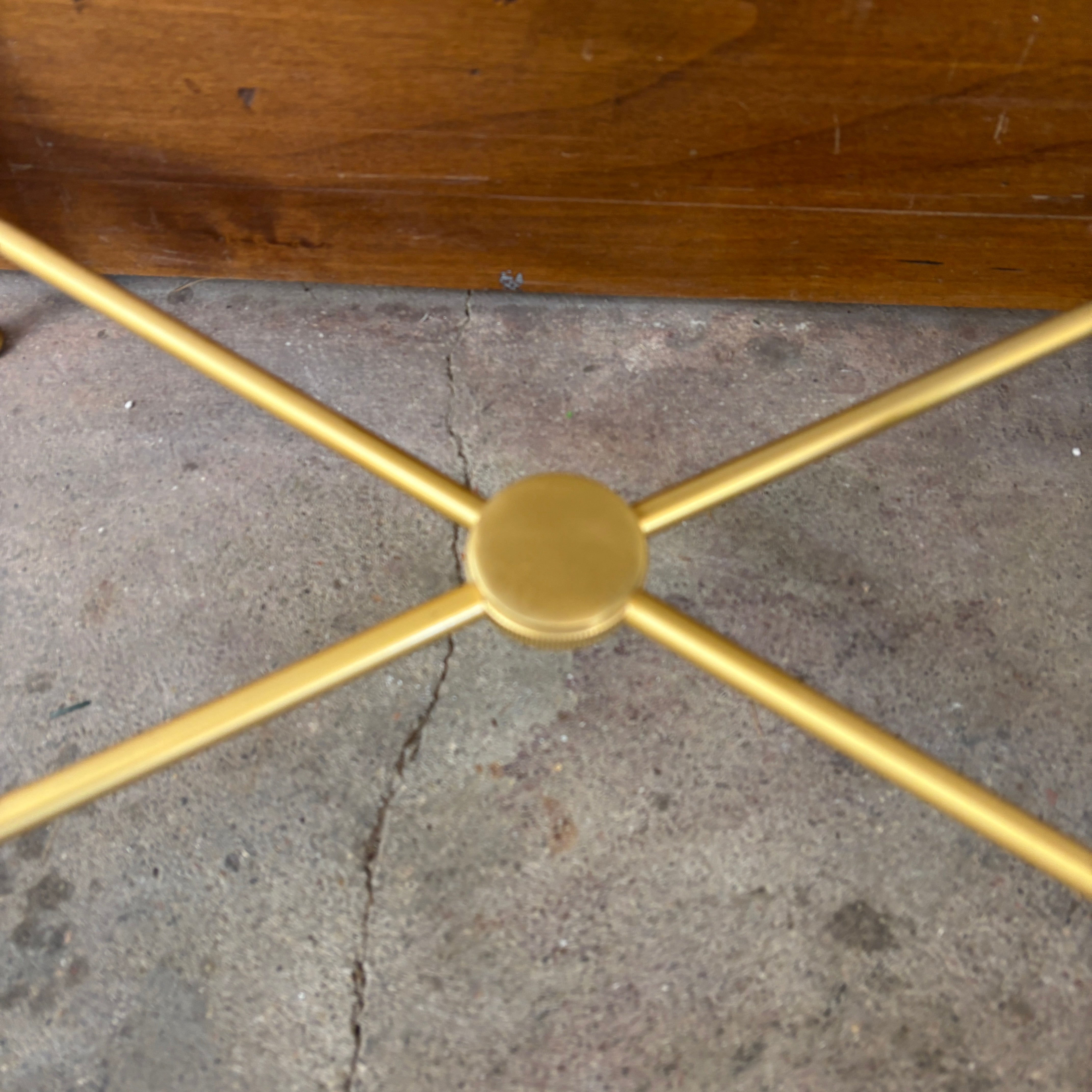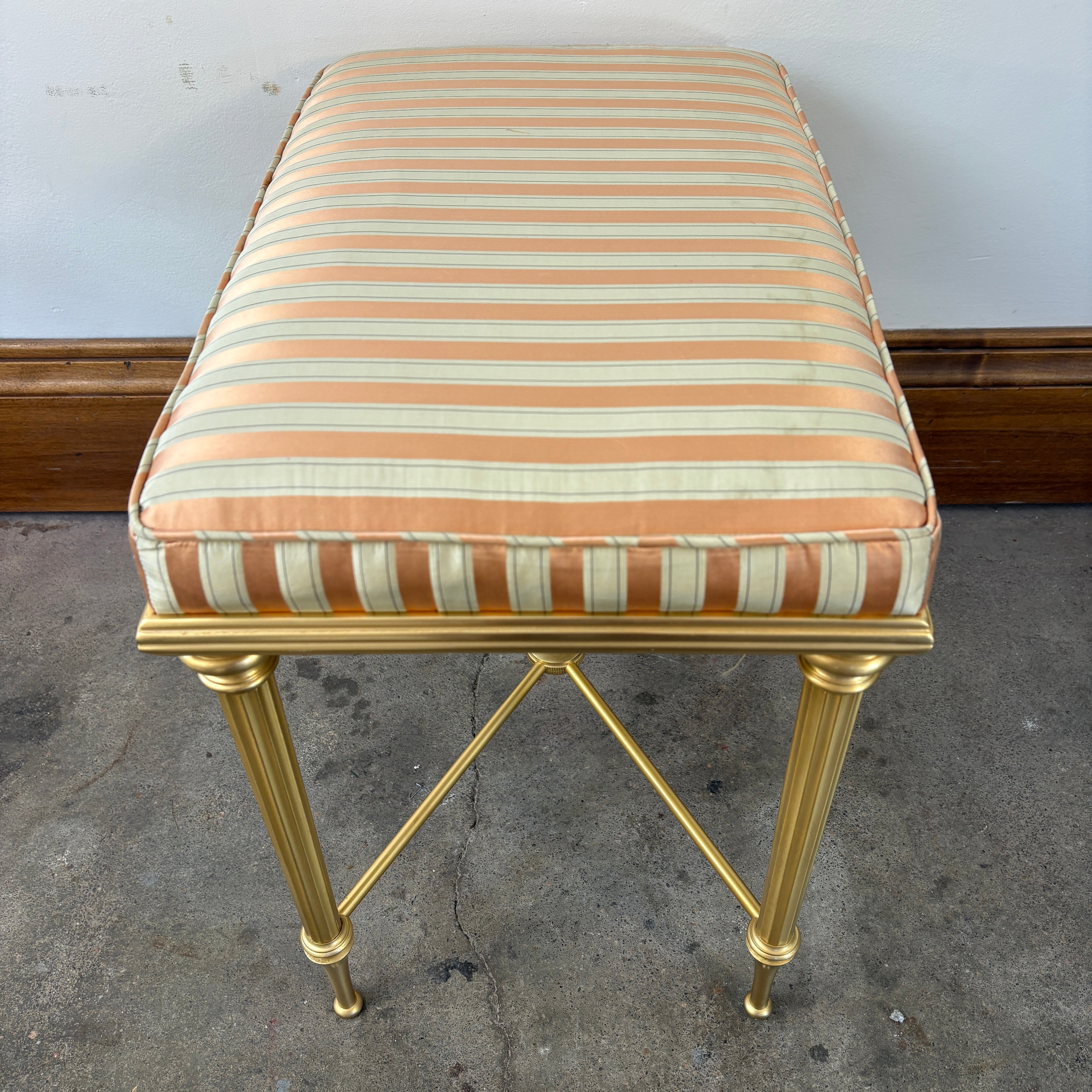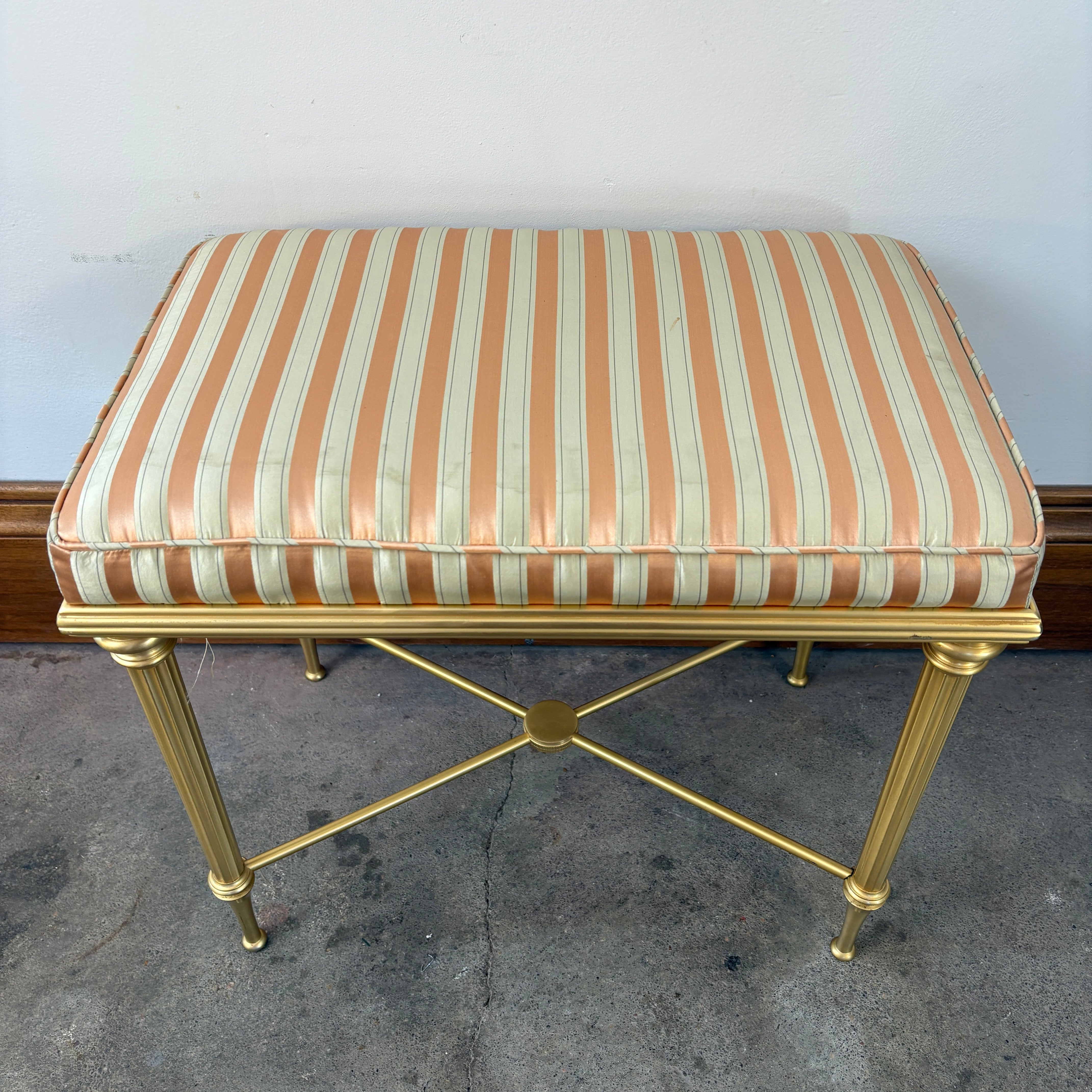 Matte Brass X Base Bench, Silk Stripe, Peach & Ivory. Perfect as a vanity bench.