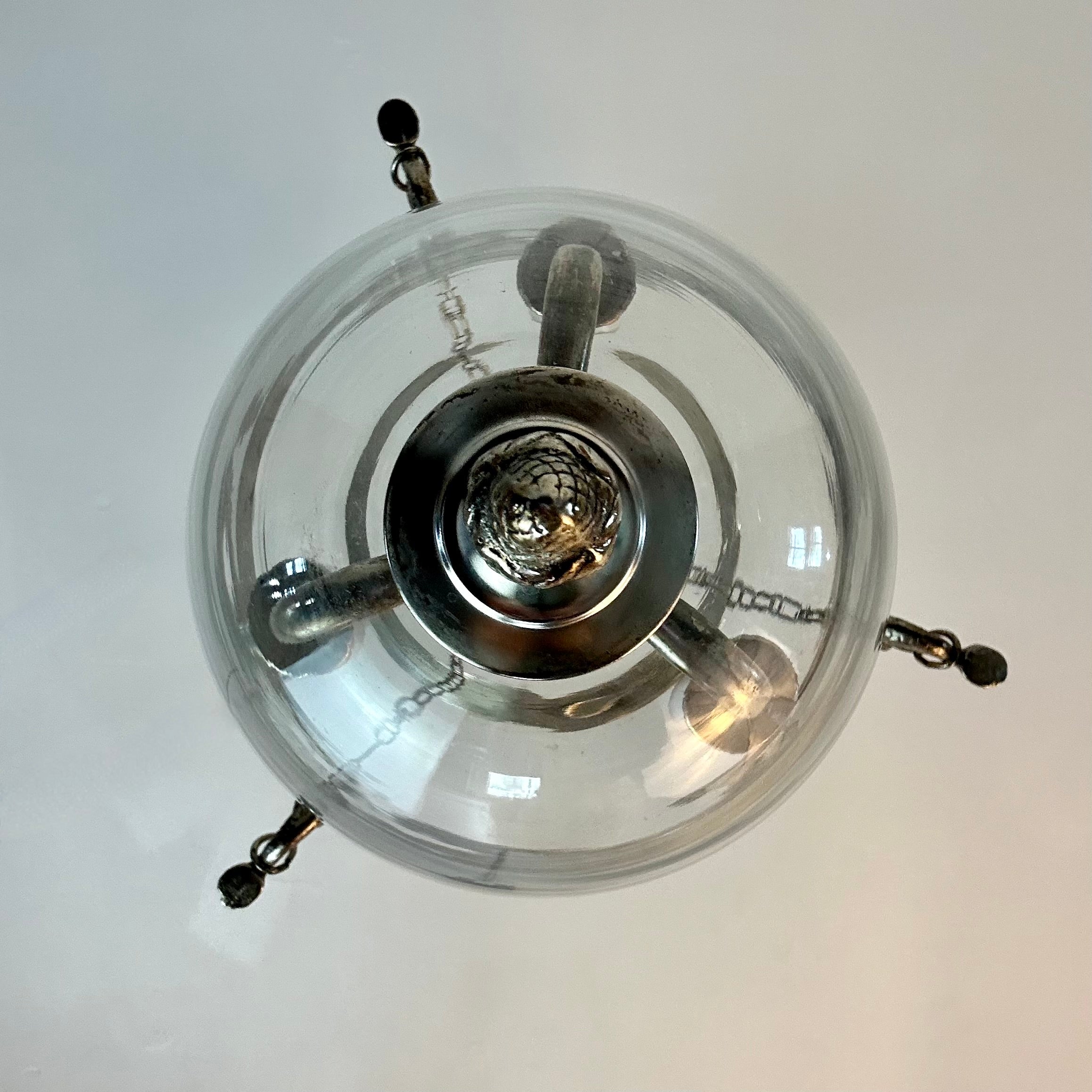 McLean Lighting Works glass and silver reverse hurricane dome hanging light with three small base candle sticks.